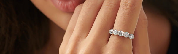 Half eternity rings have the beauty of full eternity rings on the top, while making resizing convenient. These rings feature diamonds only on the top half of the band. This also makes half eternity rings a more preferred choice, considering practicality. They are ideal for daily wear and easily stackable with engagement and wedding rings, adorning the finger beautifully with a line of shimmering diamonds.
