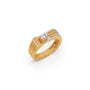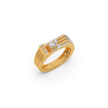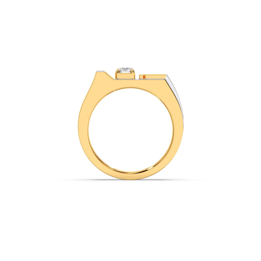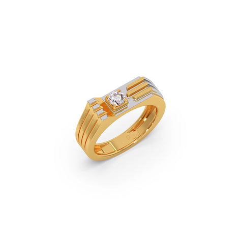 Men's classic ring featuring a brilliant round diamond set in a square, yellow gold bezel. The ring's band is also yellow gold with a distinctive design of three parallel white gold bars on each side, adding a modern, linear detail to the classic style.