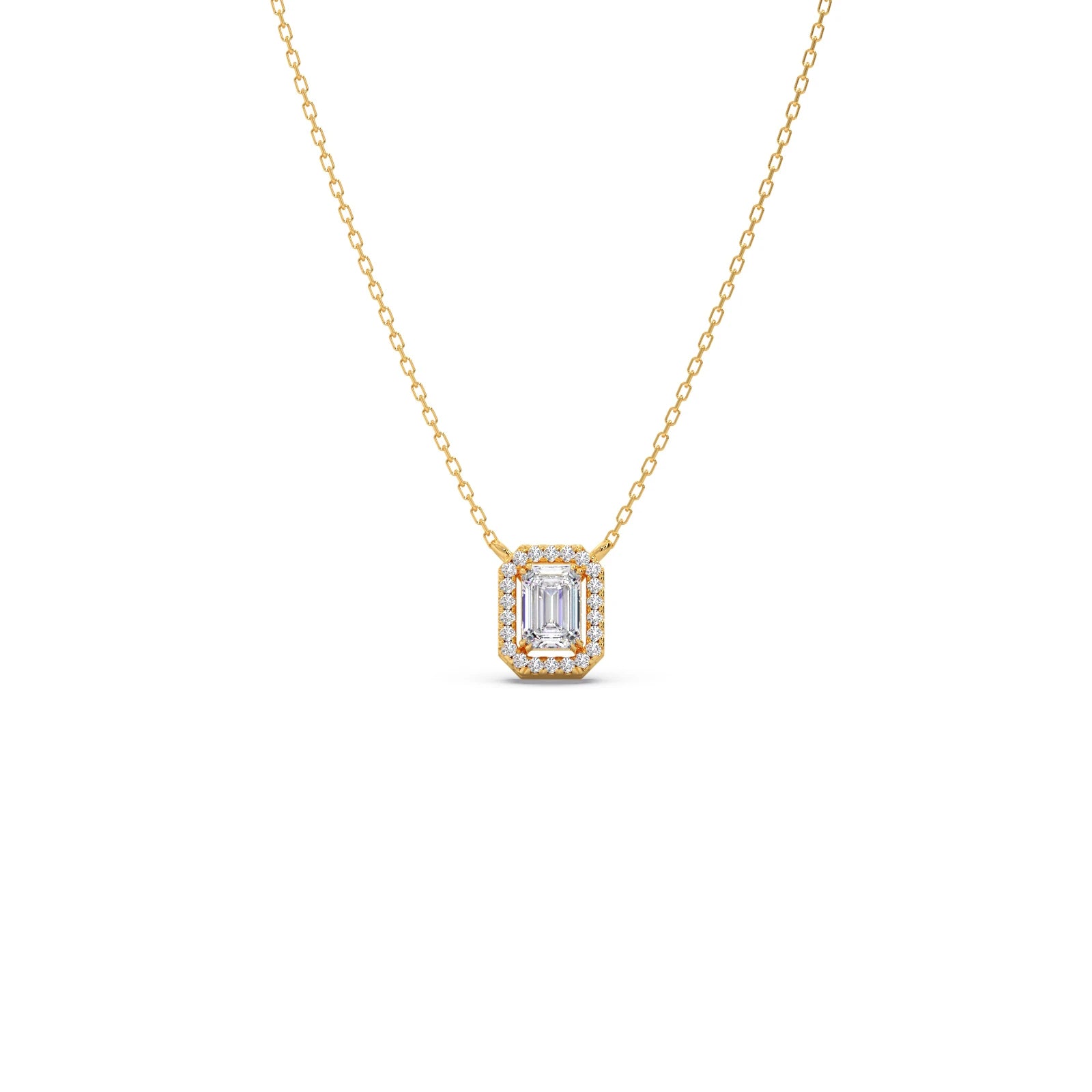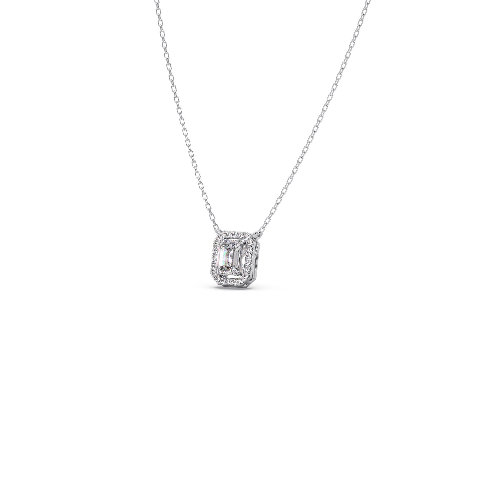 Adorn yourself with understated elegance. This pendant features a beautiful 0.81ct emerald-cut diamond, embraced by a delicate halo of sparkling round diamonds. The classic design and subtle brilliance make it a perfect everyday luxury, adding a touch of refined sparkle to any look.