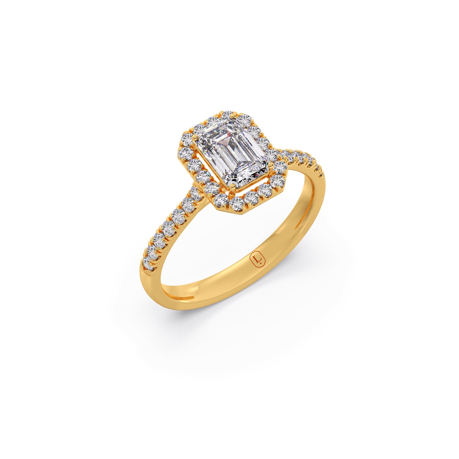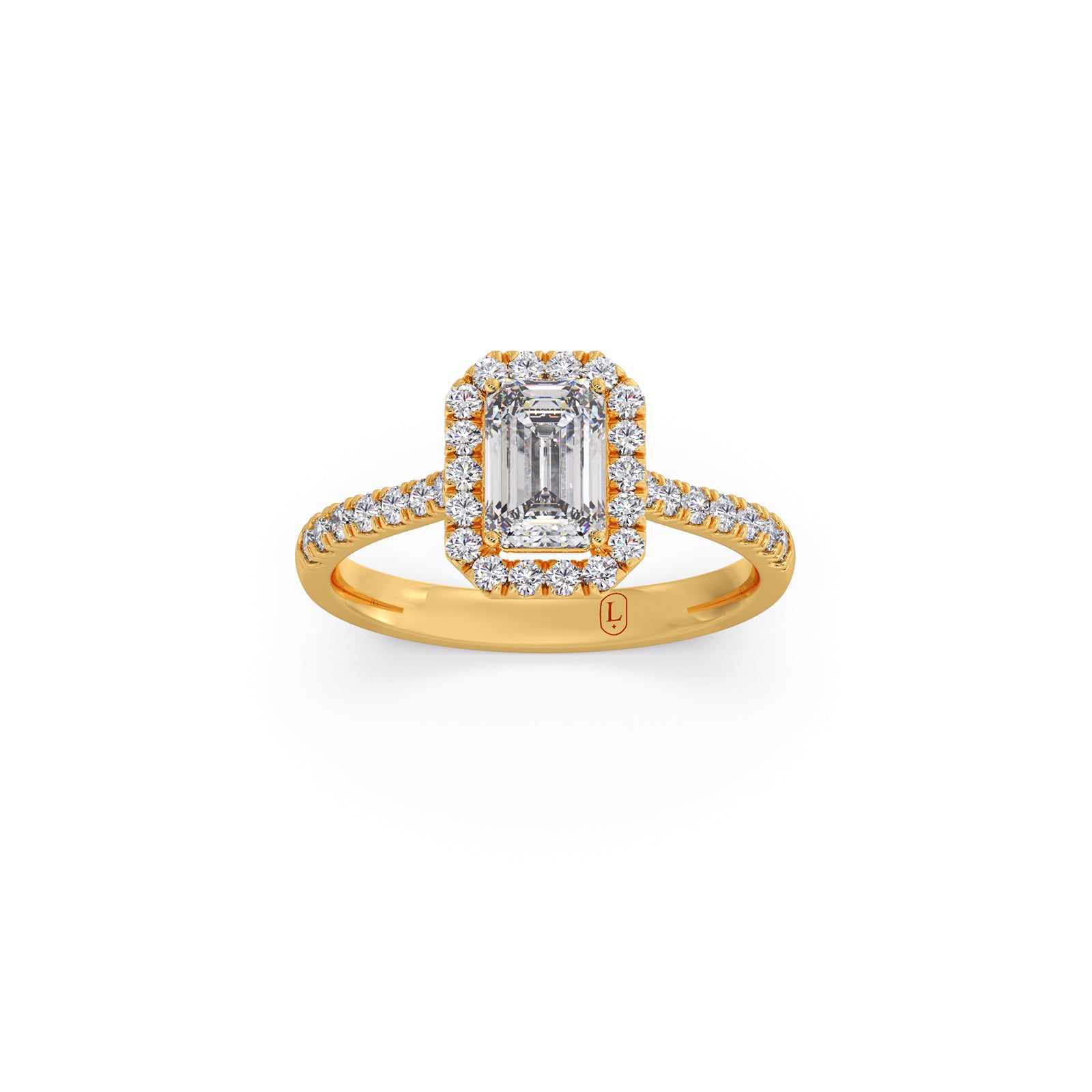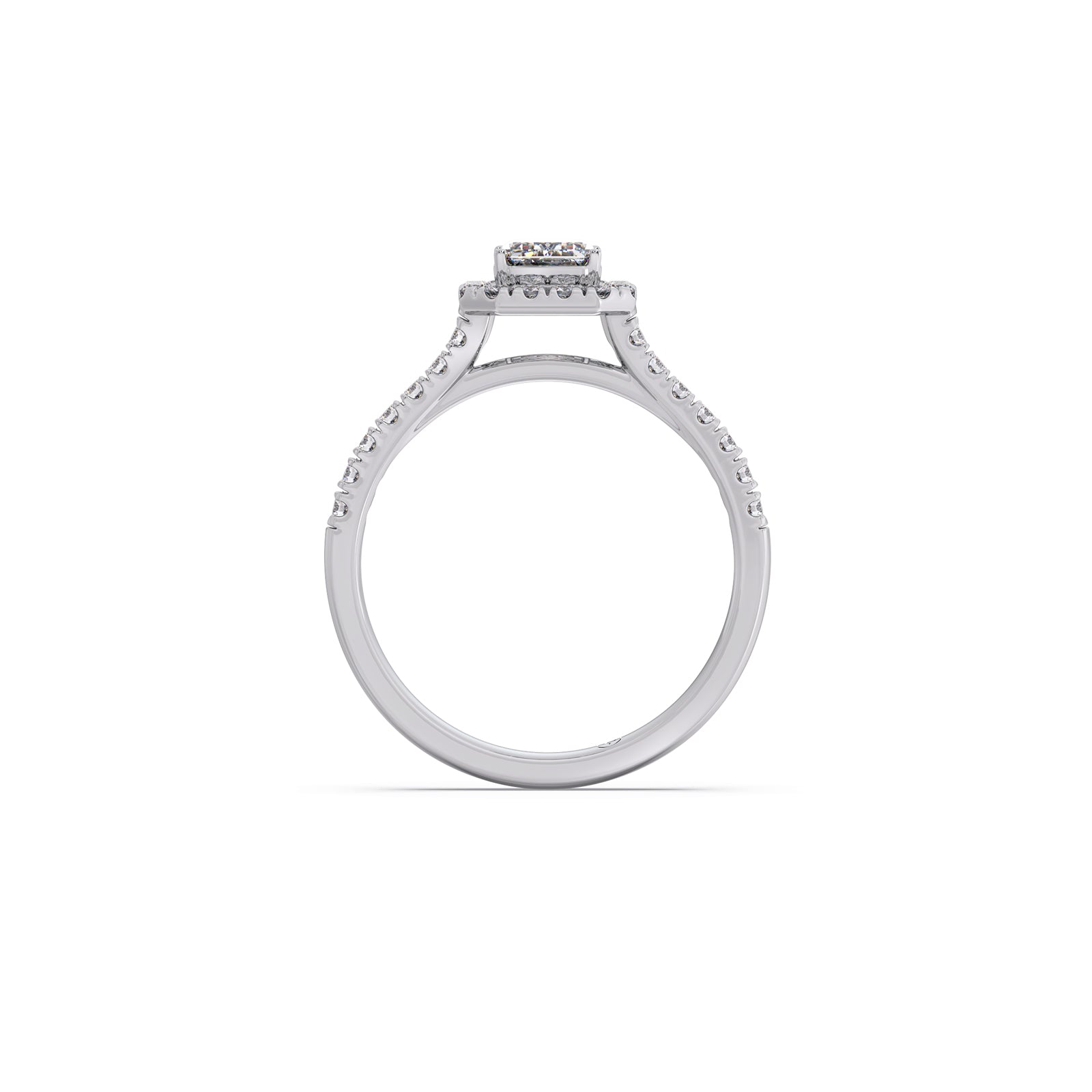 A refined emerald-cut solitaire takes center stage in this regal ring, accented by a graceful row of round brilliant diamonds. Its clean lines, radiant sparkle, and timeless elegance create a sophisticated statement piece designed to captivate from every angle.