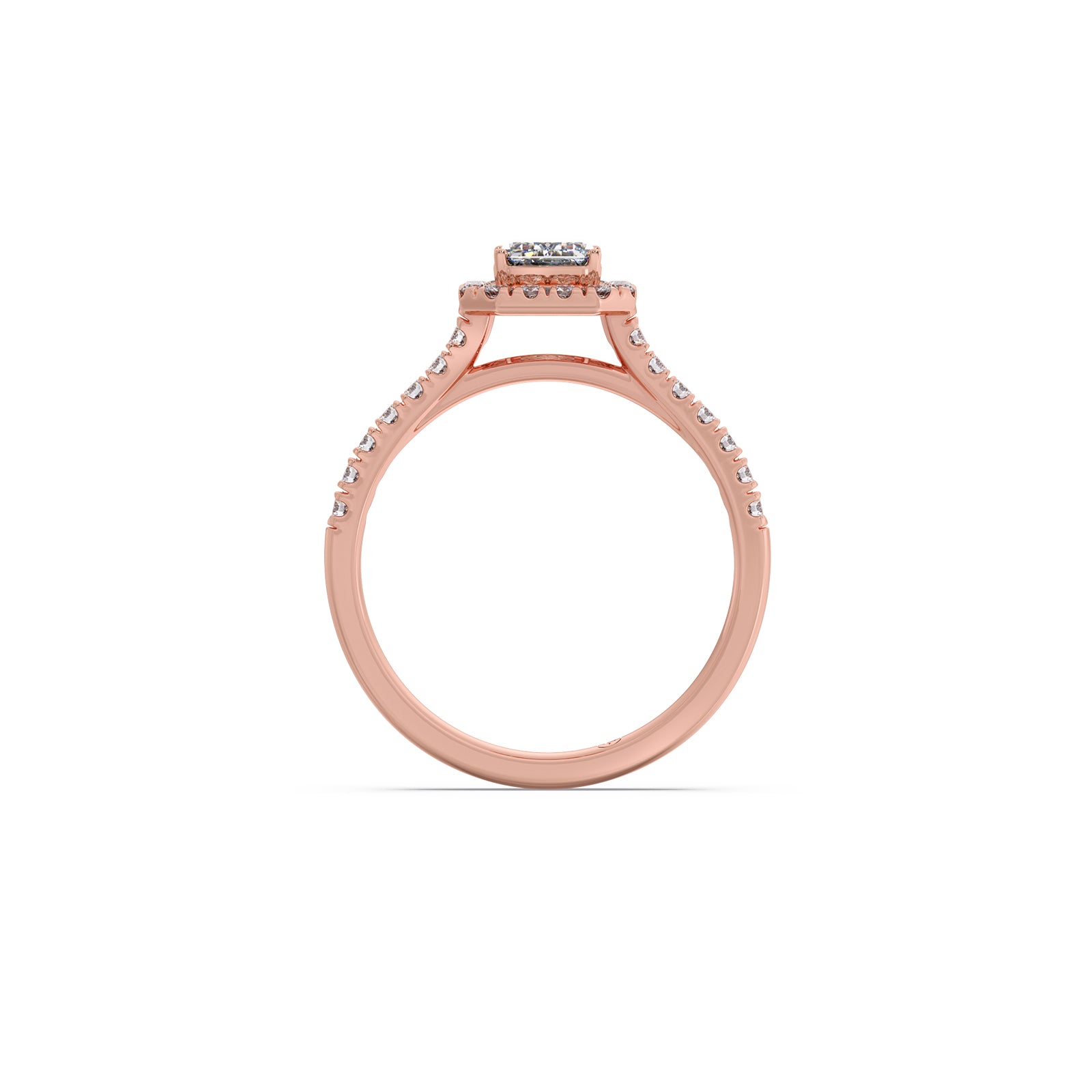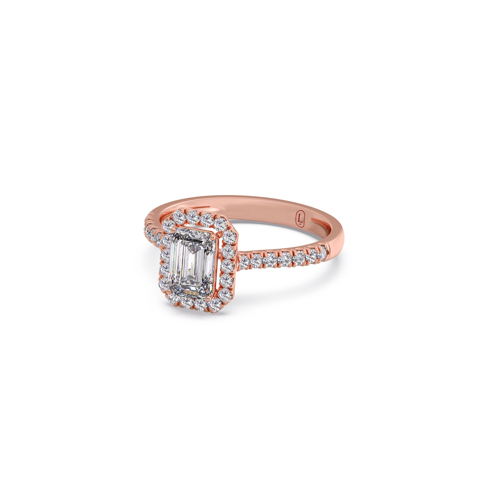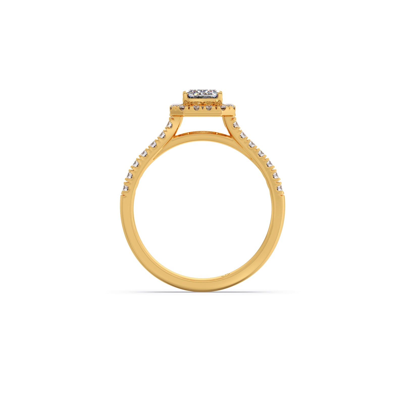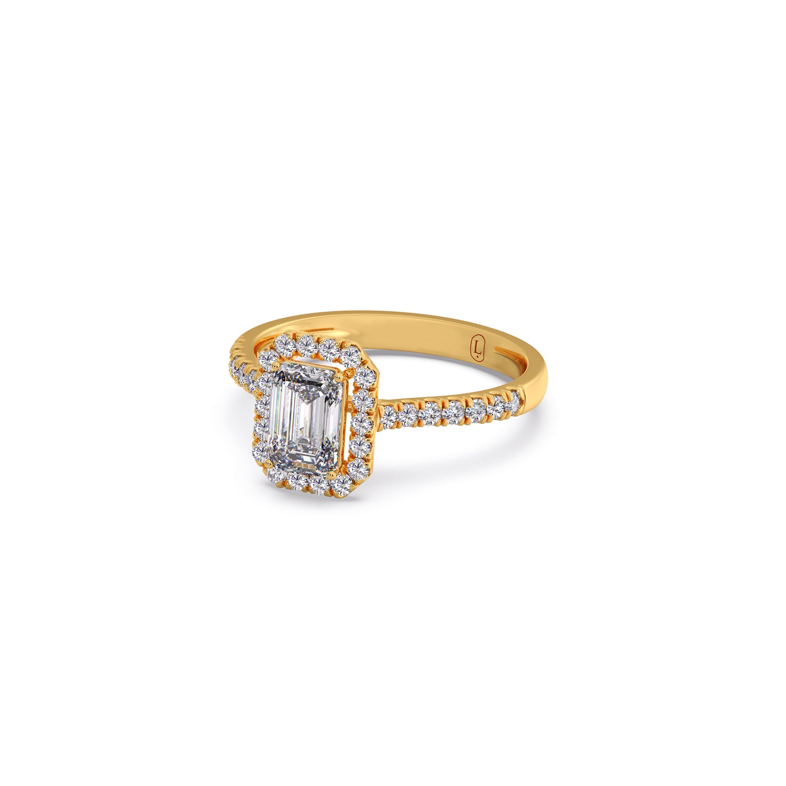 A refined emerald-cut solitaire takes center stage in this regal ring, accented by a graceful row of round brilliant diamonds. Its clean lines, radiant sparkle, and timeless elegance create a sophisticated statement piece designed to captivate from every angle.