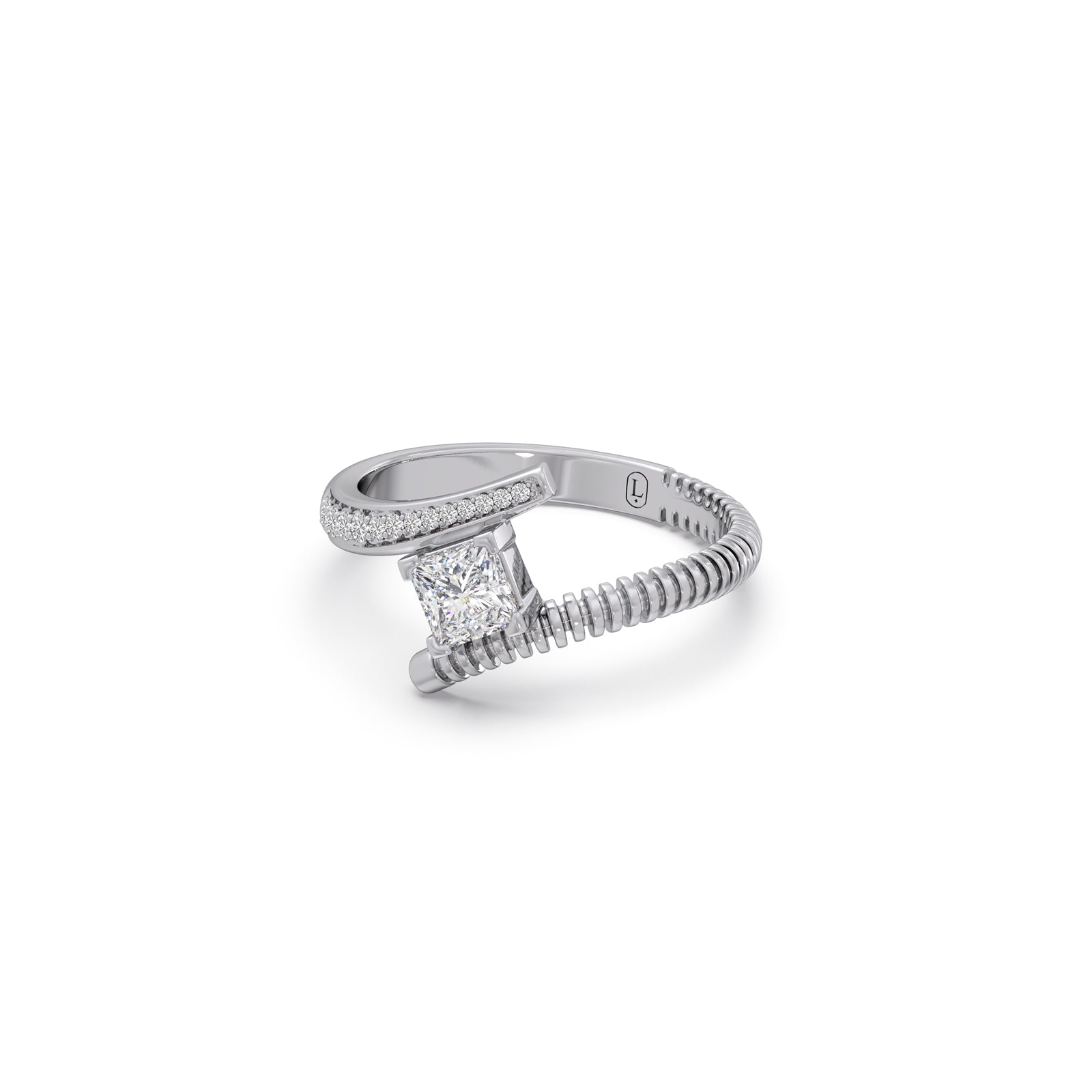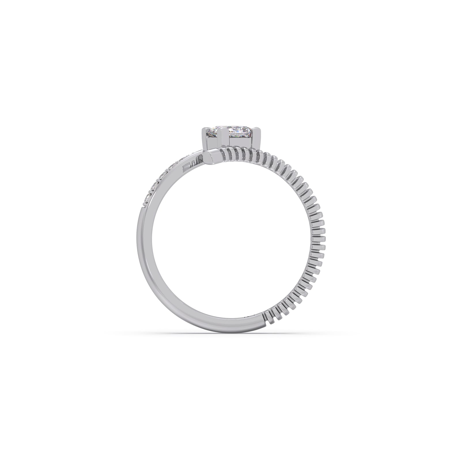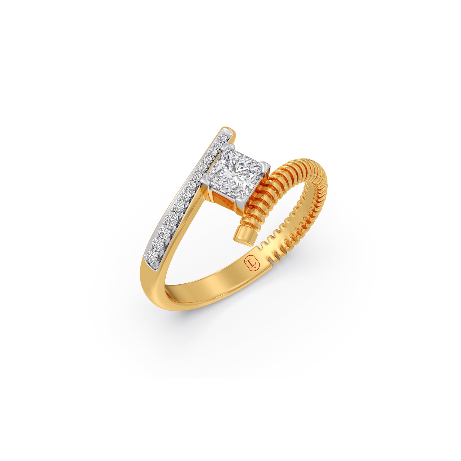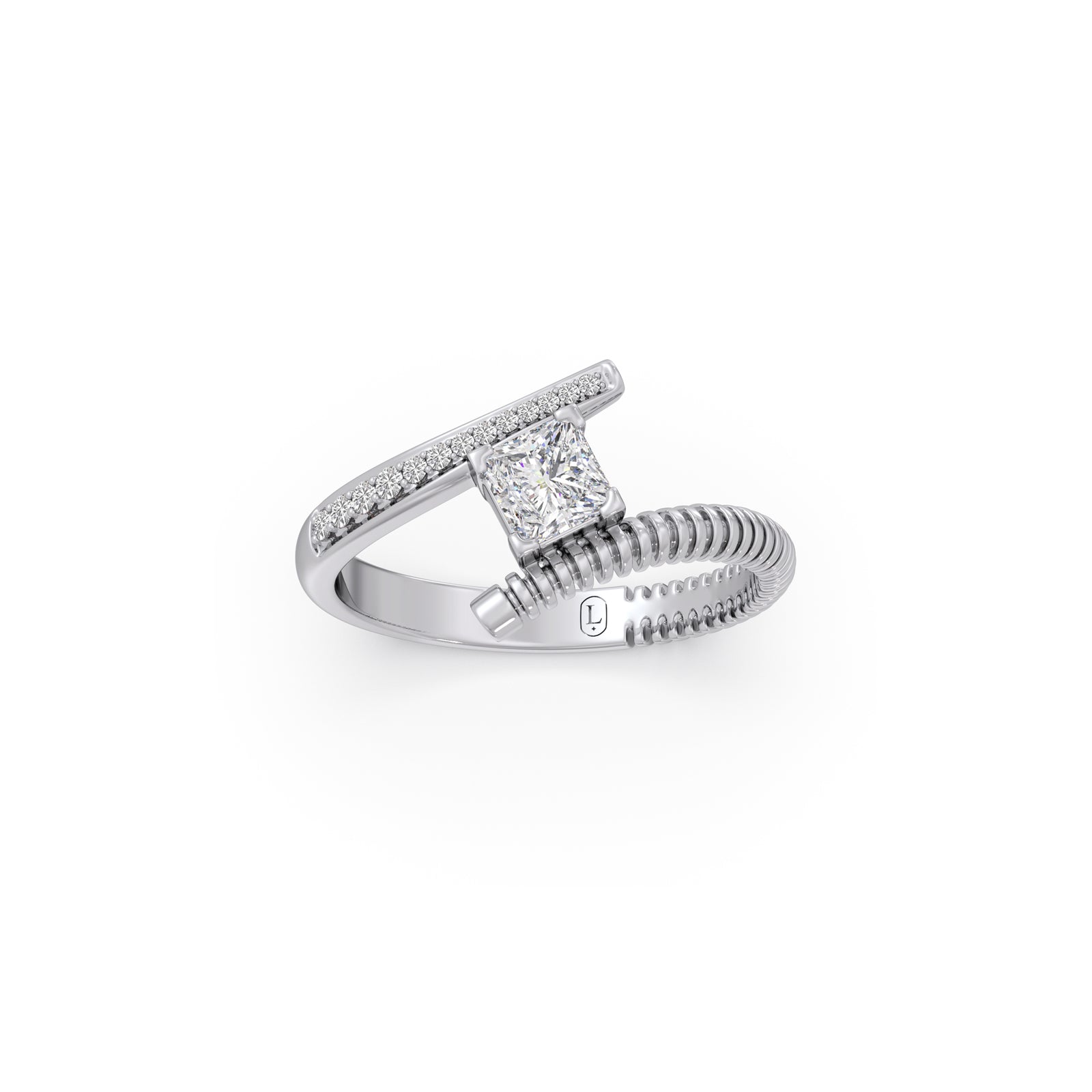 This ring features a gear-like ribbed textured bypass ring. A 0.515ct Classic Princess-cut Solitaire in center, bypassed by shank set in prong-set round diamonds. It offers luxury perfect for everyday wear or special occasions. A versatile and cherished piece, reflecting enduring beauty.