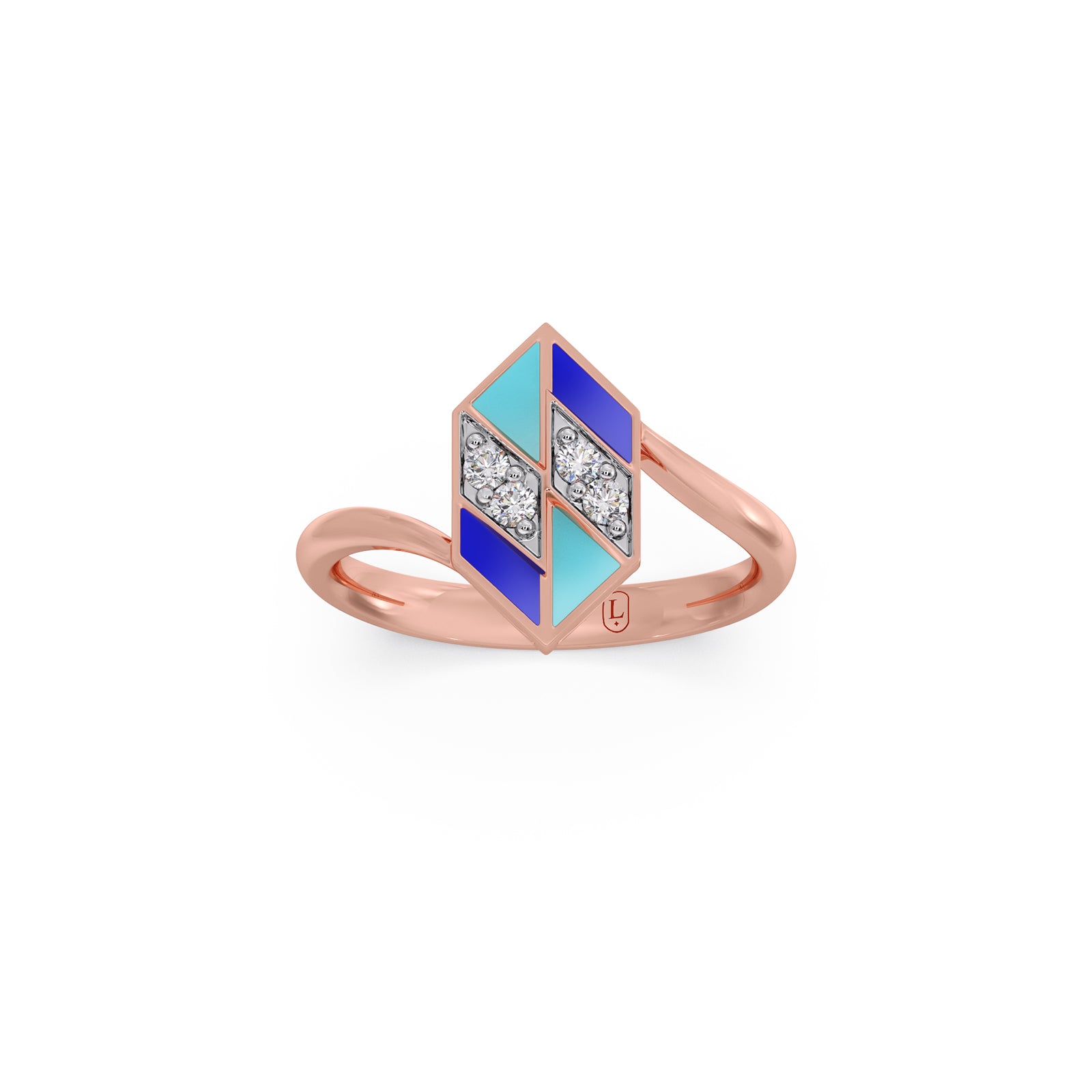 This Azure Hexa Diamond Ring highlighted by rich blue and turquoise enamel panels, beautifully contrasted with sparkling round diamond accents. The high-polish gold setting enhances the depth of color and adds a luxurious, eye-catching finish. The geometric arrangement and smooth enamel surface give the piece a refined artistic character, ideal for elevating both everyday and special looks.