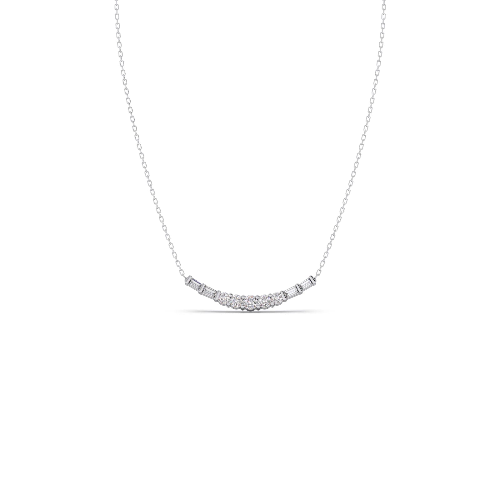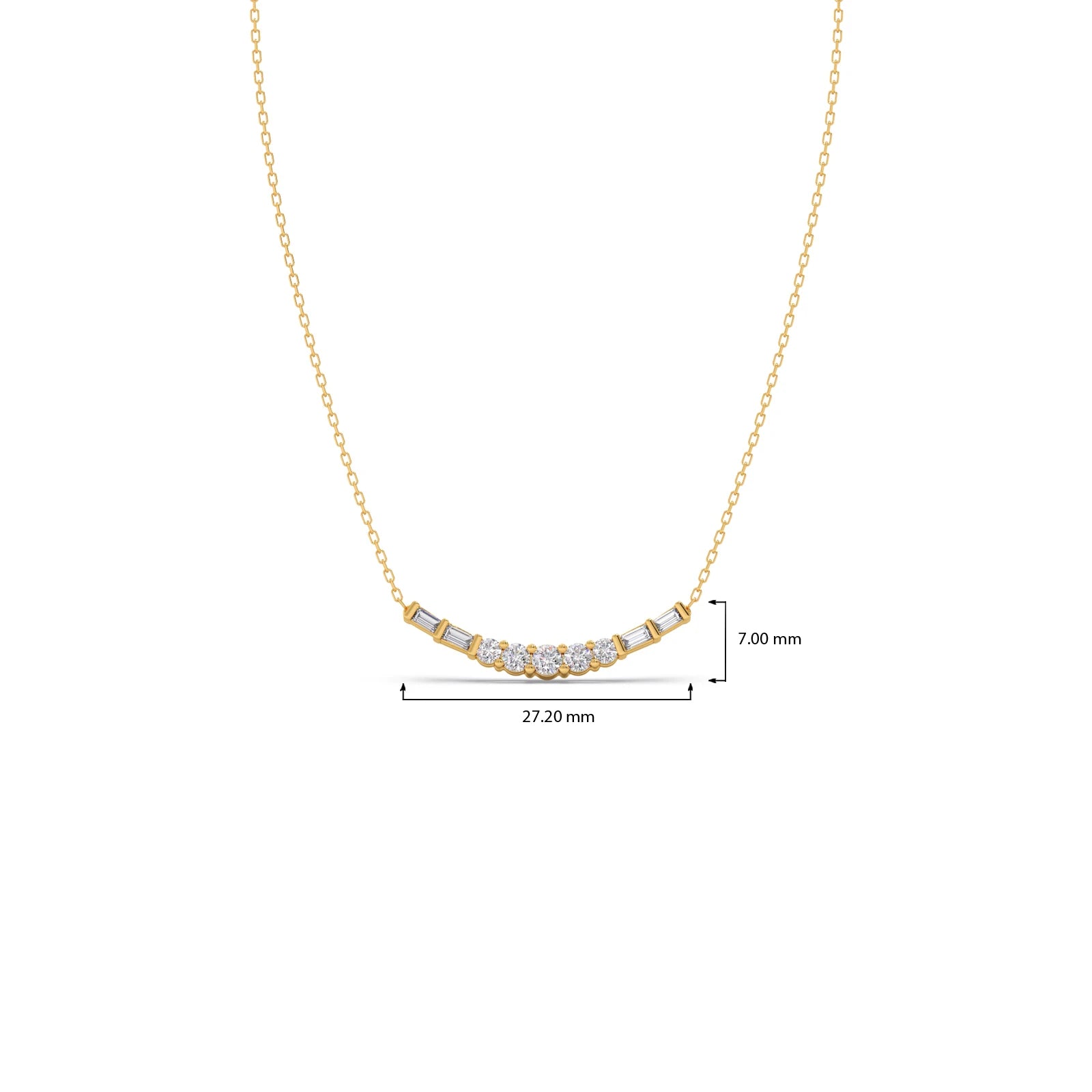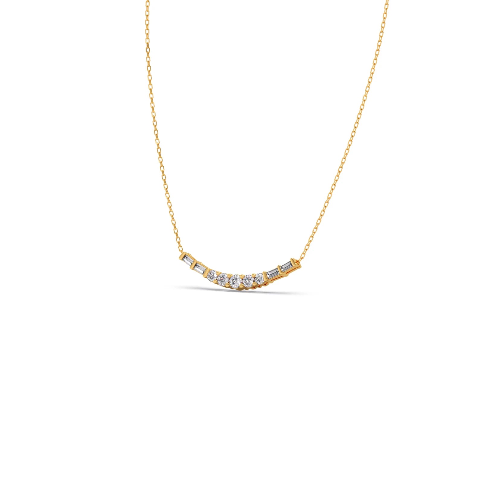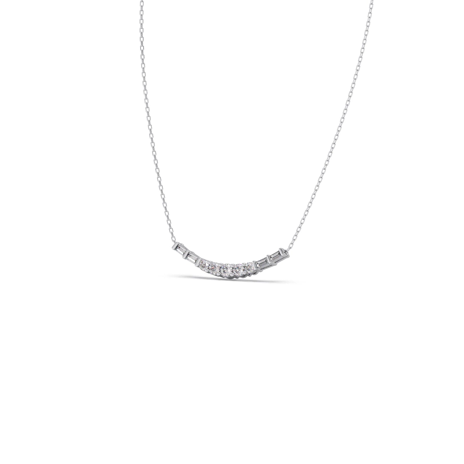 This chic necklace features a sleek bar adorned with a sophisticated combination of baguette and round-cut diamonds. The linear arrangement of the baguette cuts contrasts beautifully with the brilliant sparkle of the round diamonds, creating a modern and elegant statement piece.
