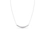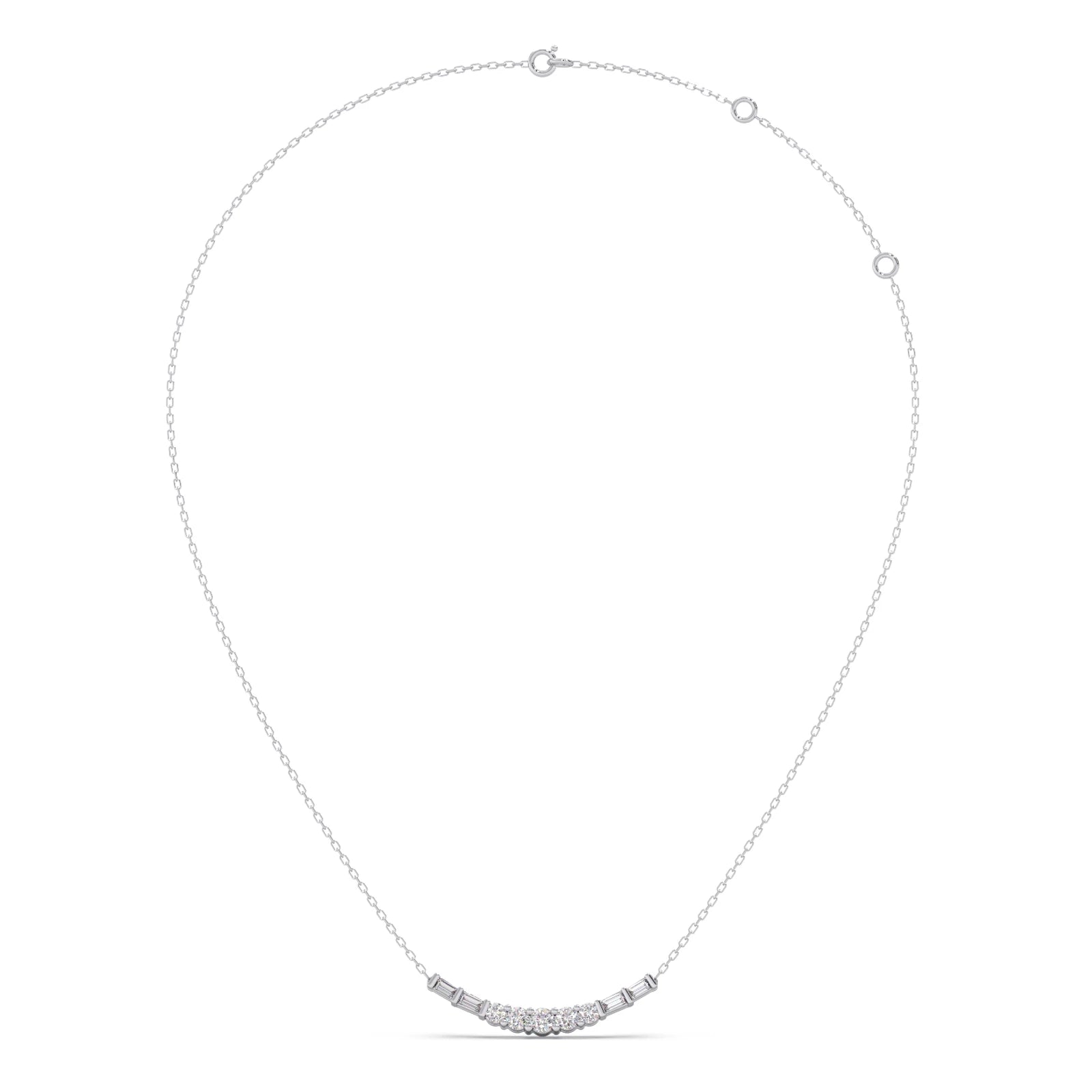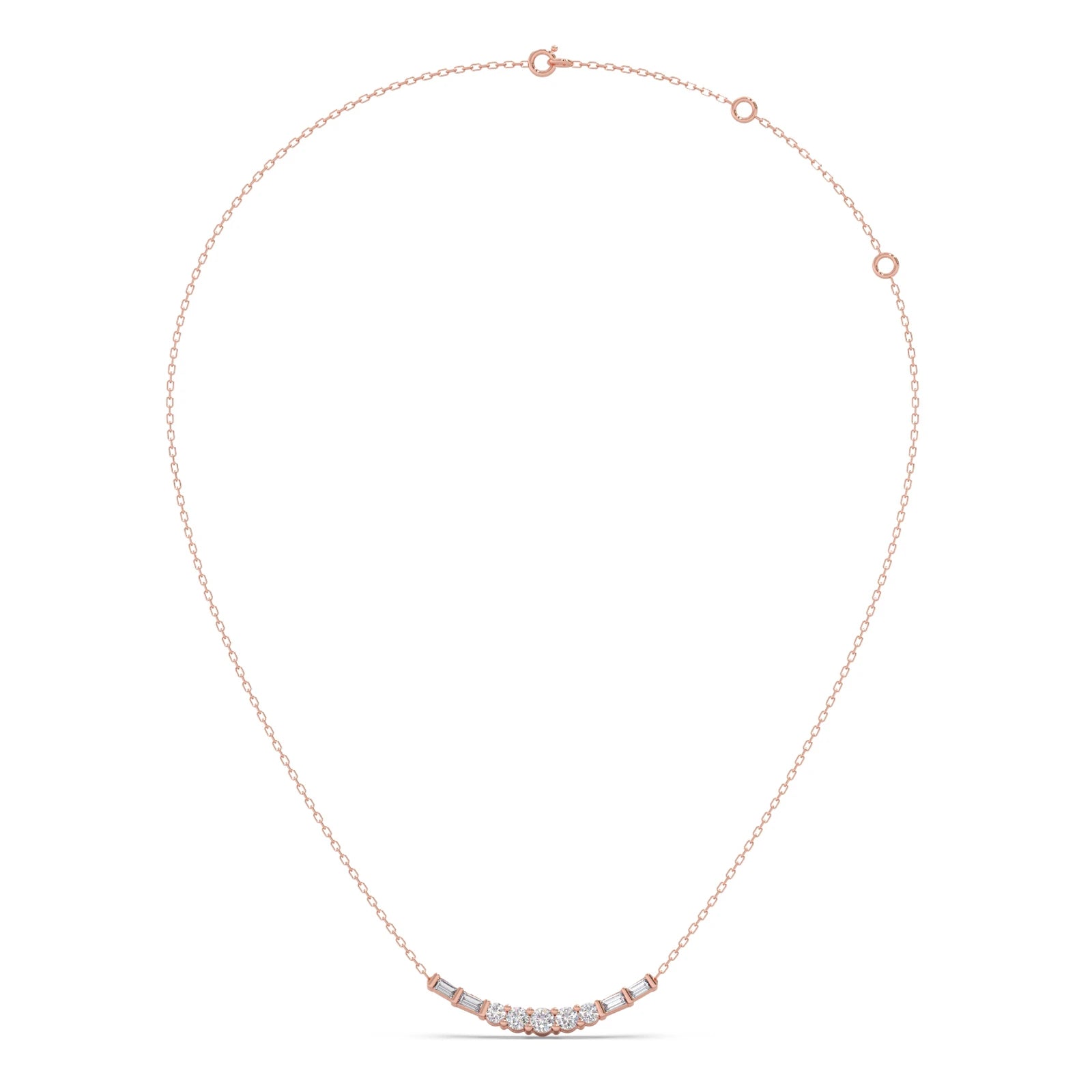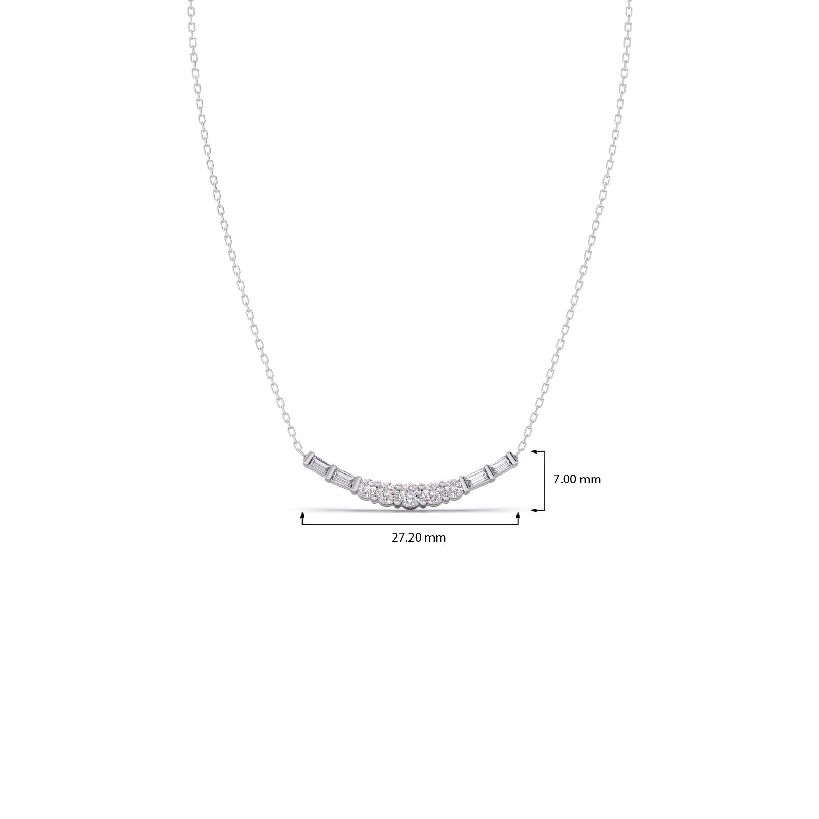 This chic necklace features a sleek bar adorned with a sophisticated combination of baguette and round-cut diamonds. The linear arrangement of the baguette cuts contrasts beautifully with the brilliant sparkle of the round diamonds, creating a modern and elegant statement piece.
