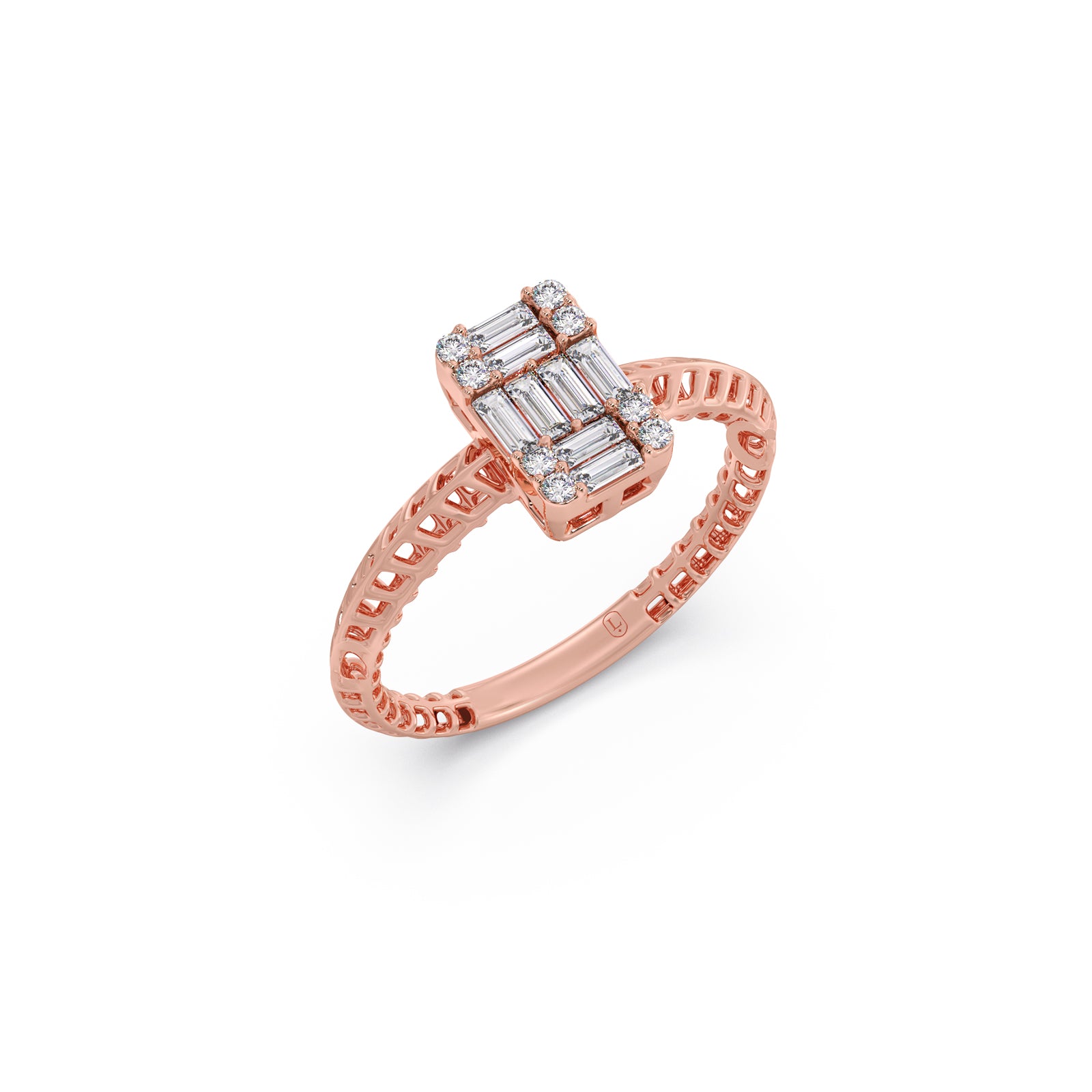 Experience a symphony of light and texture. The Harmony Ring is a testament to artistry, showcasing an elegant arrangement of contrasting diamond cuts that maximize brilliance. The sleek baguettes and dazzling rounds create an exceptional, eye-catching centerpiece for your hand.