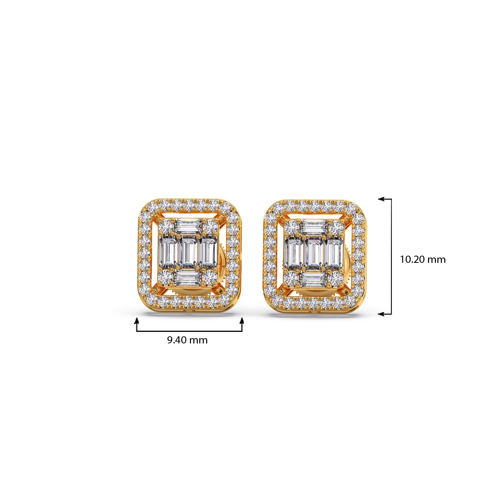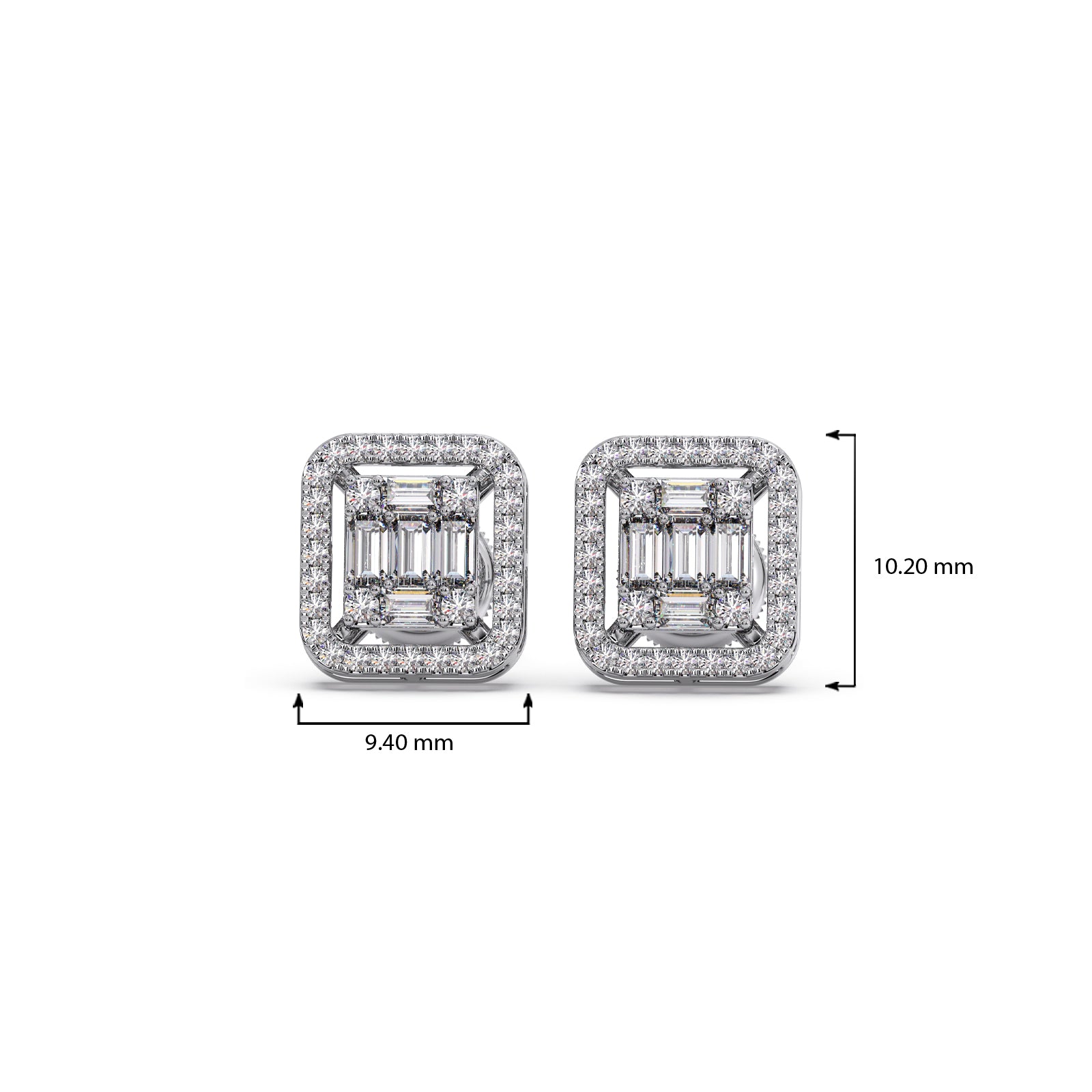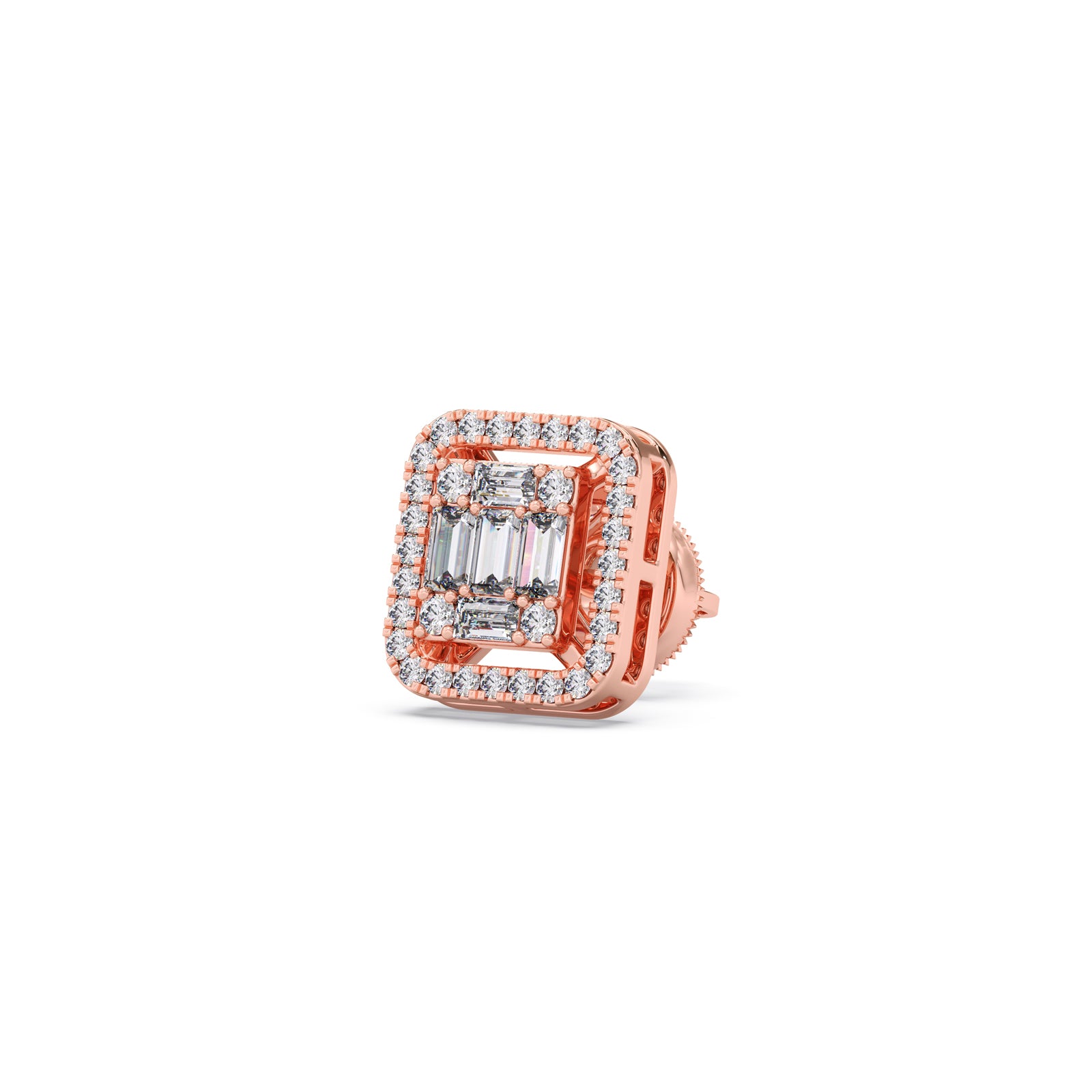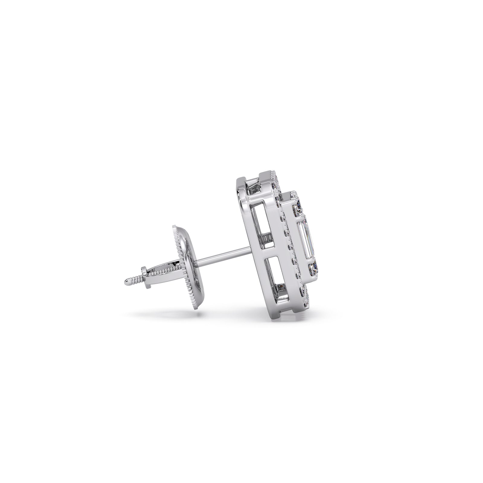 These stunning earrings feature a captivating blend of baguette and round diamonds. A central baguette-cut diamond is encircled by a halo of round brilliants, maximizing sparkle. The unique design offers a modern twist on classic elegance, perfect for adding a touch of sophisticated glamour to any occasion.