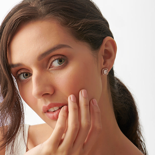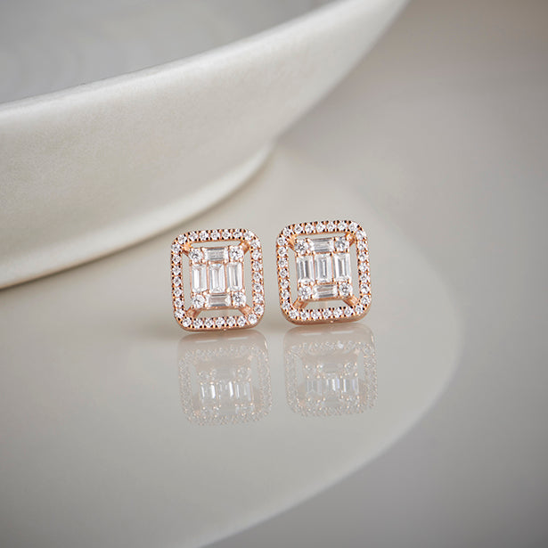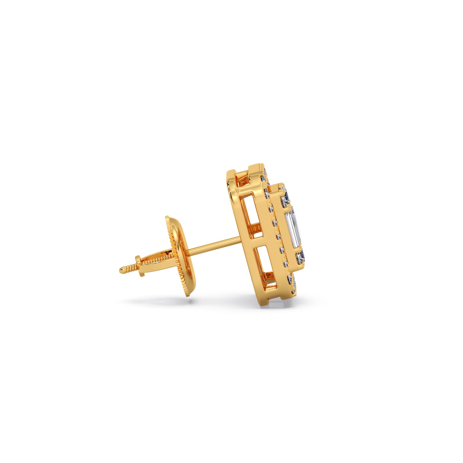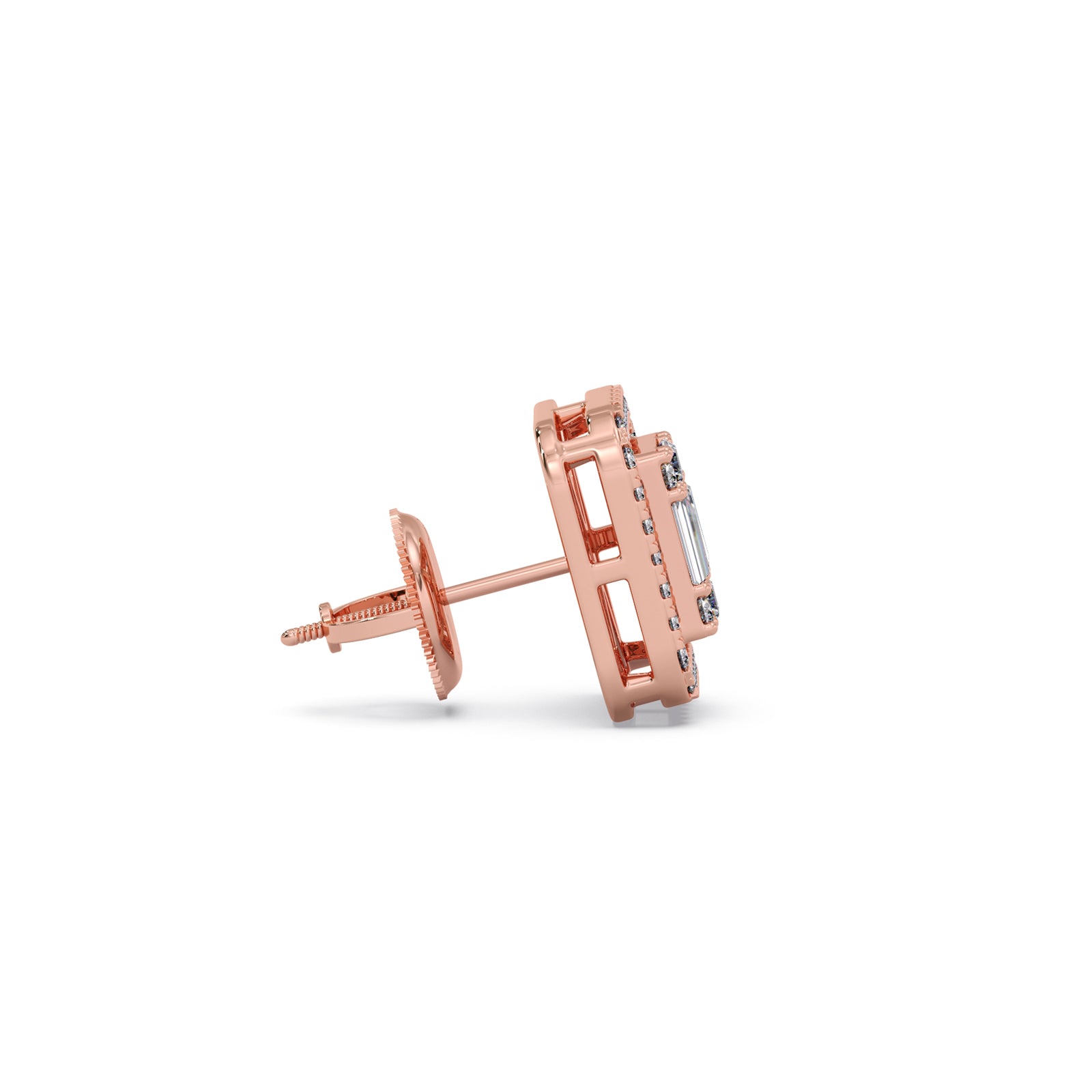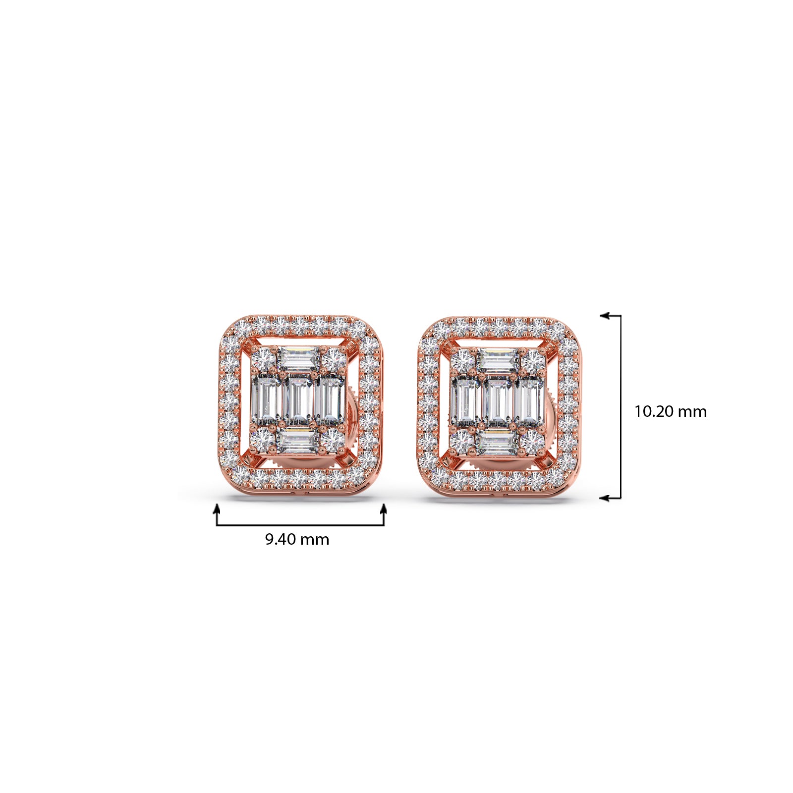 These stunning earrings feature a captivating blend of baguette and round diamonds. A central baguette-cut diamond is encircled by a halo of round brilliants, maximizing sparkle. The unique design offers a modern twist on classic elegance, perfect for adding a touch of sophisticated glamour to any occasion.