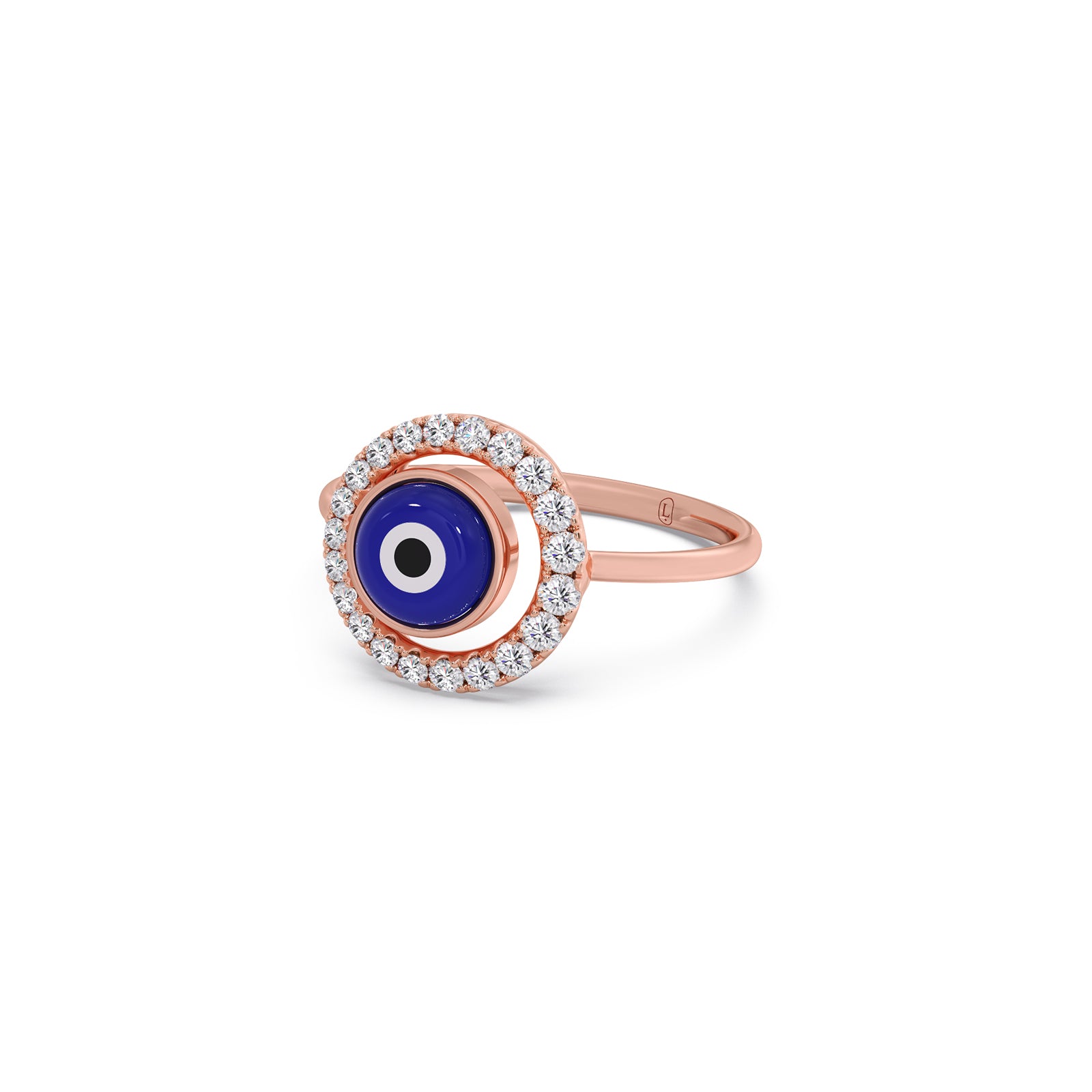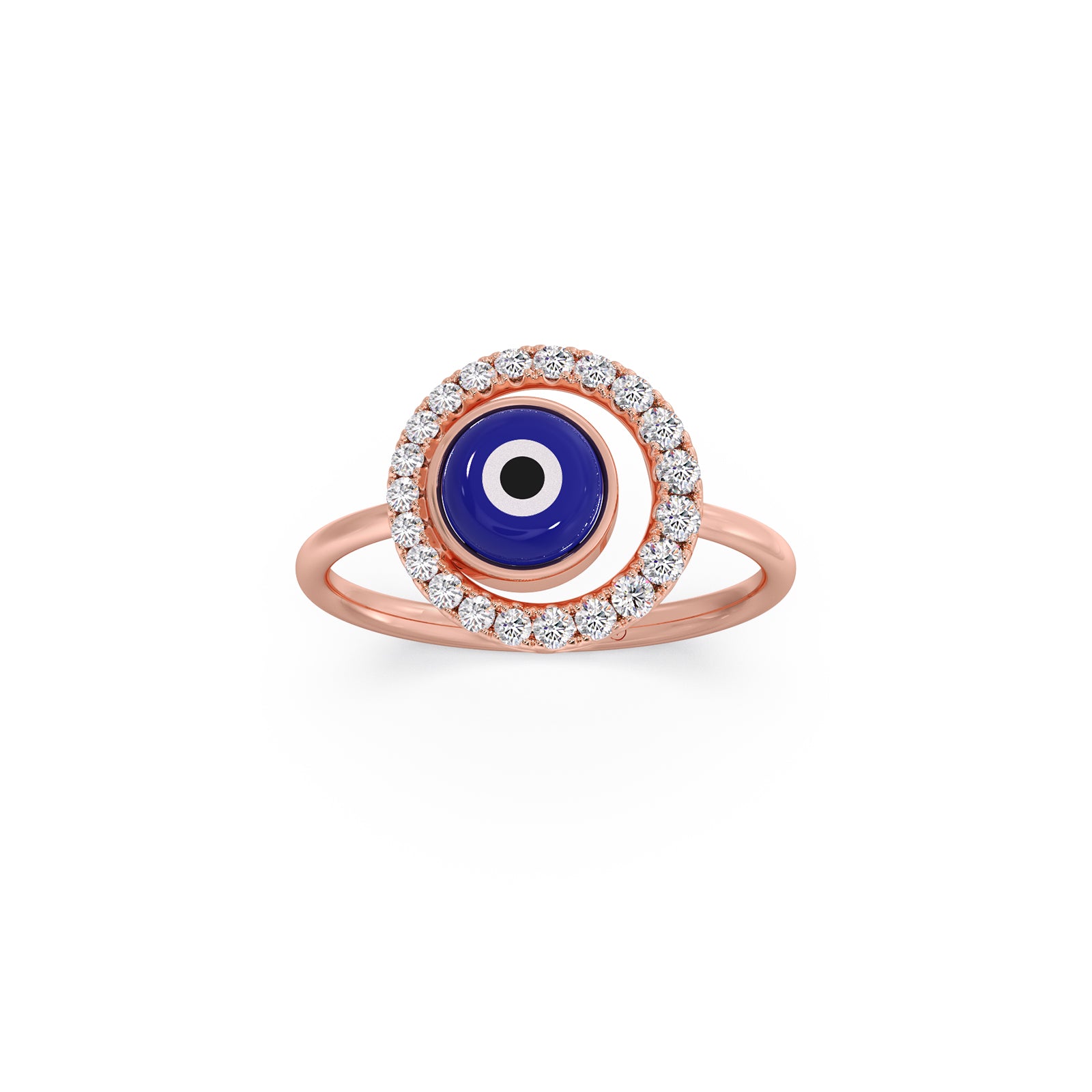This Rose Gold Evil Eye Diamond Ring is your chic new talisman. The striking deep blue Nazar is embraced by a swirling round diamond halo, providing an elegant shield against negativity. It's a dazzling piece of protection and modern style, perfect for everyday wear.
