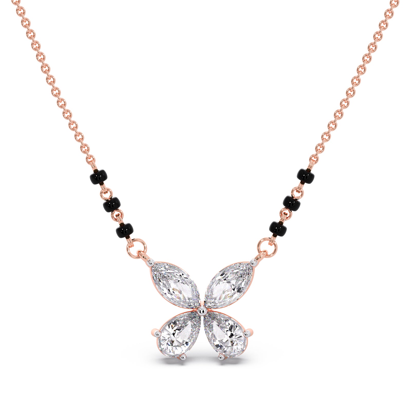 A delicate butterfly-inspired mangalsutra featuring shimmering pear and marquise-cut diamonds set in radiant gold, symbolizing elegance and transformation.