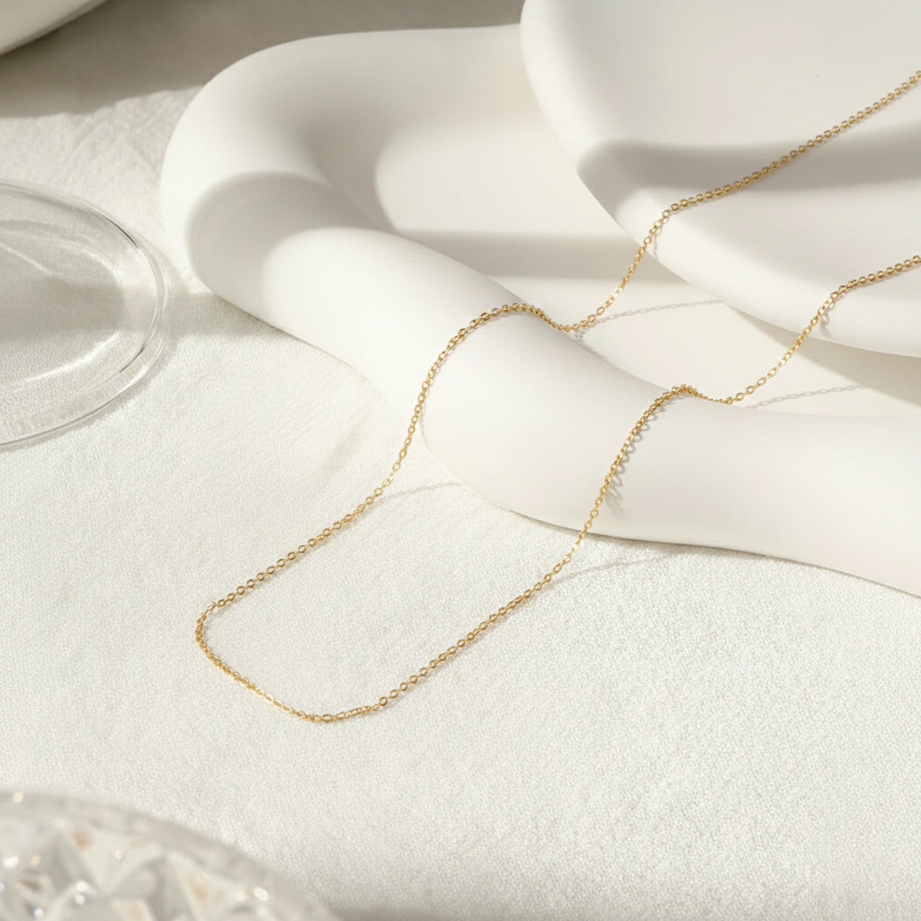 This delicate cable chain features a oval interlocked links. The repetitive, interlocking pattern makes this style exceptionally durable and resistant to kinking or breaking, making it ideal for everyday wear.