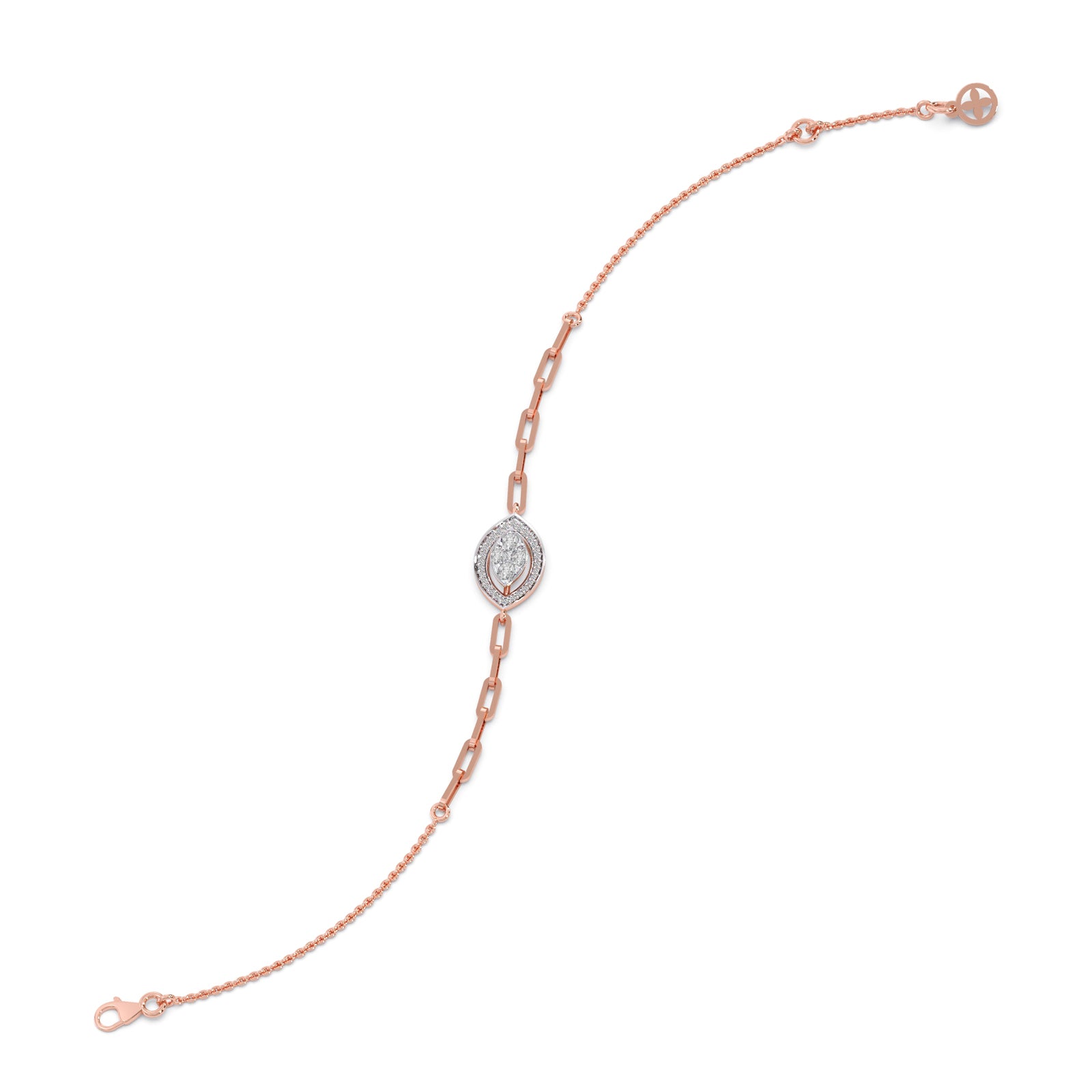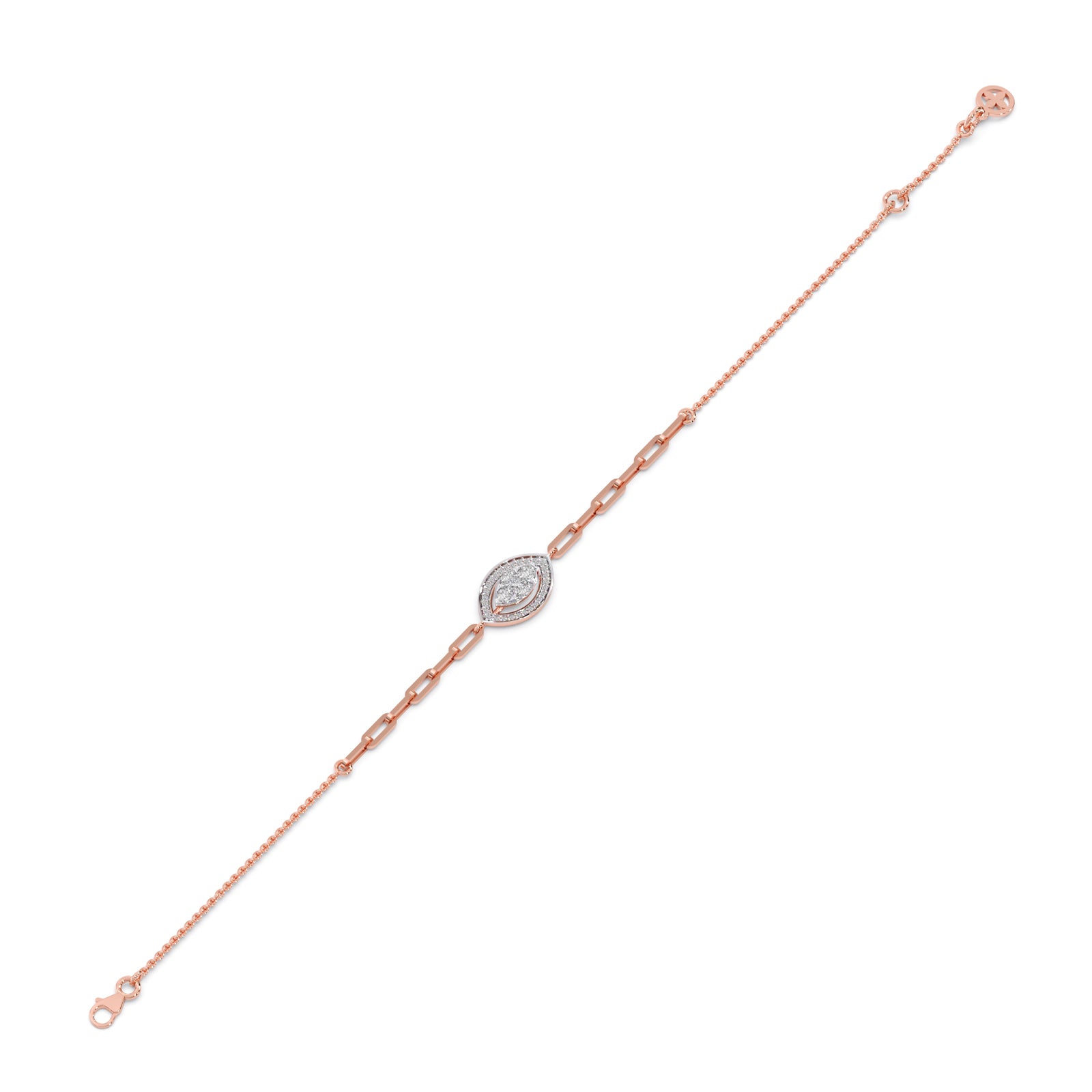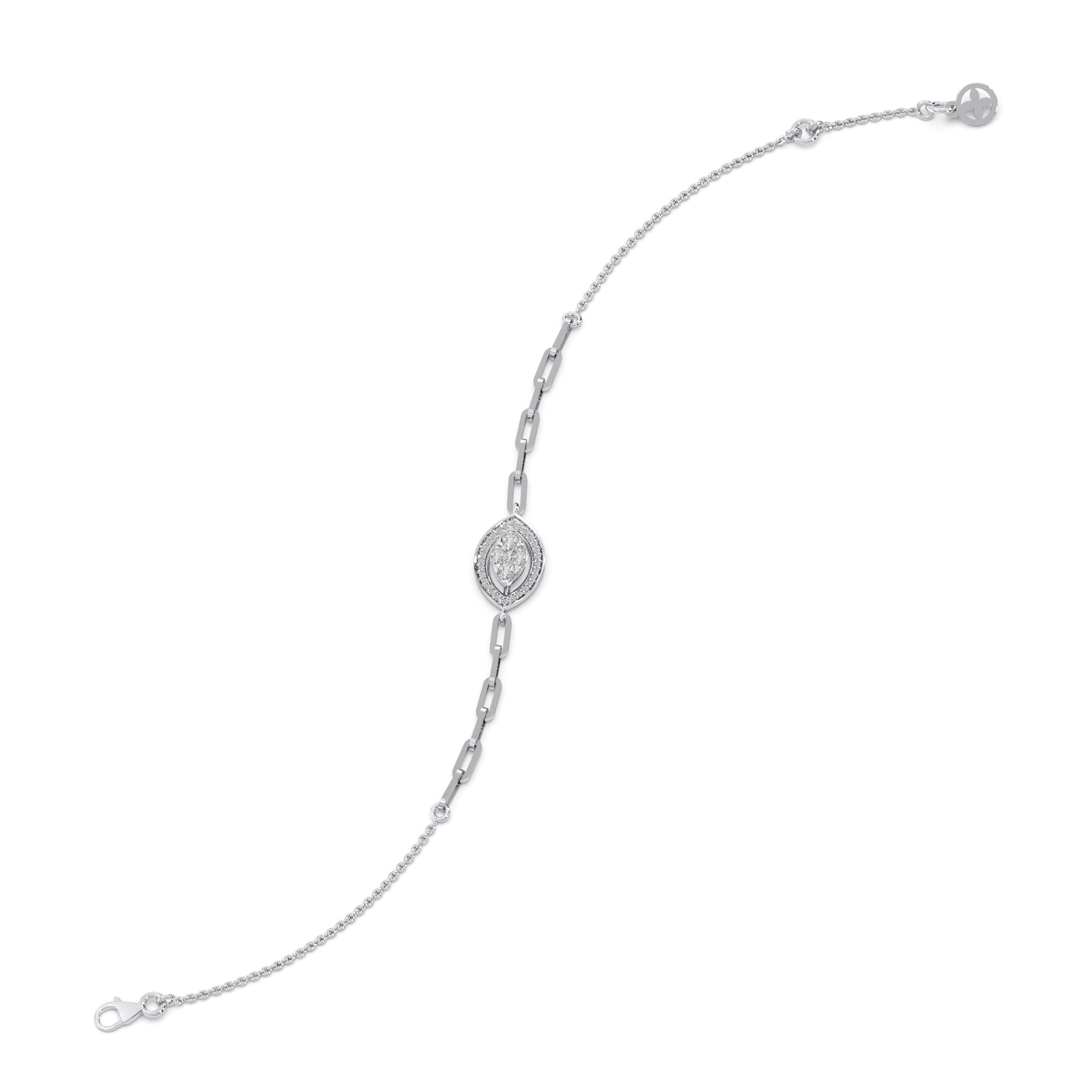These chain bracelet features an elongated marquise shape design, crafted in 0.286ct Halo Round Diamonds and Cluster Pear, Marquise, Princess-Cut Diamonds. This chain bracelet making it an versatile enough for daily wear or any ocassions wear.