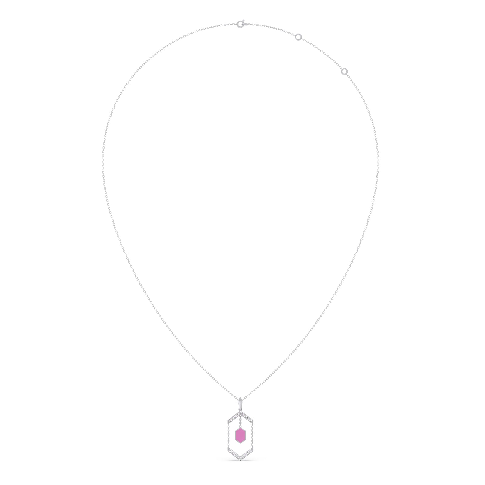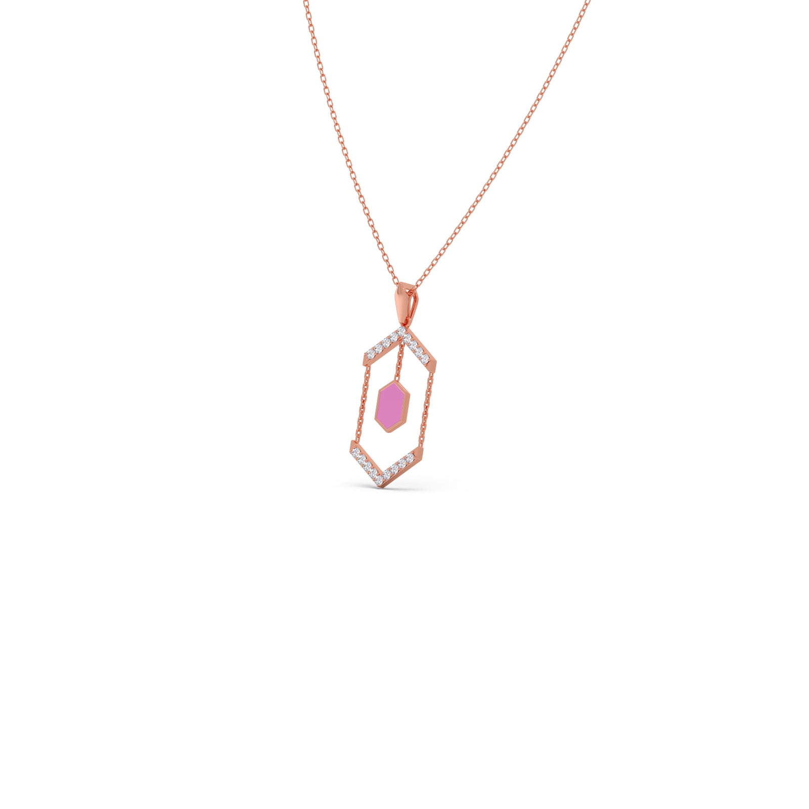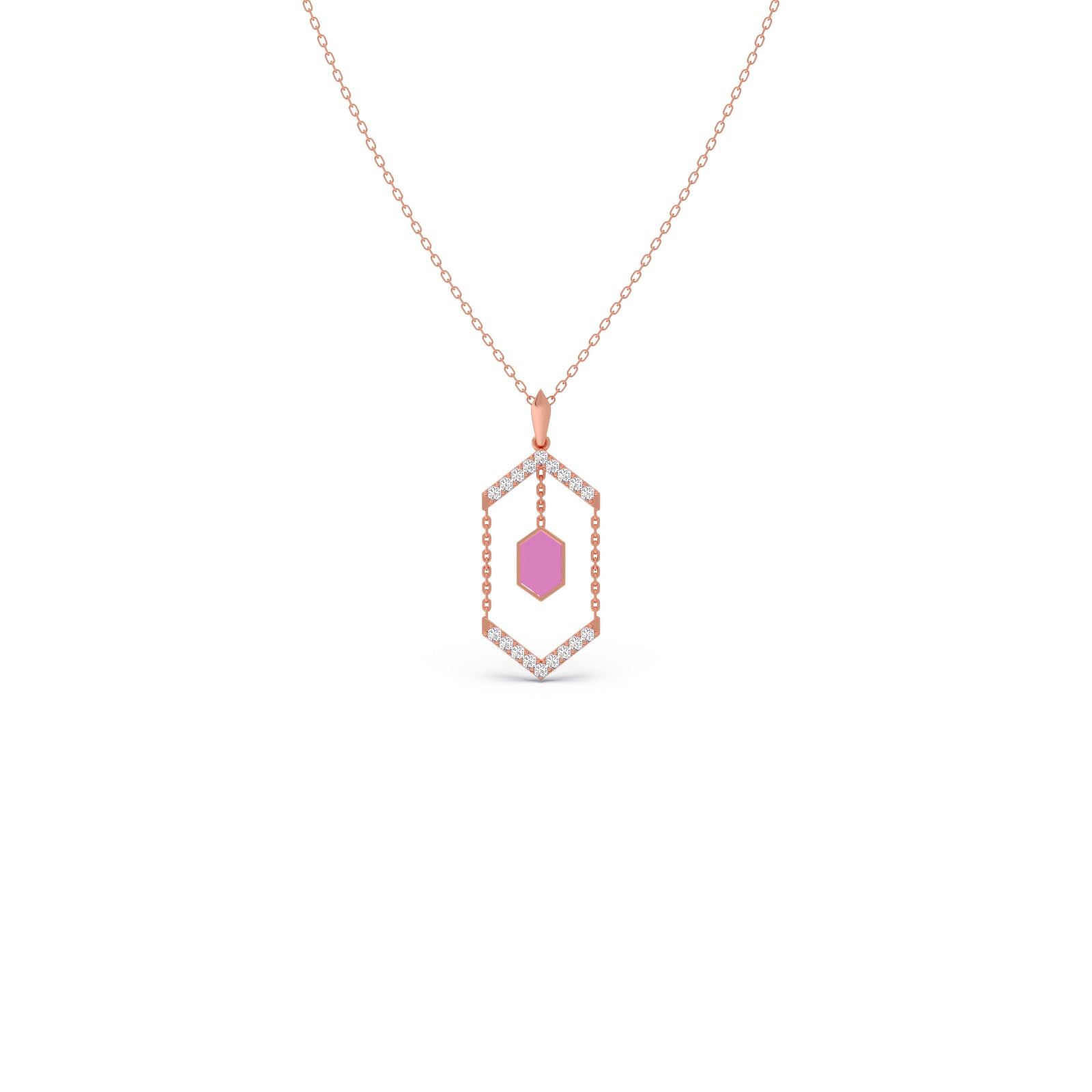 This pendant features a modern, architectural design with a distinct antique pink enamel. The top and bottom angled edges of hexagon are encrusted with brilliant round-cut diamonds, while the sides are made of delicate gold chains. Ideal for both high-end street wear and professional wear.