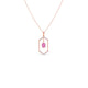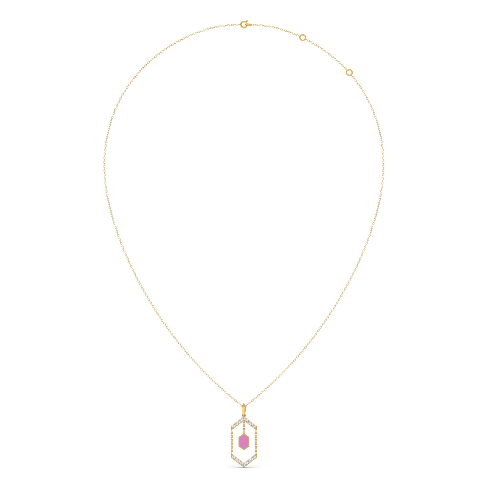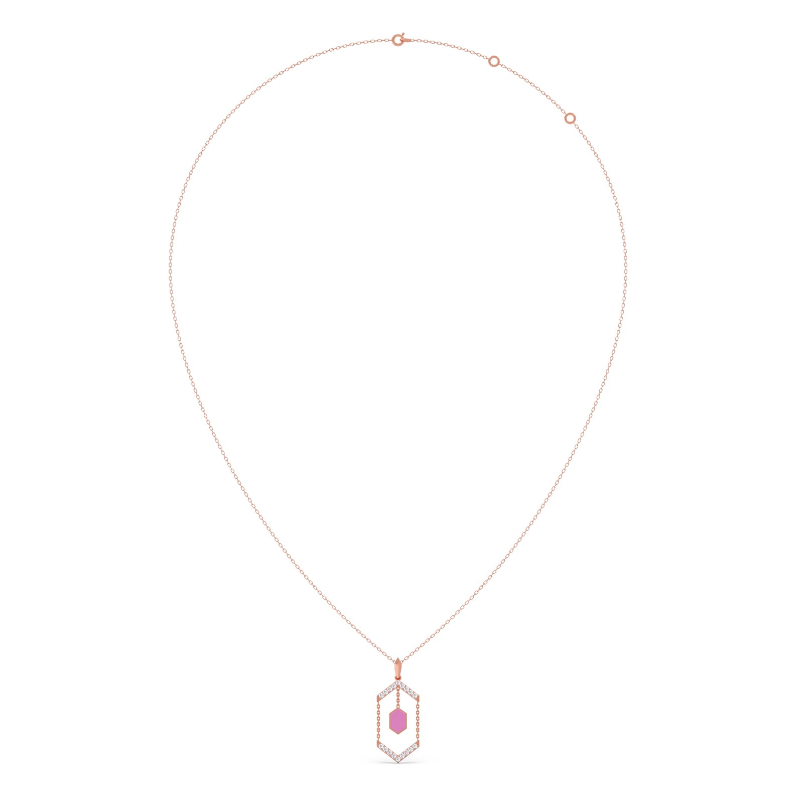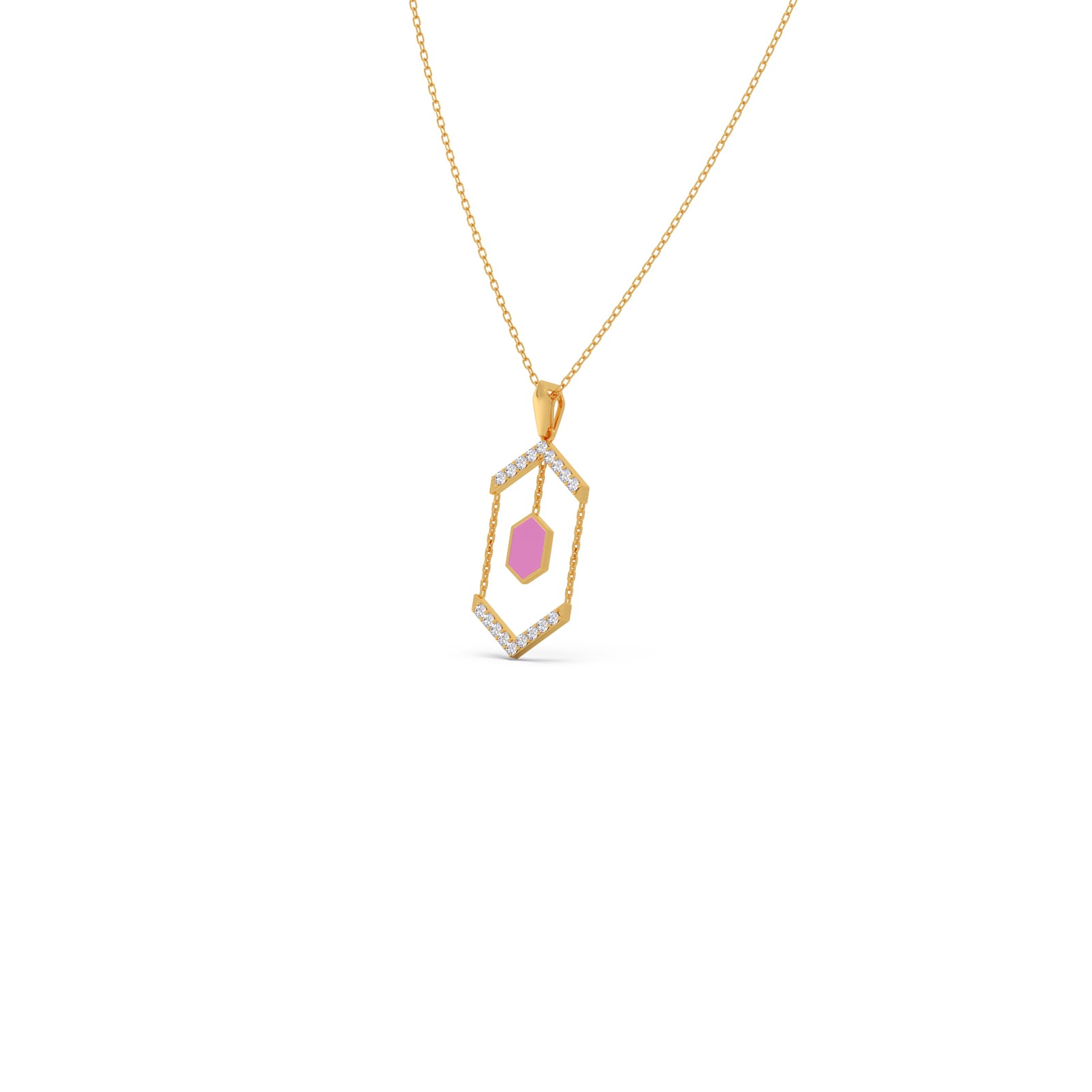This pendant features a modern, architectural design with a distinct antique pink enamel. The top and bottom angled edges of hexagon are encrusted with brilliant round-cut diamonds, while the sides are made of delicate gold chains. Ideal for both high-end street wear and professional wear.
