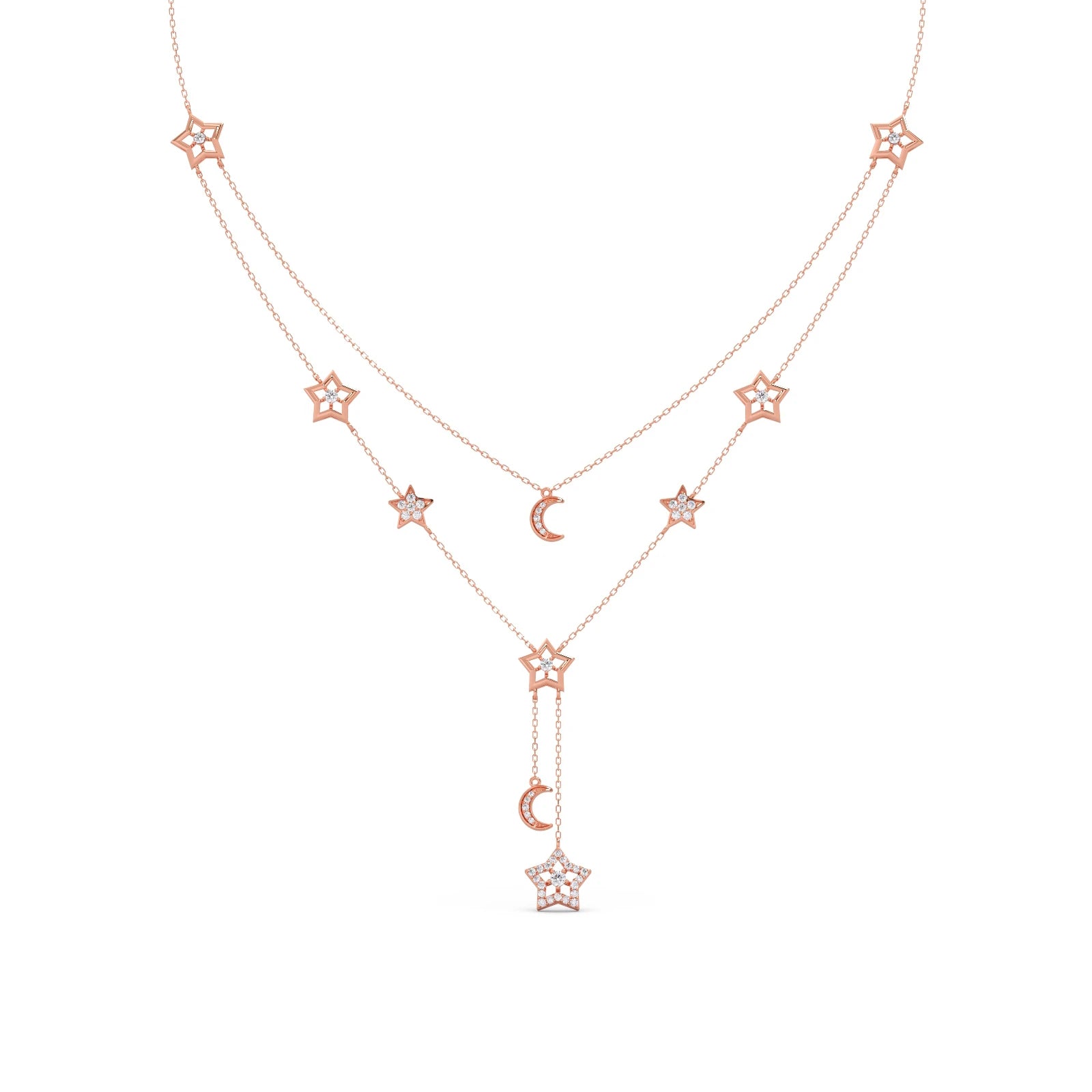 Embrace cosmic elegance with this celestial layered necklace. Delicate chains cascade, each adorned with celestial charms like stars and moons. This piece offers a dreamy, layered look, perfect for adding a touch of whimsical charm to any outfit. A beautiful, ethereal accessory.