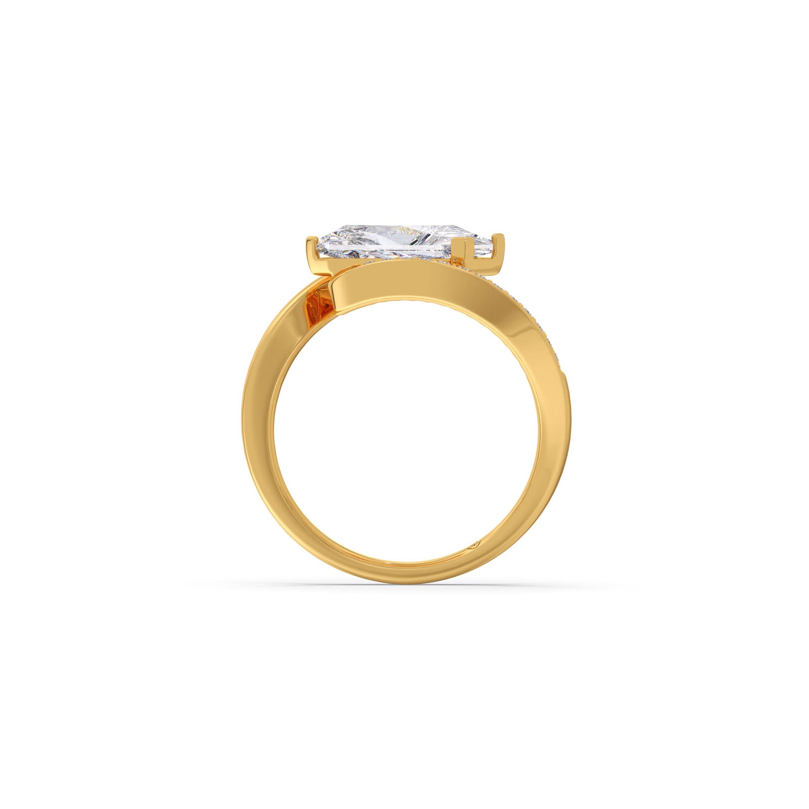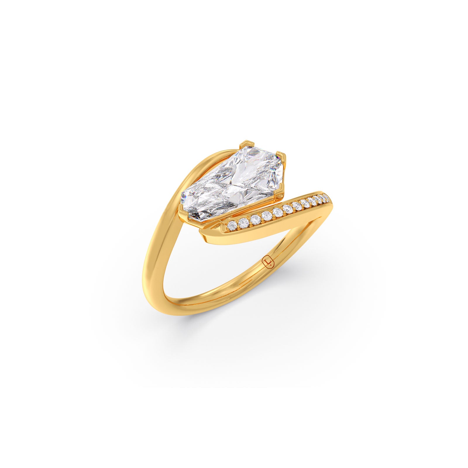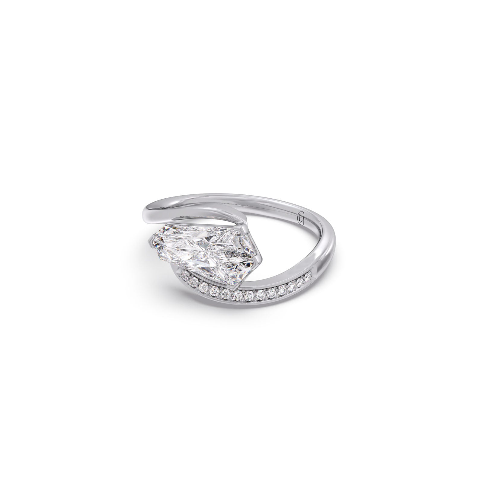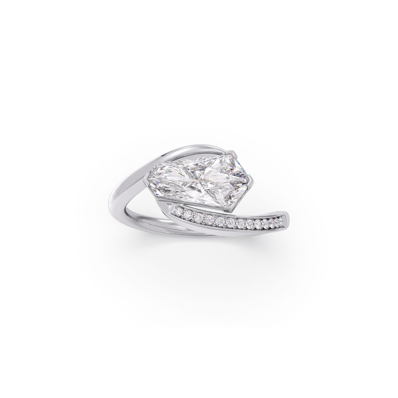 "This ring features a 2.060ct Classic Pin-Cut Solitaire Diamond set in fluid,curve bypass shank settled at center of ring. One arm of shank are crafted in pave-set brilliant round diamonds. This timeless design enhances sparkle and sophistication, making it the perfect choice for modern everyday wear."