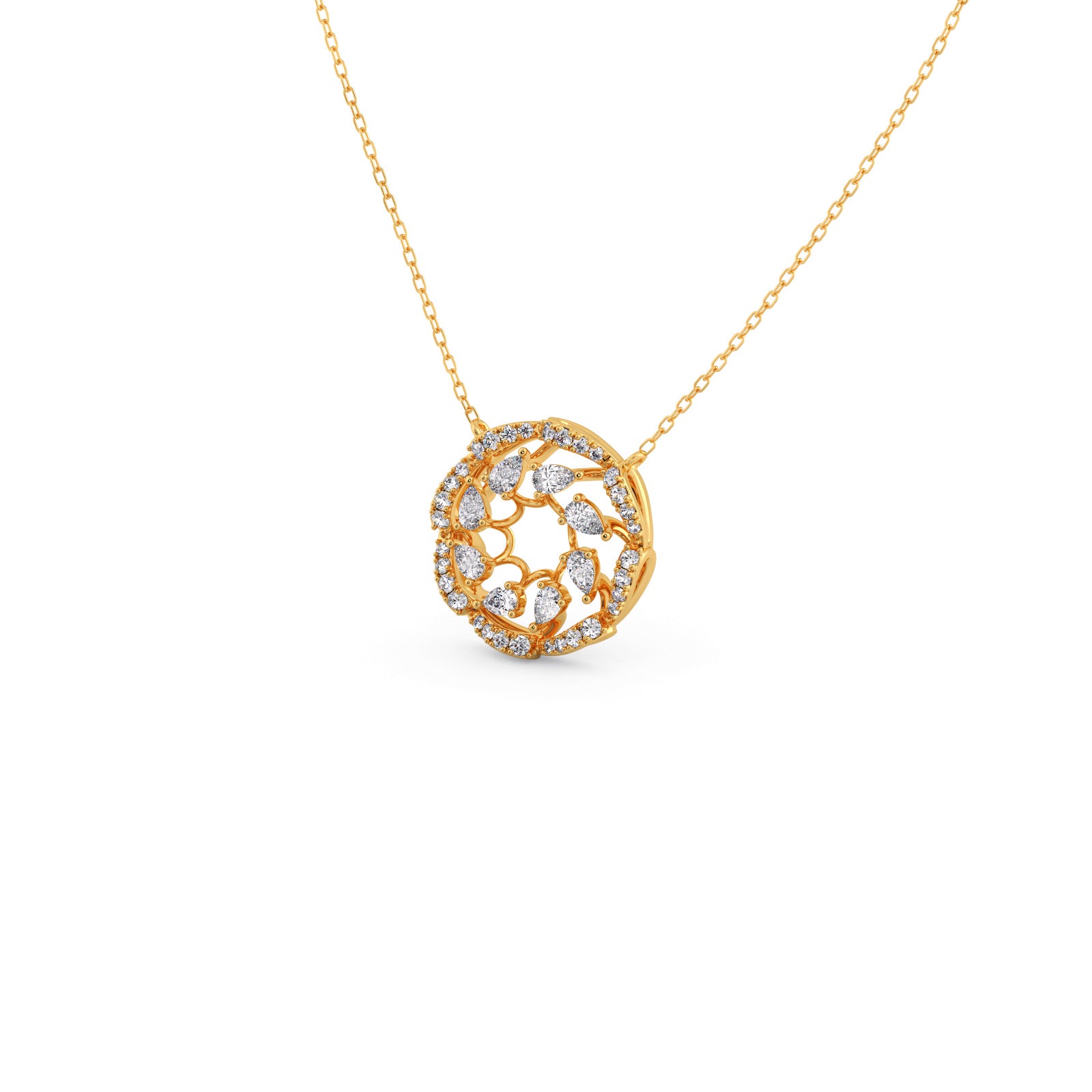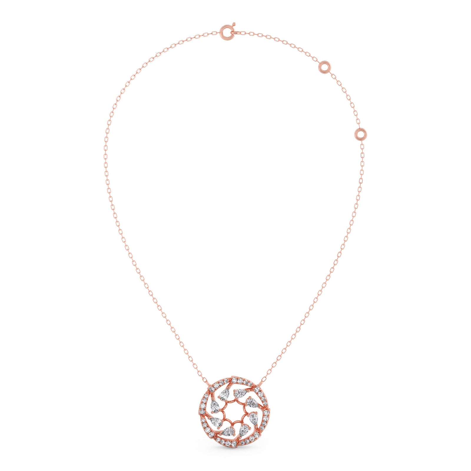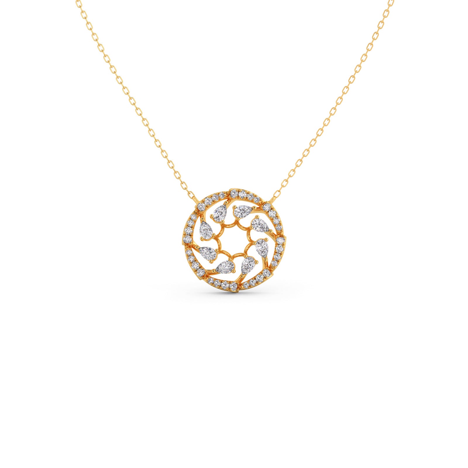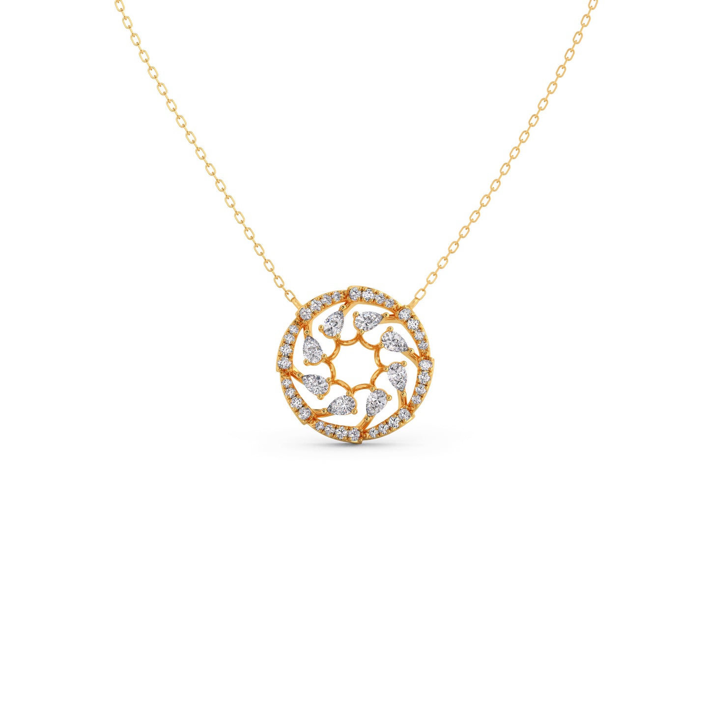 The Circle of Grace Diamond Pendant Necklace features a perfectly balanced circular silhouette, adorned with a harmonious arrangement of Round and Pear Diamonds. Symbolizing unity and elegance, this design captures light with graceful brilliance—an effortlessly timeless piece for refined, everyday luxury.