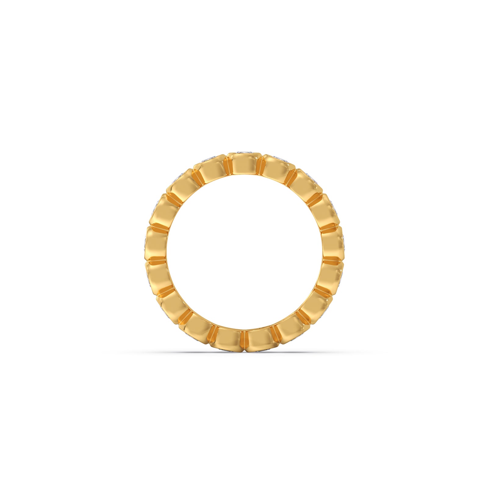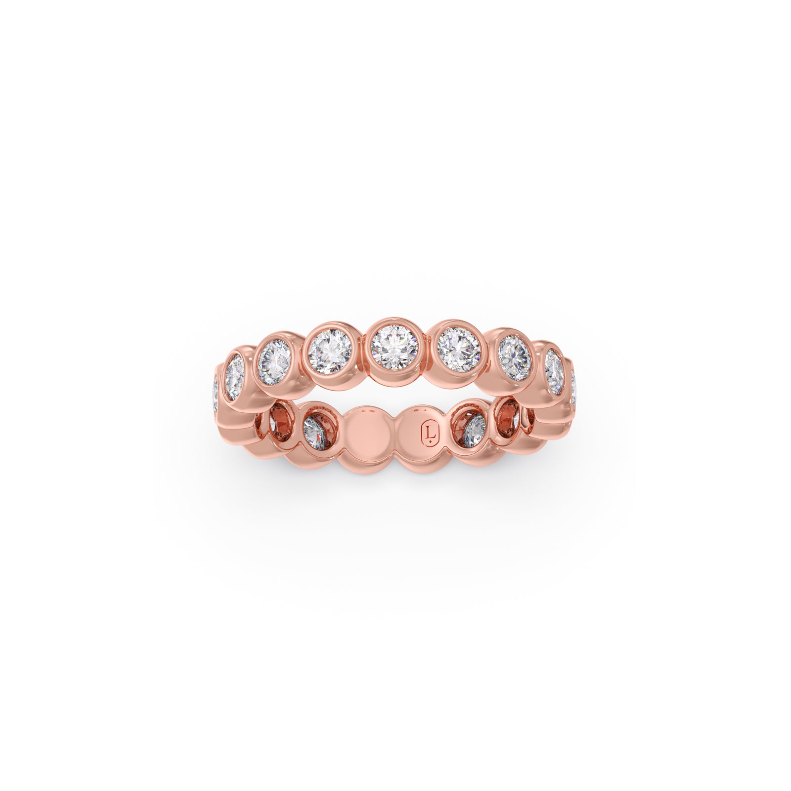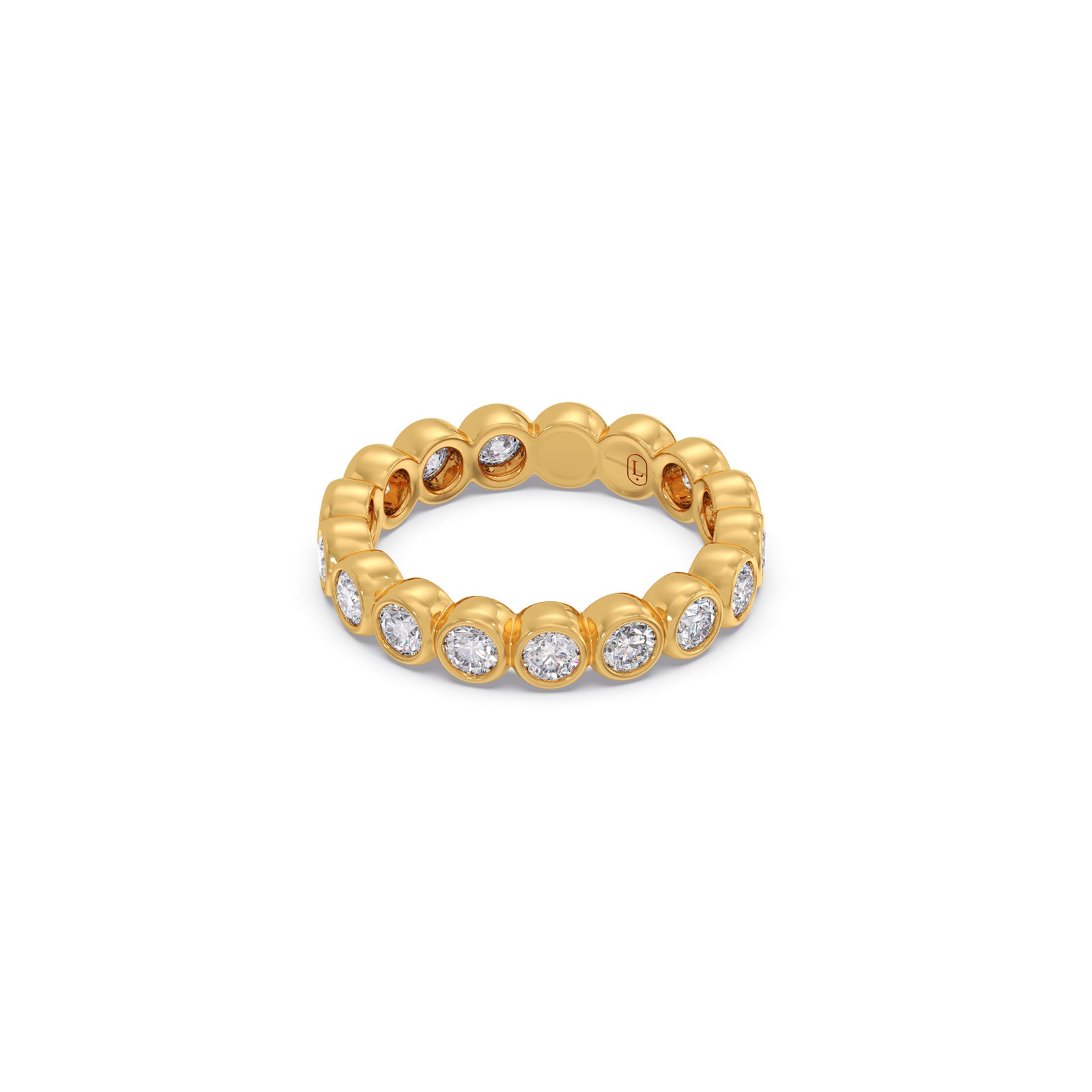 A circle of clarity, crafted for continuity. This timeless eternity ring features 17 bezel-set Round Lucira Grown Diamonds totaling 1.785 ct.—each one a luminous note in a composition of resilience and grace. Framed in smooth gold, the diamonds appear to float seamlessly, capturing light and movement with every gesture. A symbol of lasting connection, quiet strength, and the beauty of what endures.