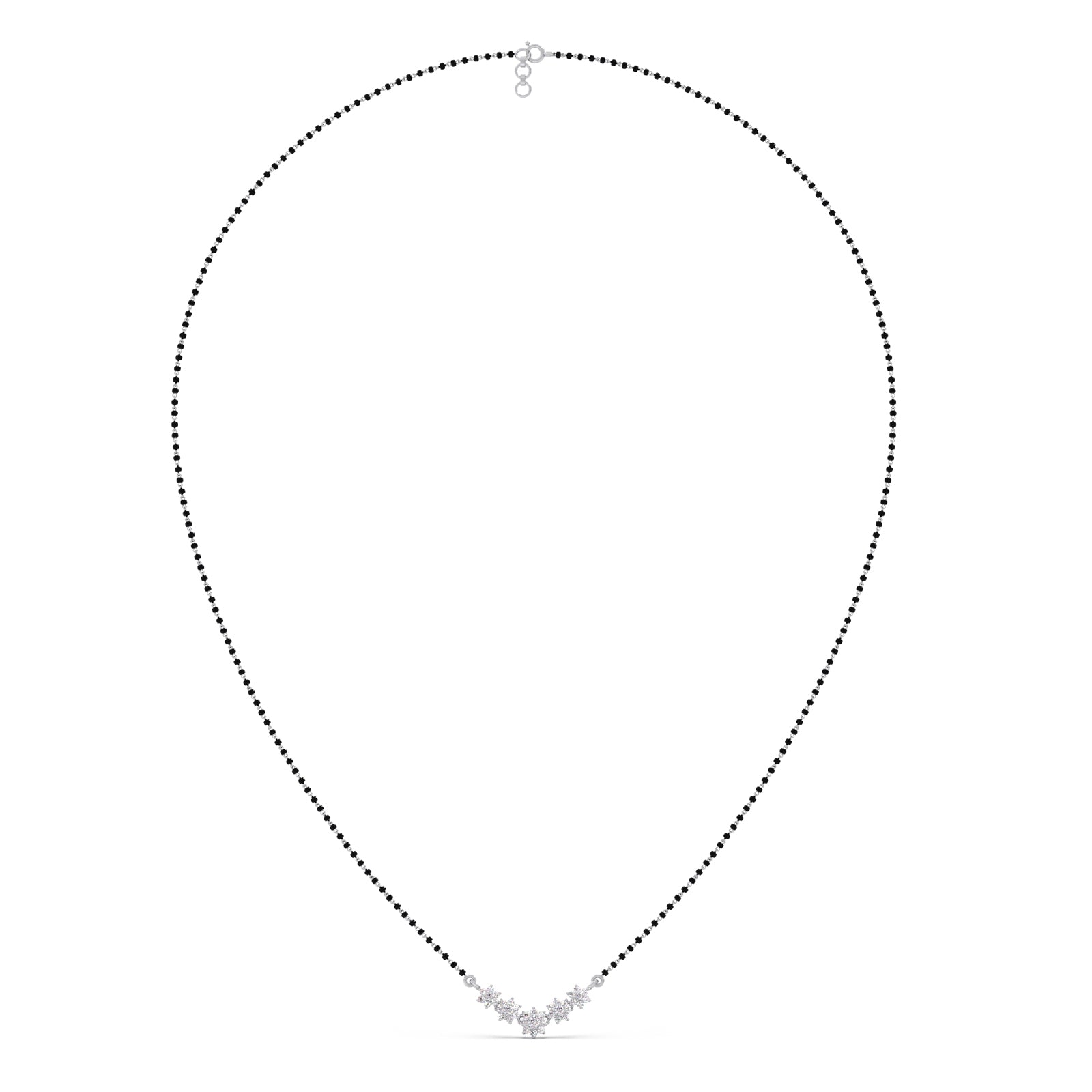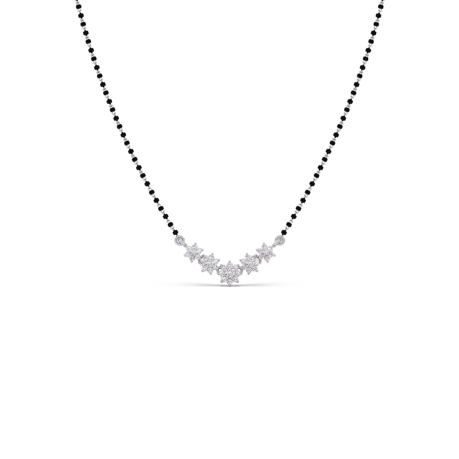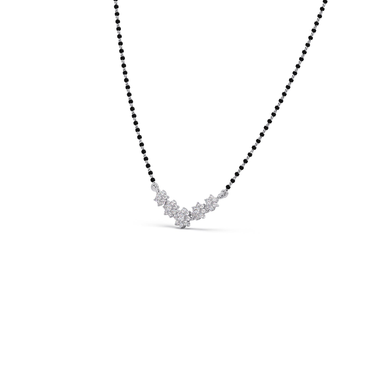 The Celestial Curve Mangalsutra beautifully blends tradition with modern sparkle. Its delicate black beaded chain holds a striking V-shaped pendant, featuring five diamond flower clusters that form a lustrous arc. This piece is a dazzling symbol of eternal love and commitment.