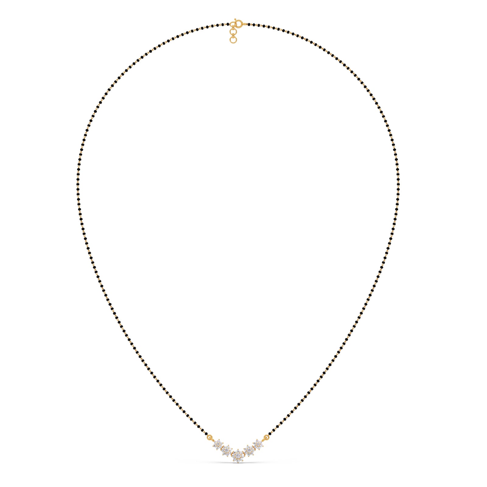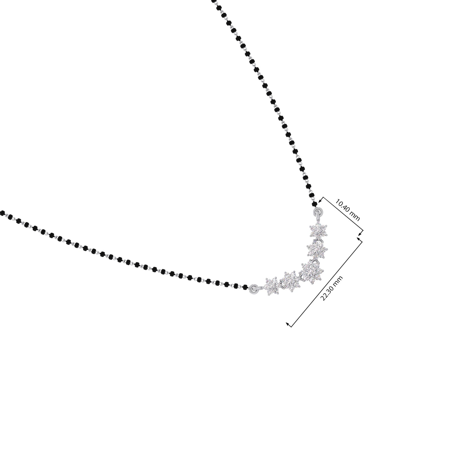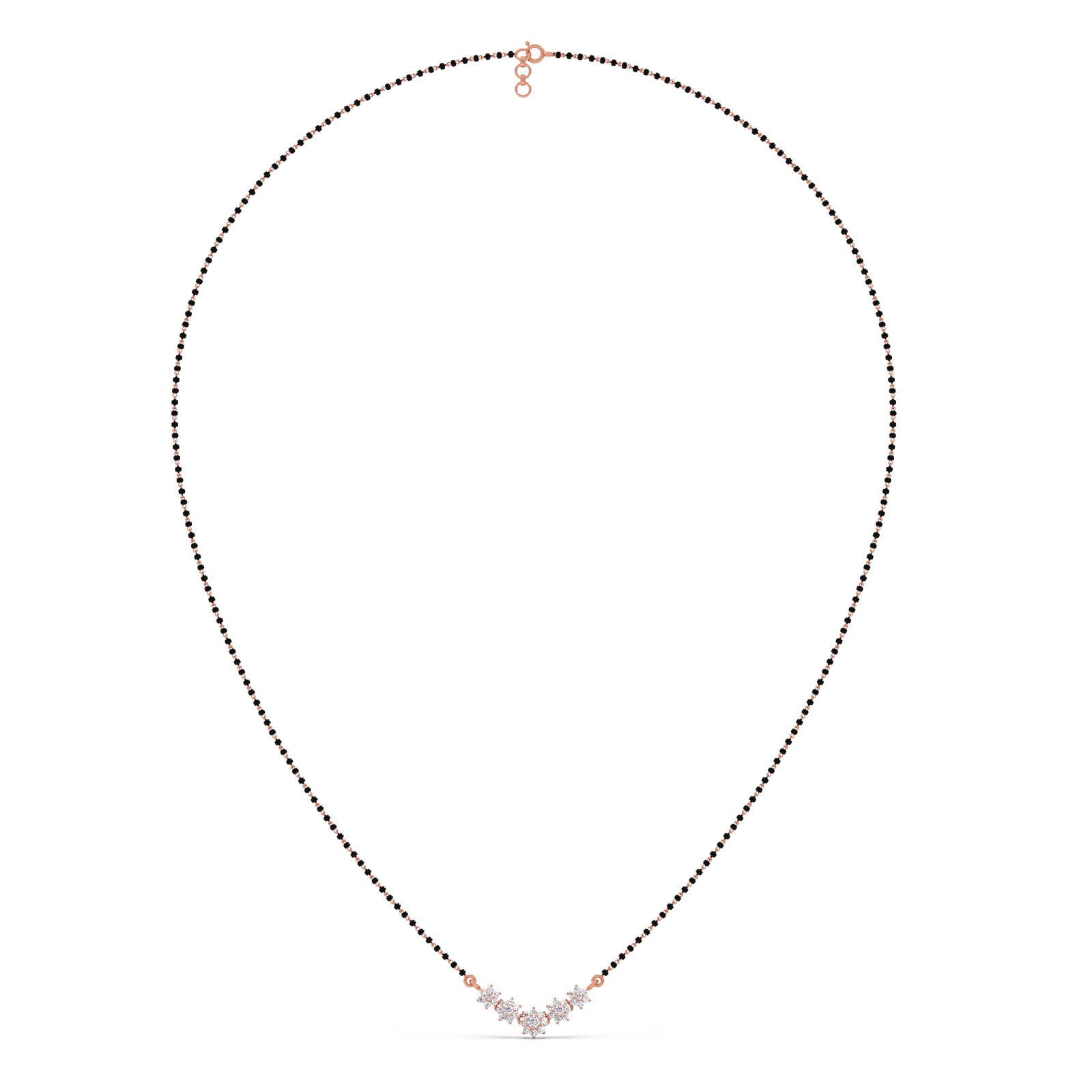 The Celestial Curve Mangalsutra beautifully blends tradition with modern sparkle. Its delicate black beaded chain holds a striking V-shaped pendant, featuring five diamond flower clusters that form a lustrous arc. This piece is a dazzling symbol of eternal love and commitment.