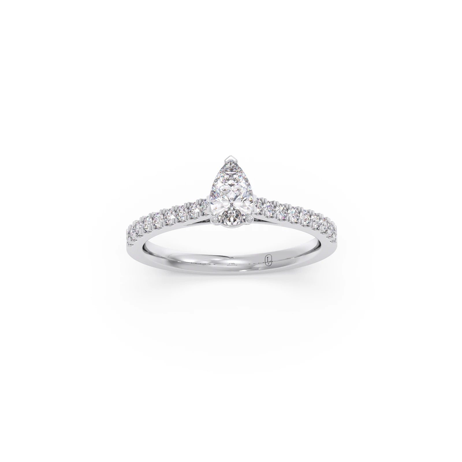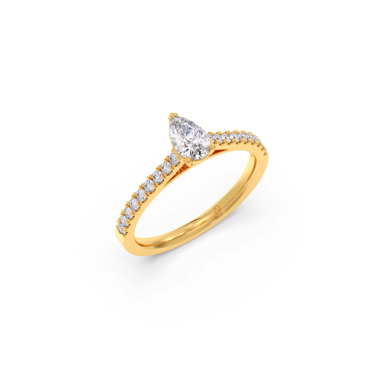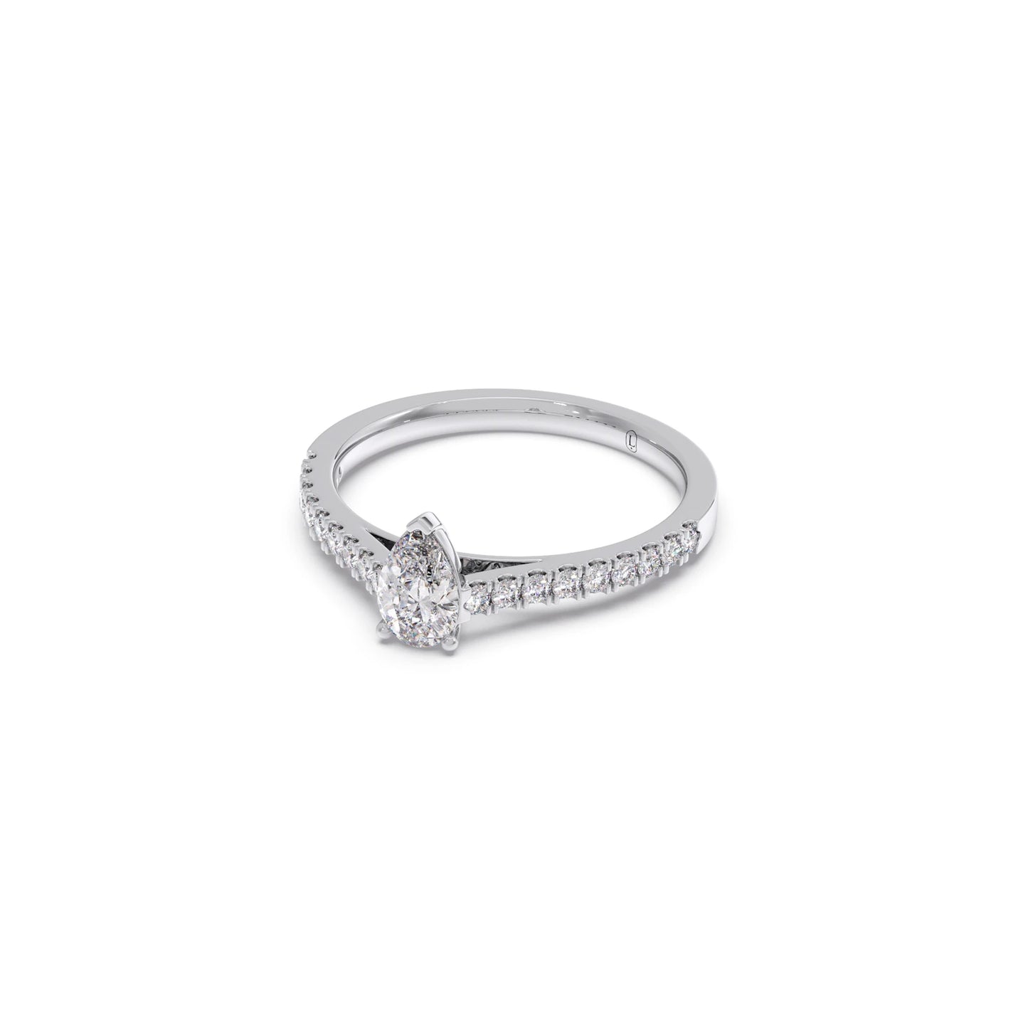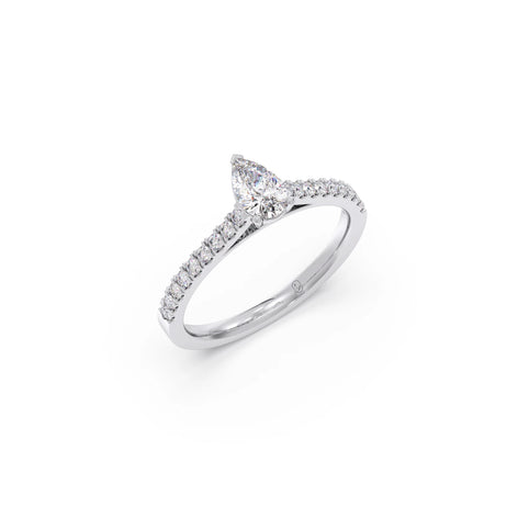 A captivating solitaire ring showcasing a brilliant pear-shaped diamond as its focal point. Delicate round diamonds are meticulously set as accents along the band, adding a touch of subtle sparkle and enhancing the center stone's elegance. This timeless design offers a graceful and sophisticated expression of love and commitment.