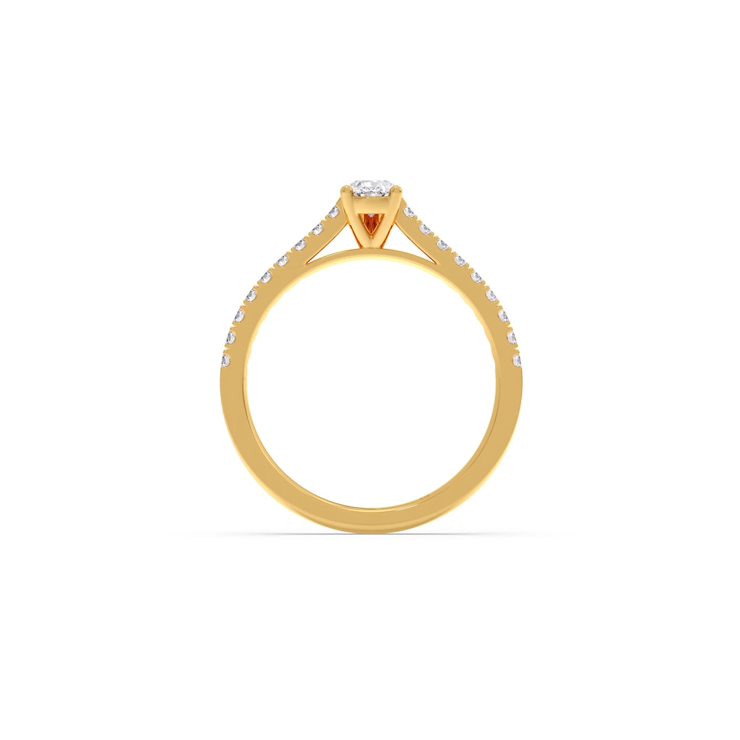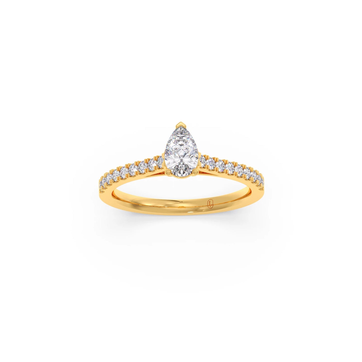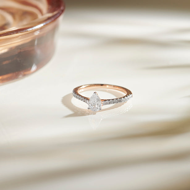 A captivating solitaire ring showcasing a brilliant pear-shaped diamond as its focal point. Delicate round diamonds are meticulously set as accents along the band, adding a touch of subtle sparkle and enhancing the center stone's elegance. This timeless design offers a graceful and sophisticated expression of love and commitment.