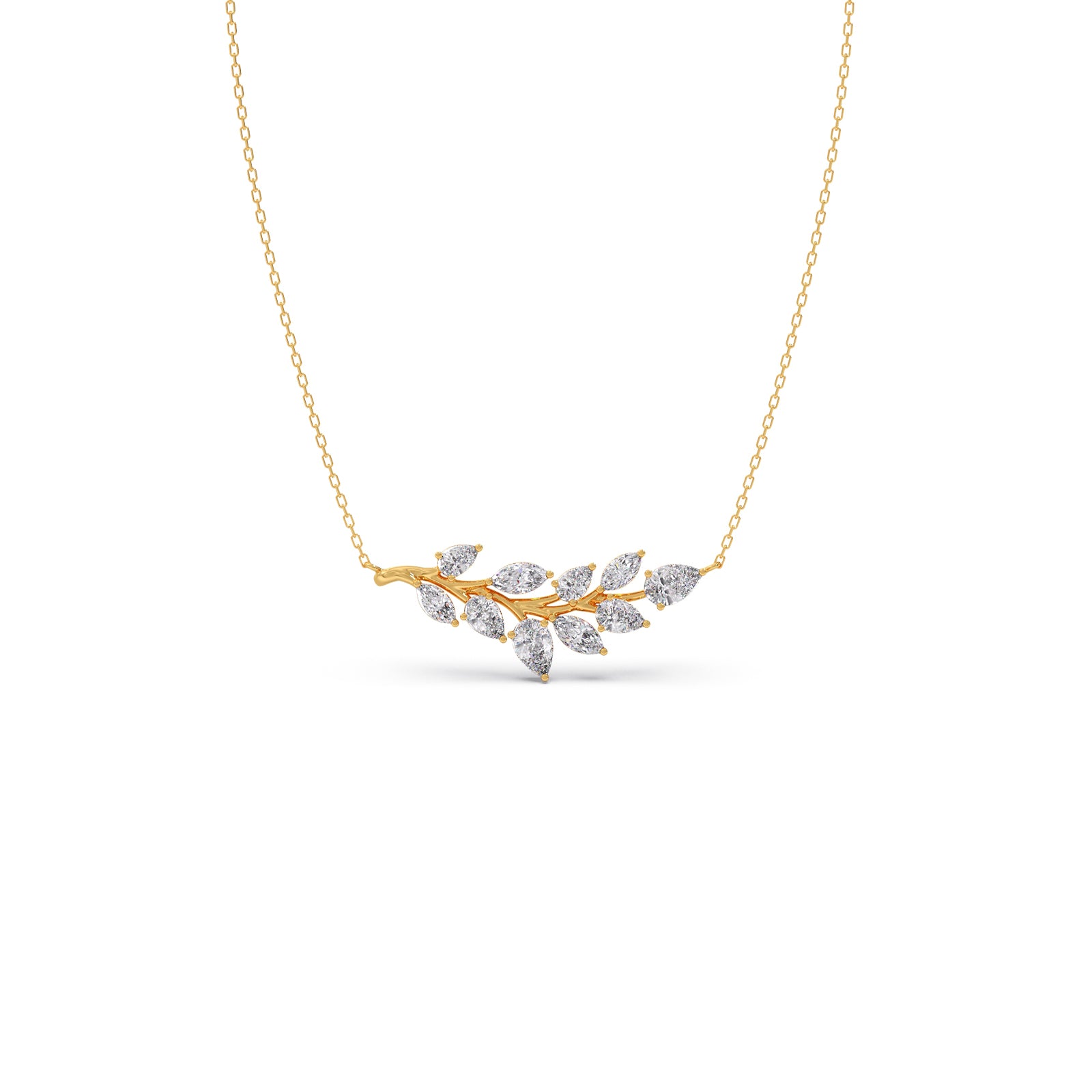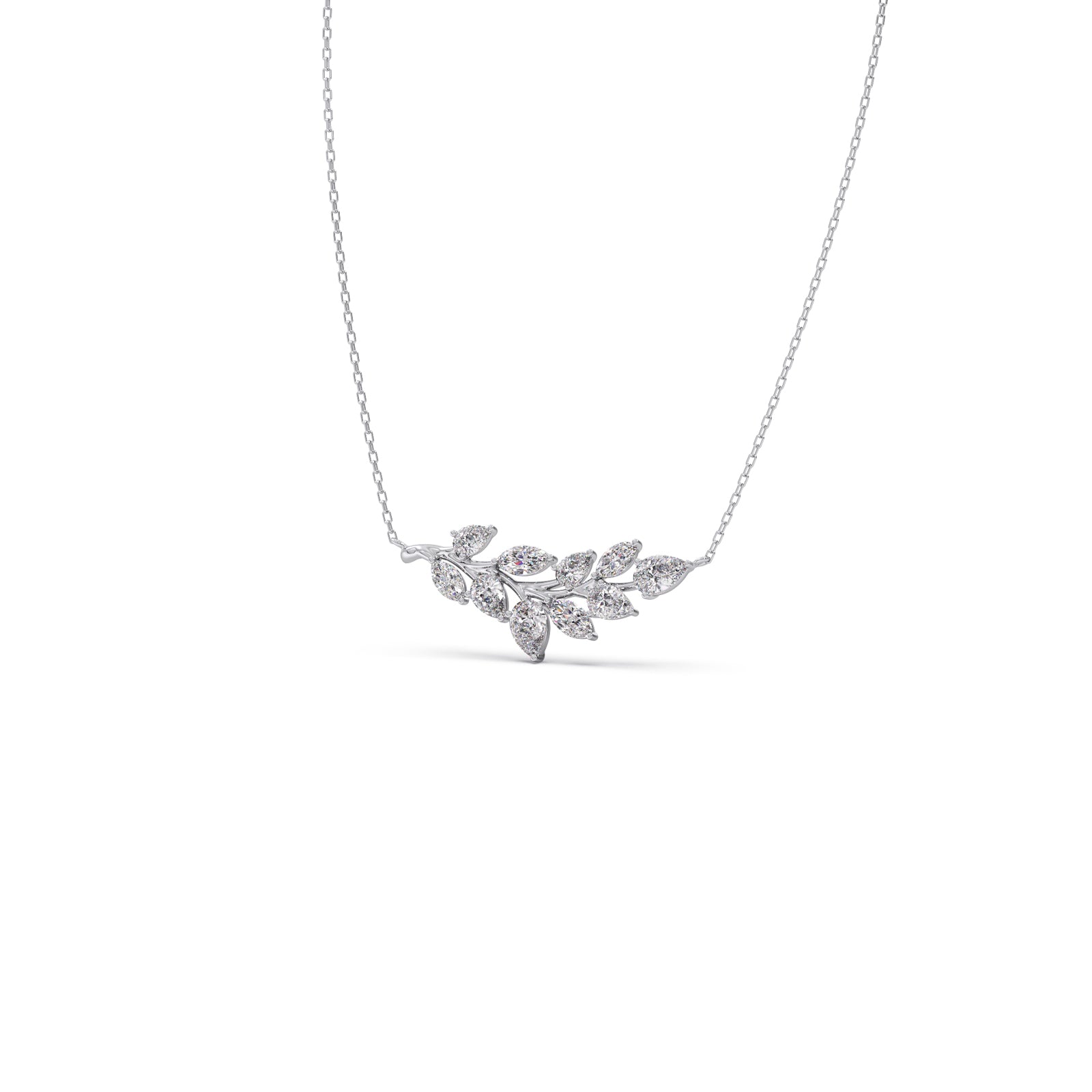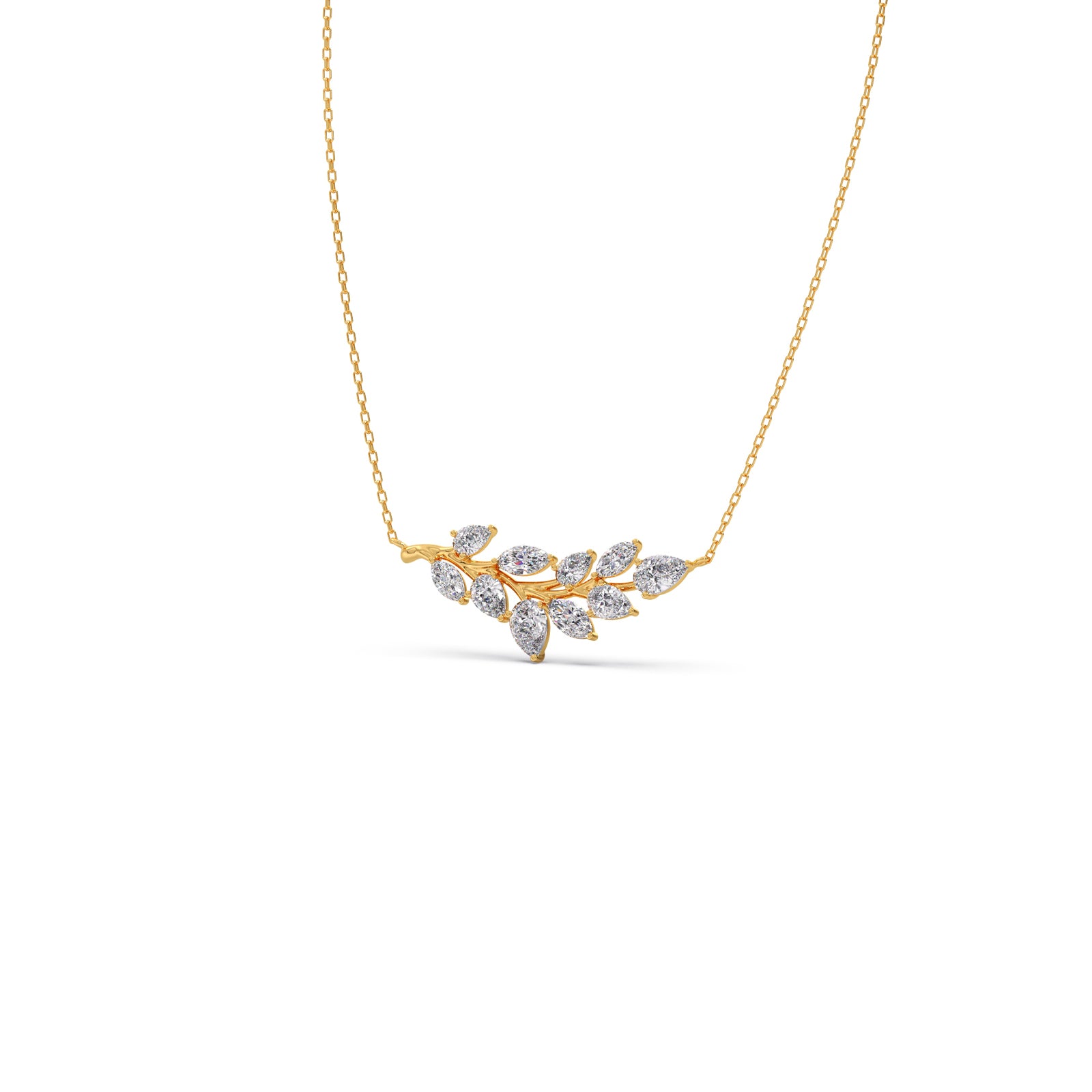 A stunning Cluster Leaf Diamond Pendant featuring delicately crafted leaves adorned with shimmering Marquise and Pear-shaped Diamonds. This elegant design captures nature’s grace and adds timeless sparkle, making it the perfect accessory for any occasion. A true symbol of natural beauty and refined sophistication.
