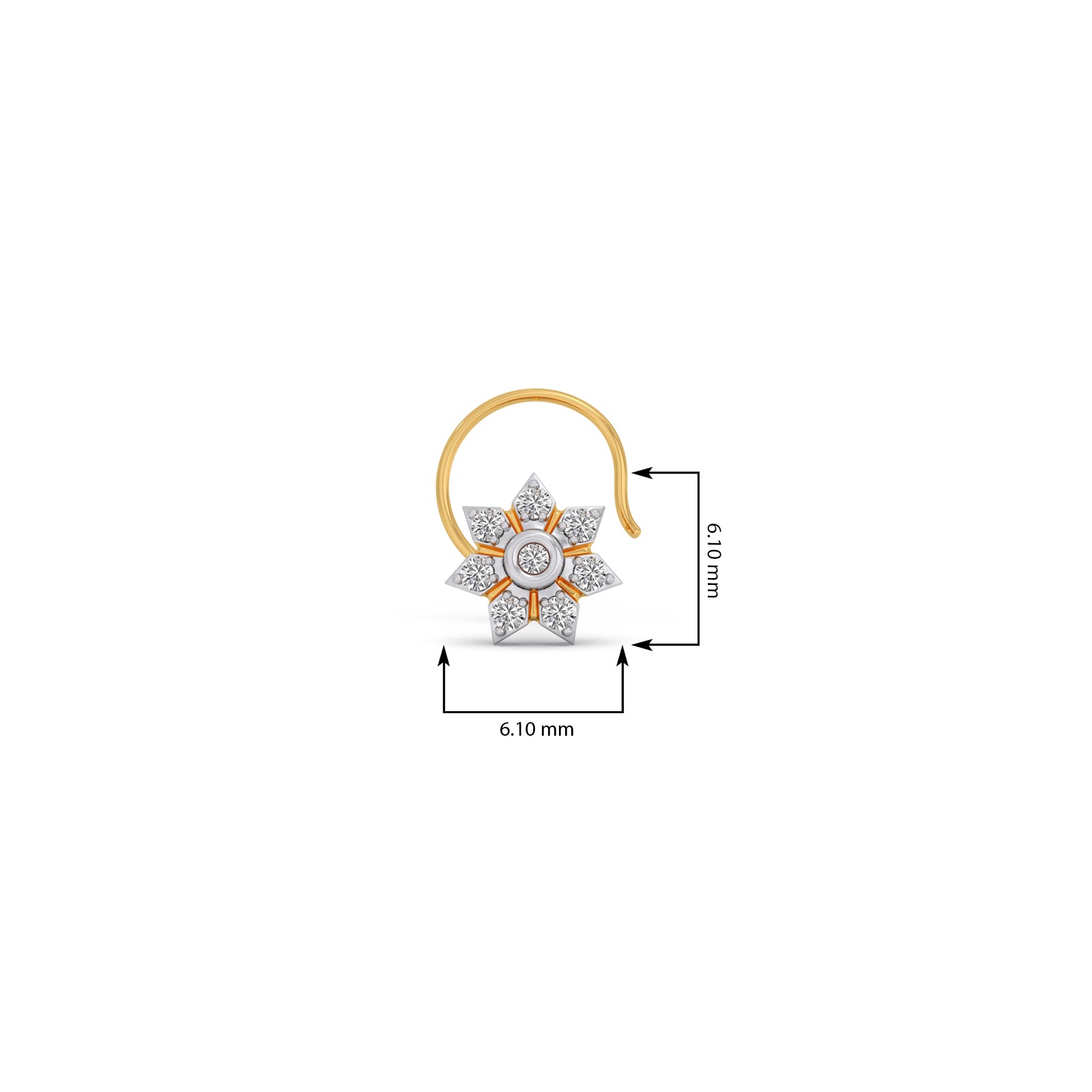 Corolla Round Diamond Nose Pin draws inspiration from delicate floral symmetry, featuring a radiant Round diamond at its heart. Elegant and refined, it adds a soft sparkle and timeless charm to everyday and festive wear alike.