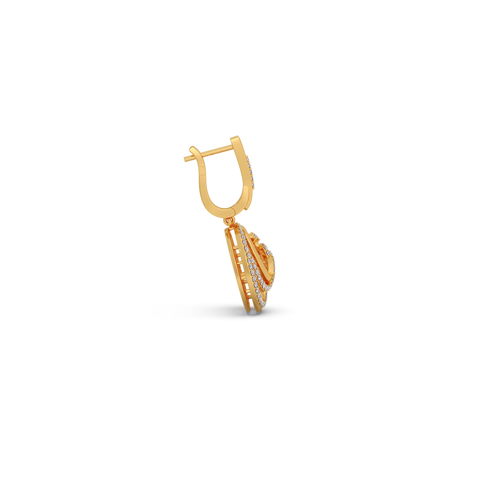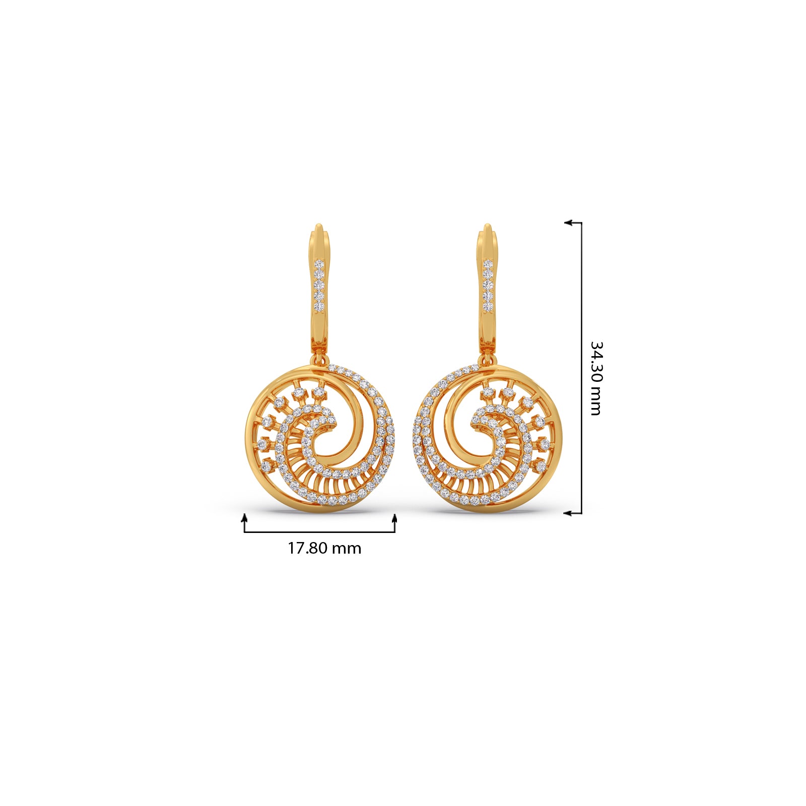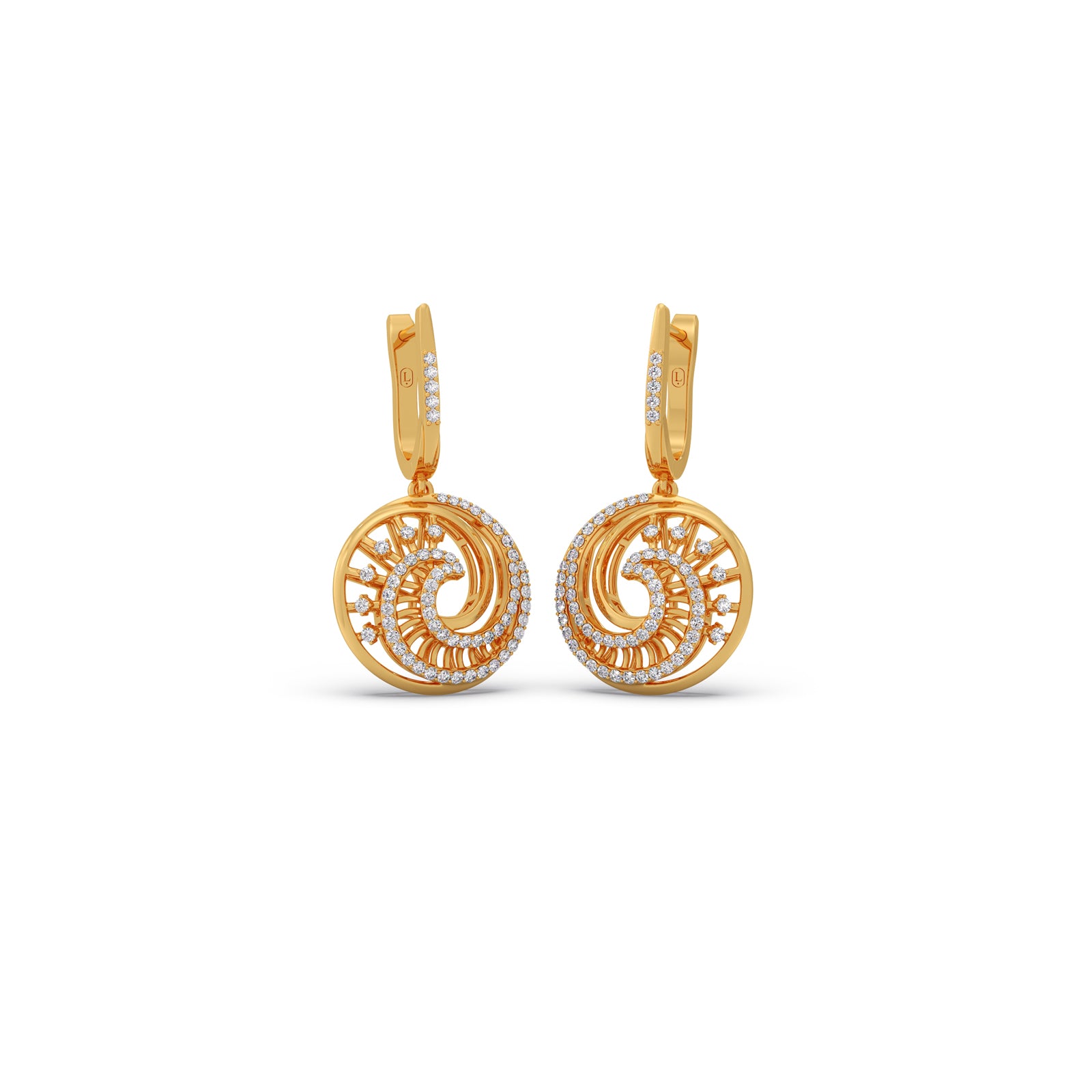 Each piece features a brilliant, pave-set crescent swirl spinning within a circular, golden halo. The intricate design and dynamic motion ensure maximum light reflection, giving you a sparkling, eye-catching glamour that's perfect for both day and evening wear.