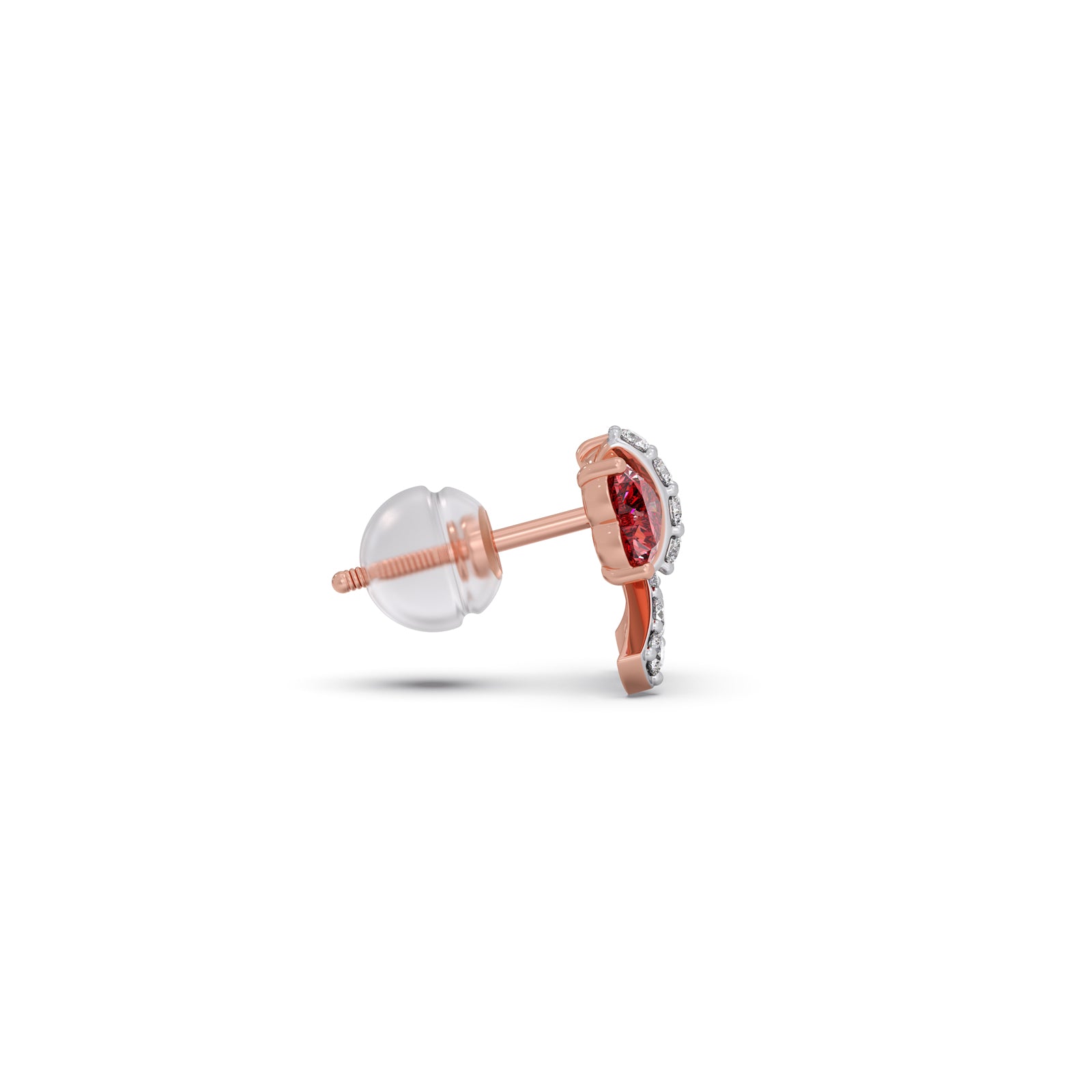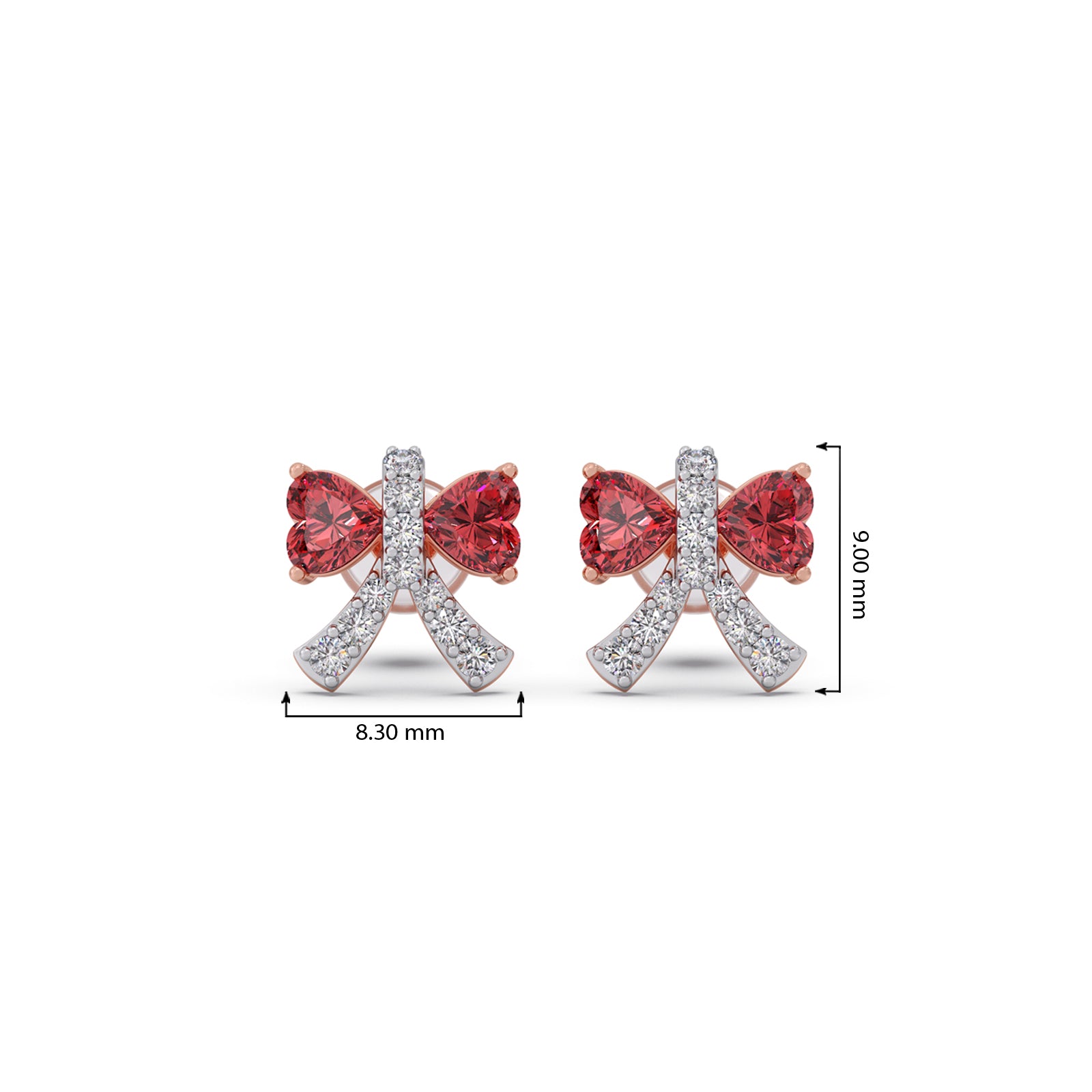 These elegant kid's stud earrings feature a ribbon motif with romantic heart elements. A Center of ribbon are crafted in prong-set brilliant round-cut diamonds, the loops of bow are formed by two red heart gemstones. This earrings making them suitable for both everyday wear and special occasions.