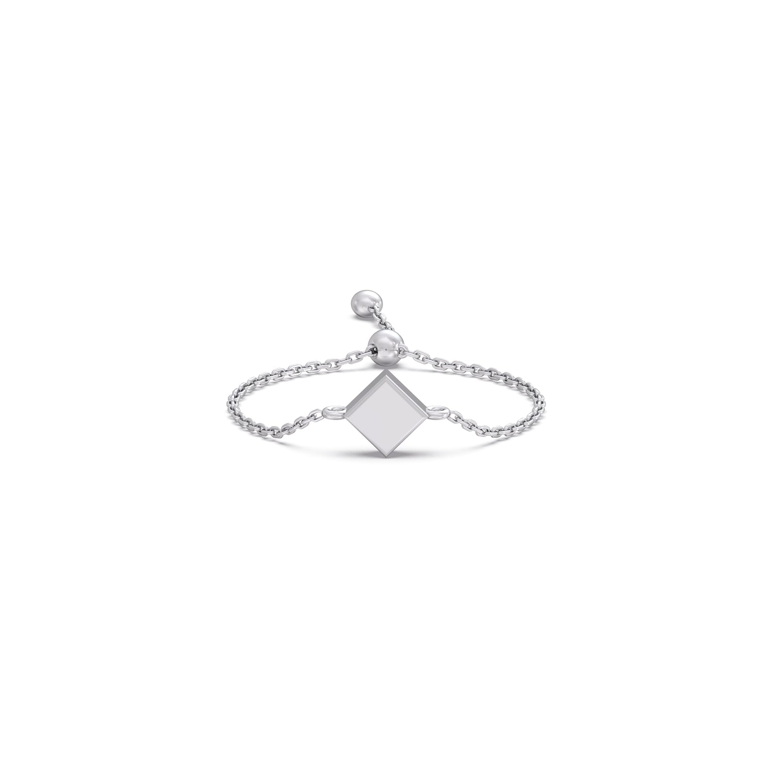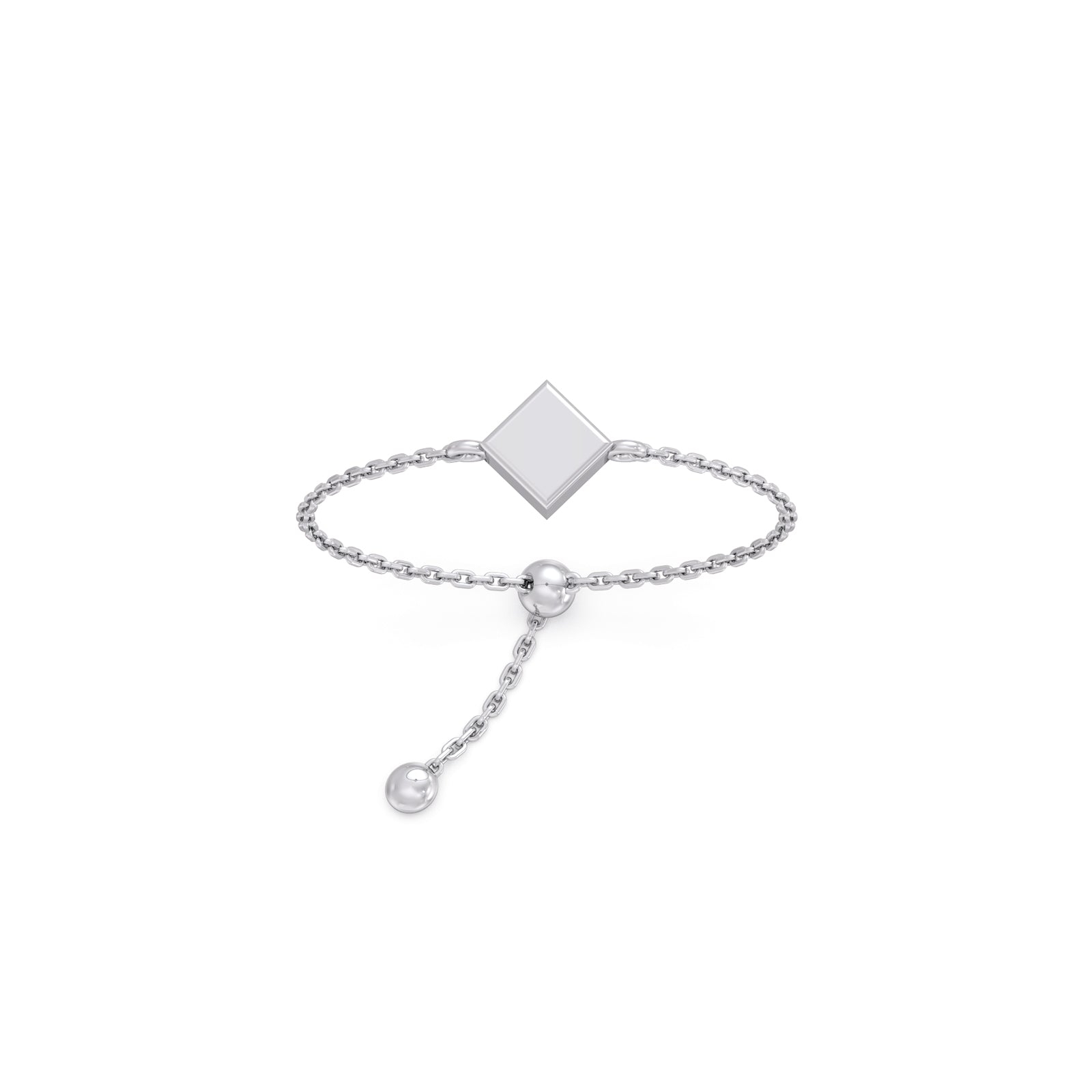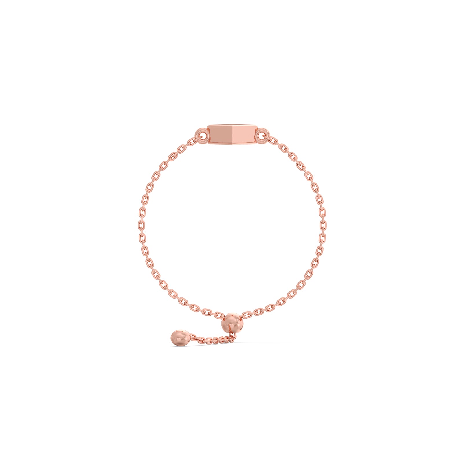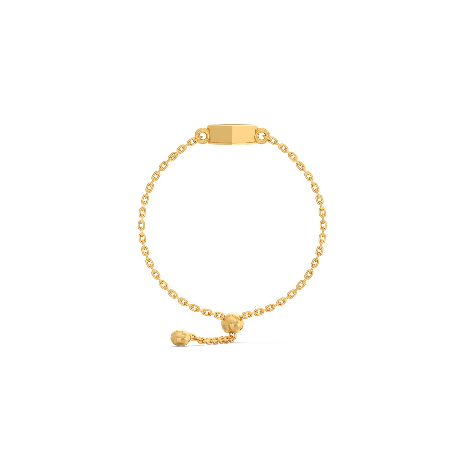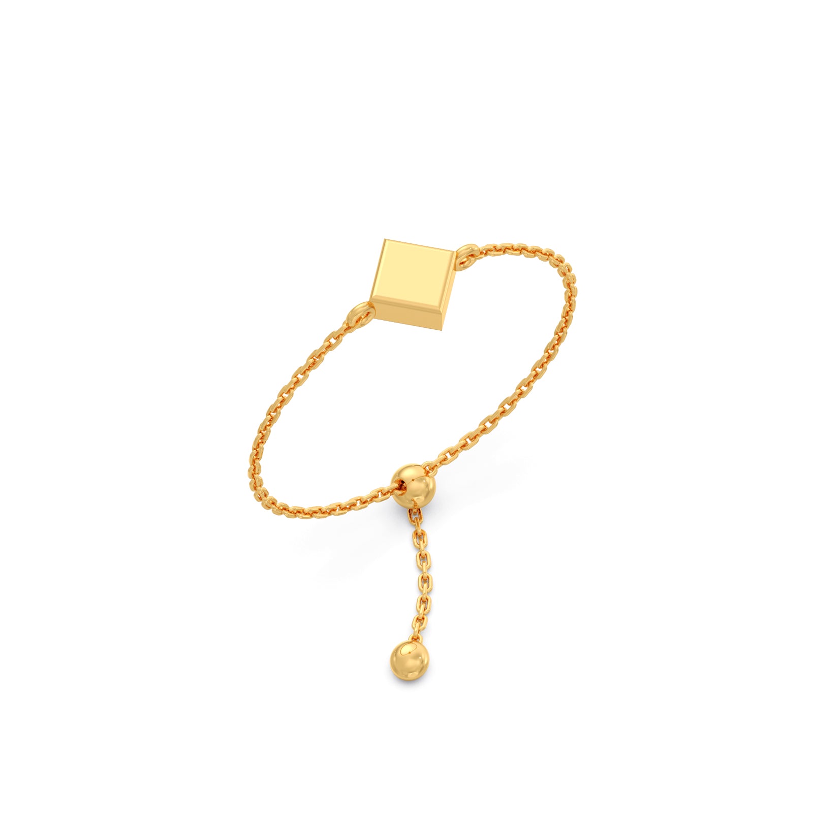 This plain gold ring features a Cuboid Charm at center of ring connected with adjustable bolo flexi chain. This ring represents the delicate lightweight and comfortable for daily wear.