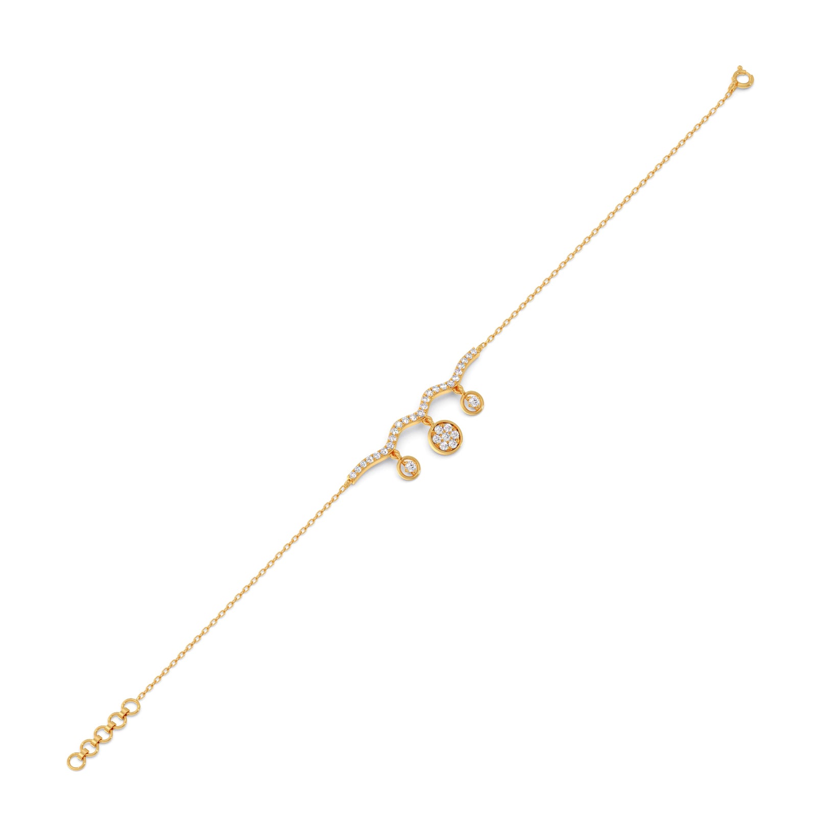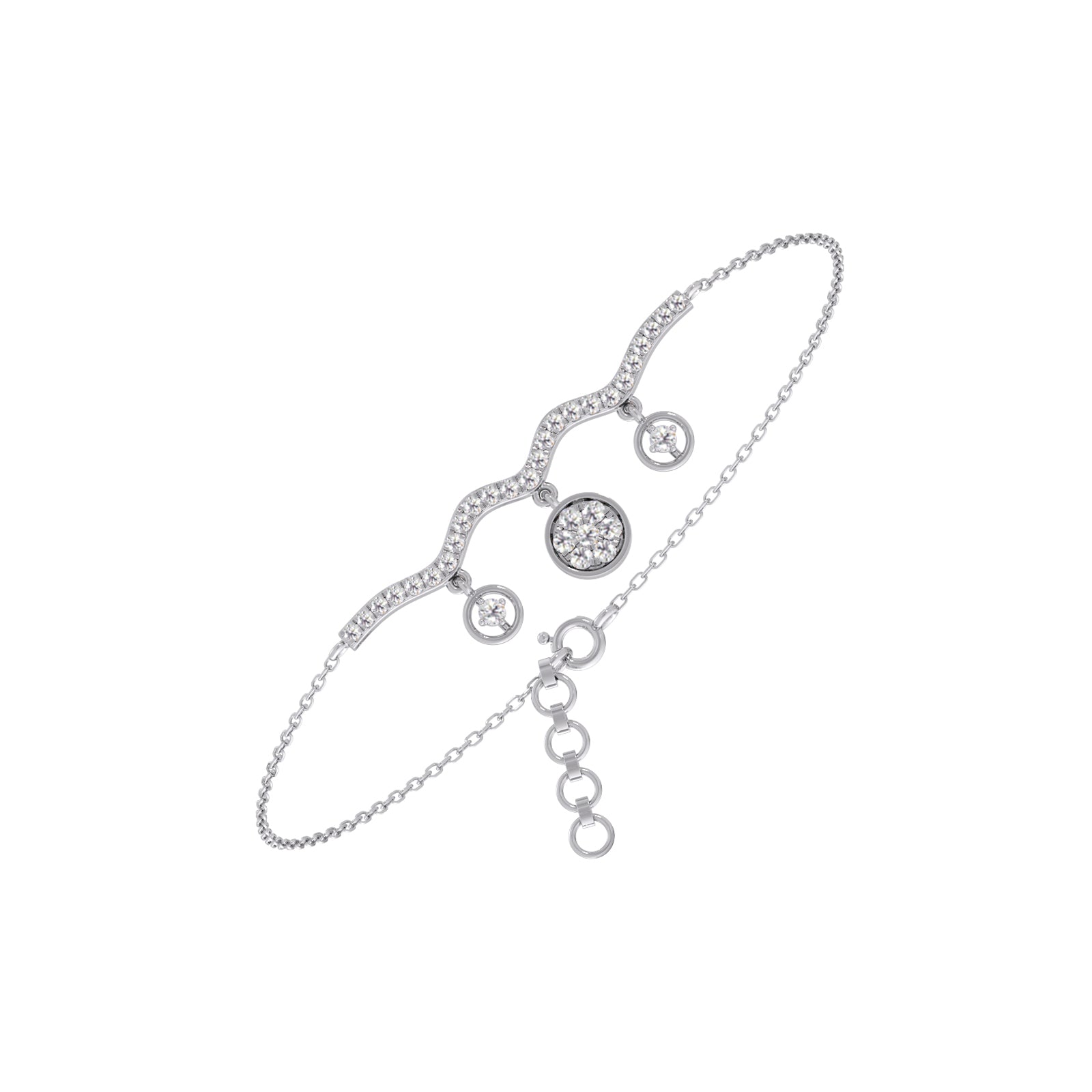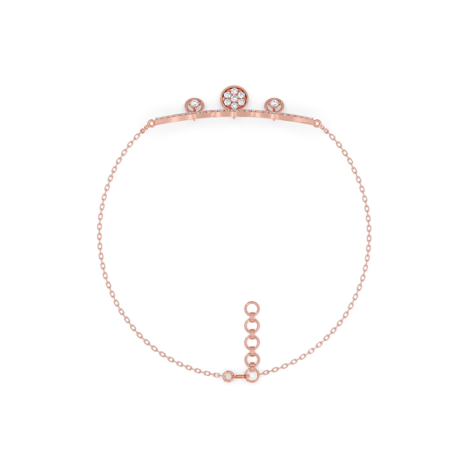 A graceful bracelet featuring a flowing curve adorned with Round Diamonds, capturing the soft glow of twilight. Linked with a delicate chain, it evokes elegance in motion—perfect for both everyday sophistication and evening charm. A subtle statement of light, movement, and timeless beauty.
