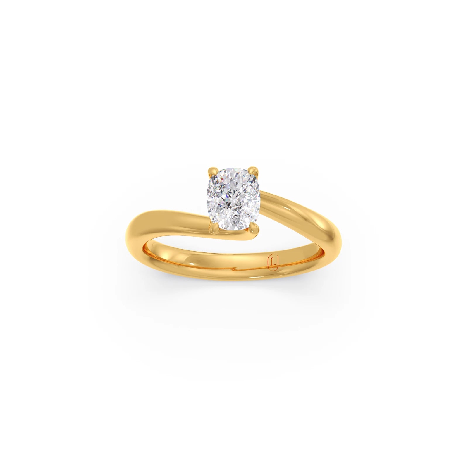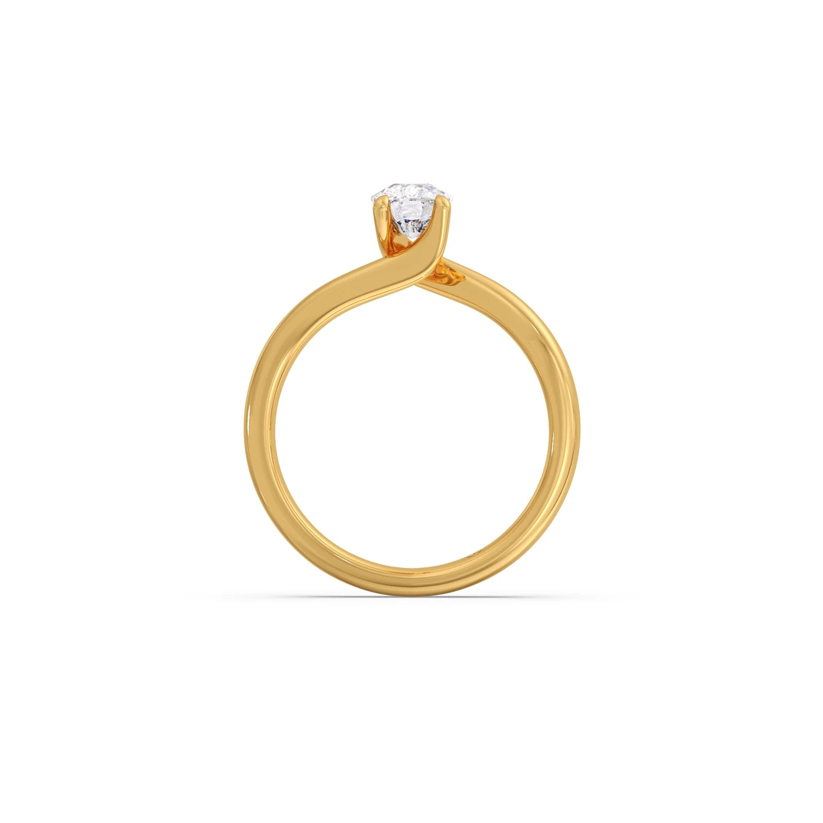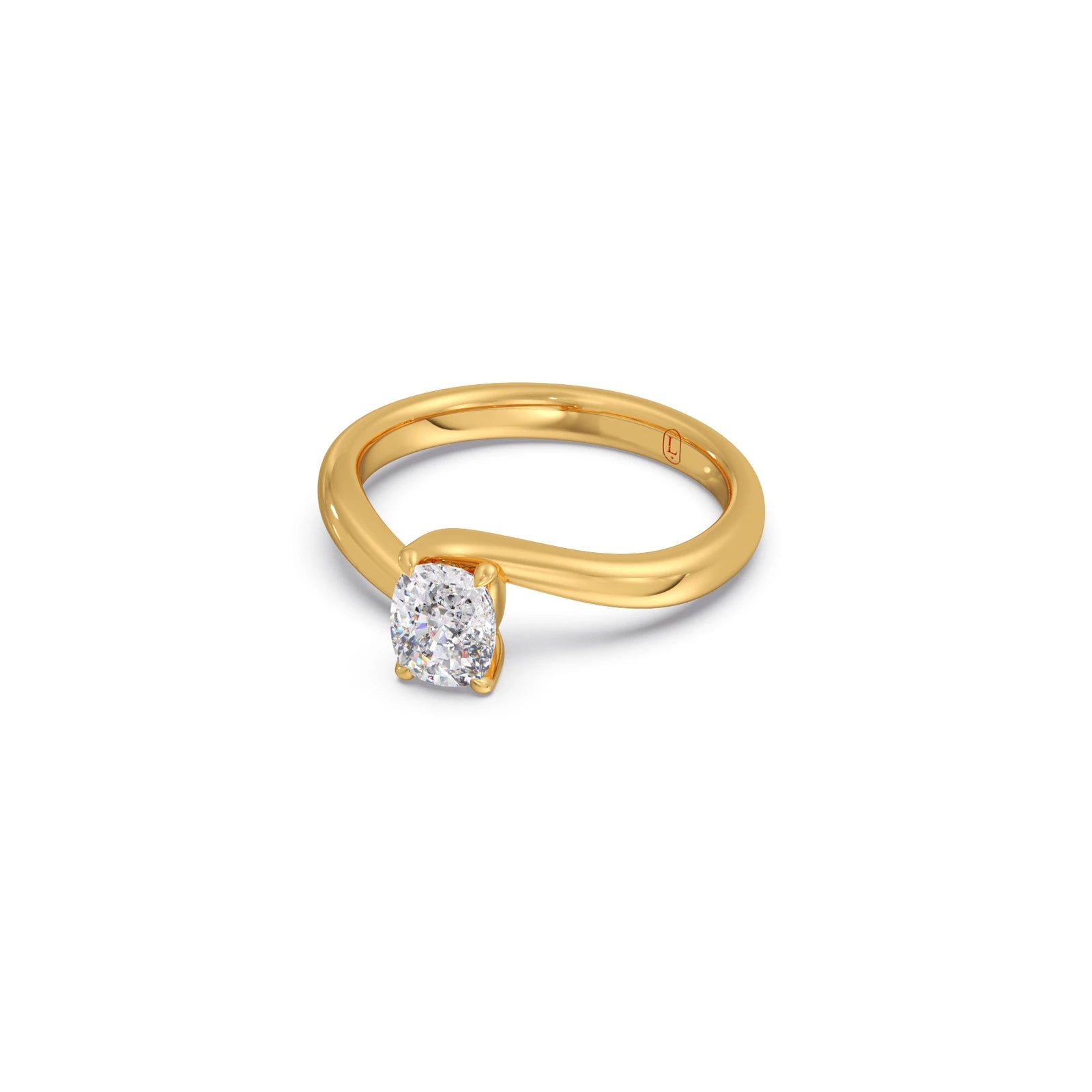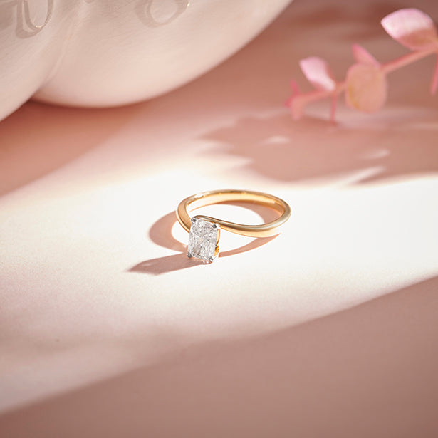This captivating engagement ring features a dazzling radiant-cut diamond, renowned for its brilliant sparkle. The modern solitaire setting is elevated by a graceful twist design in the band, symbolizing intertwined paths. This unique and elegant ring offers a contemporary take on a classic, perfect for a truly special proposal.