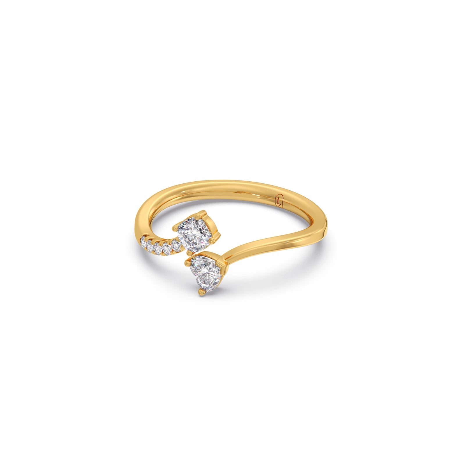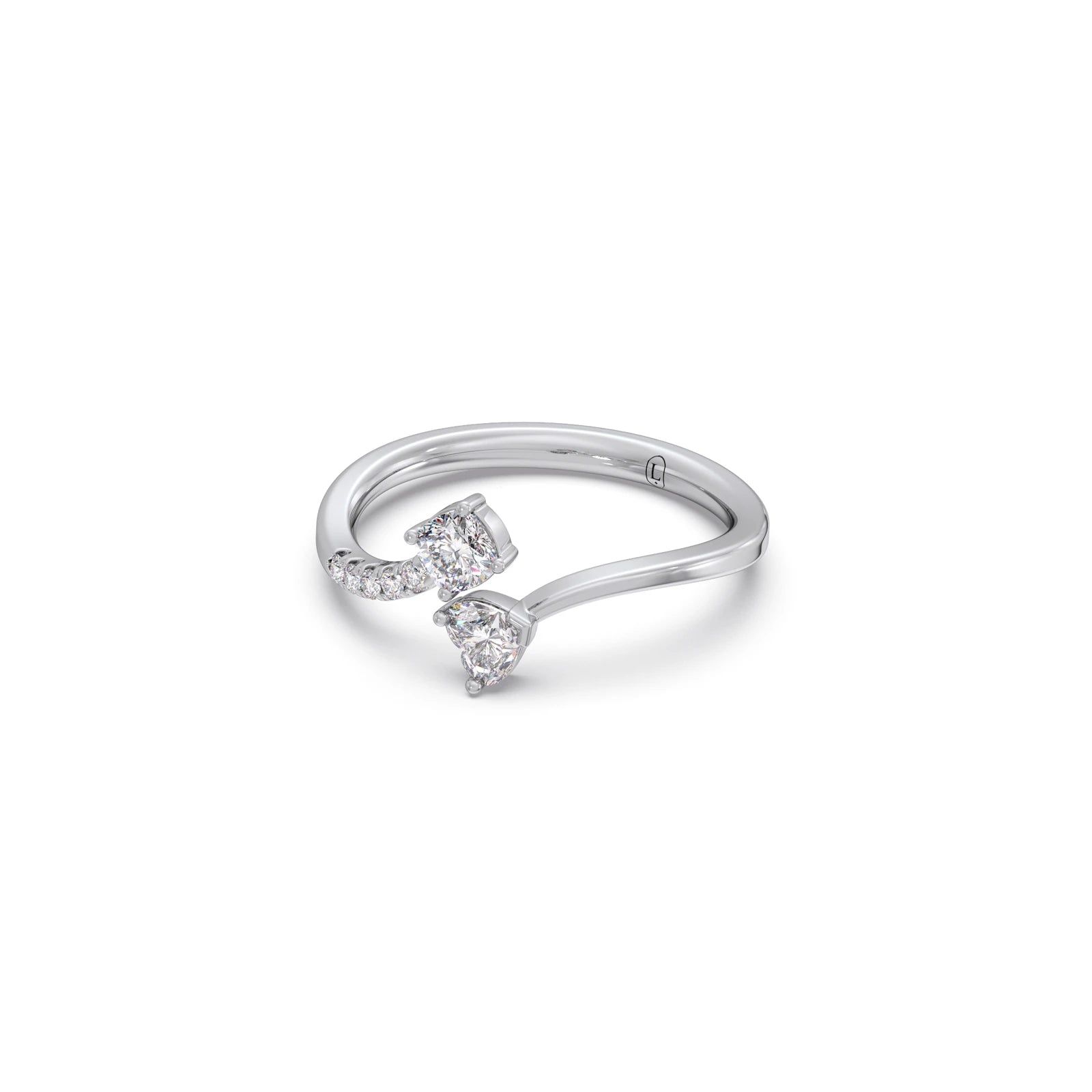 "Unite your love story with this captivating Toi et Moi ring, showcasing a harmonious trio of diamond cuts: a timeless cushion, a romantic heart, and a brilliant round. This exquisite piece symbolizes two souls beautifully intertwined, with each diamond shape adding unique sparkle and meaning. A truly distinctive and elegant testament to your bond."