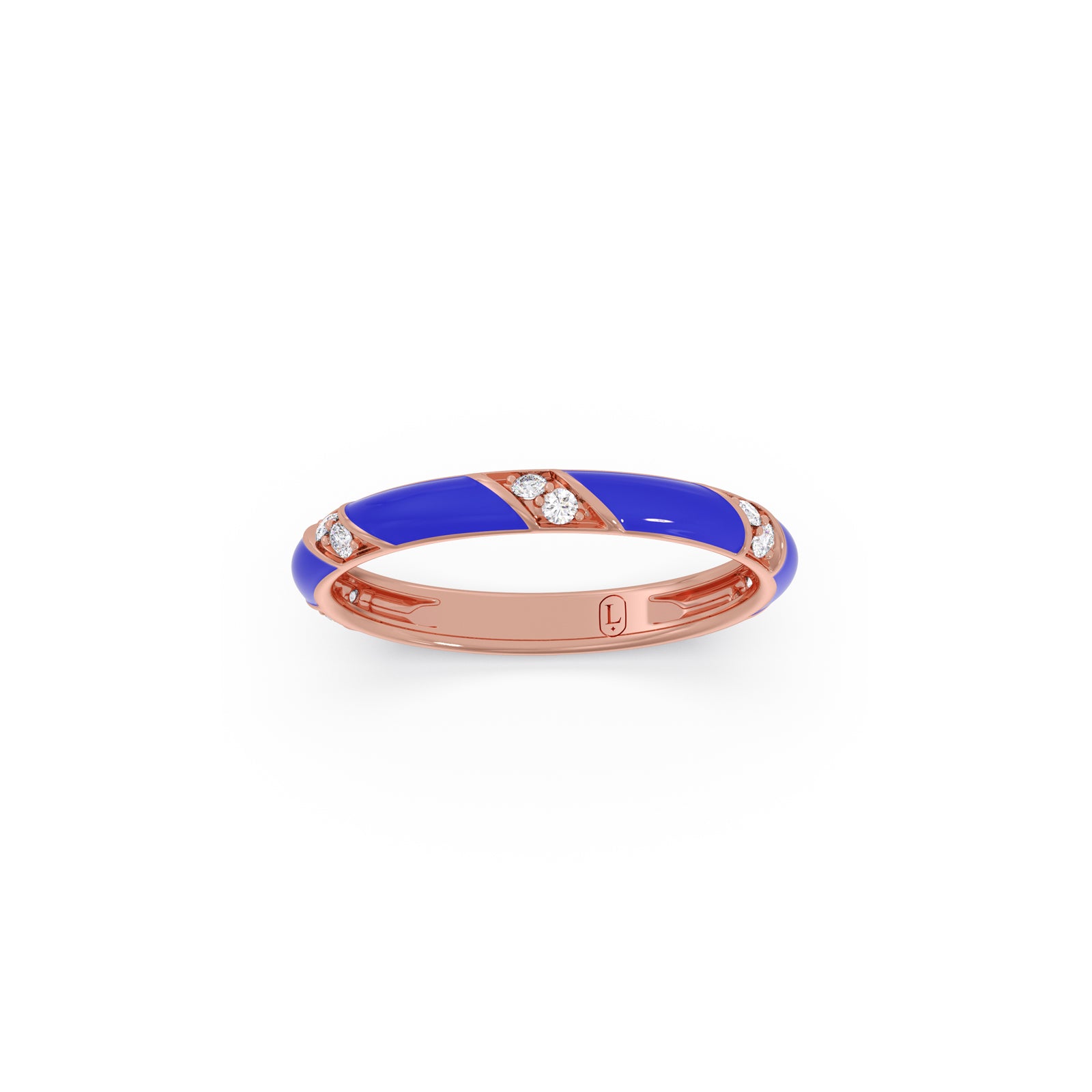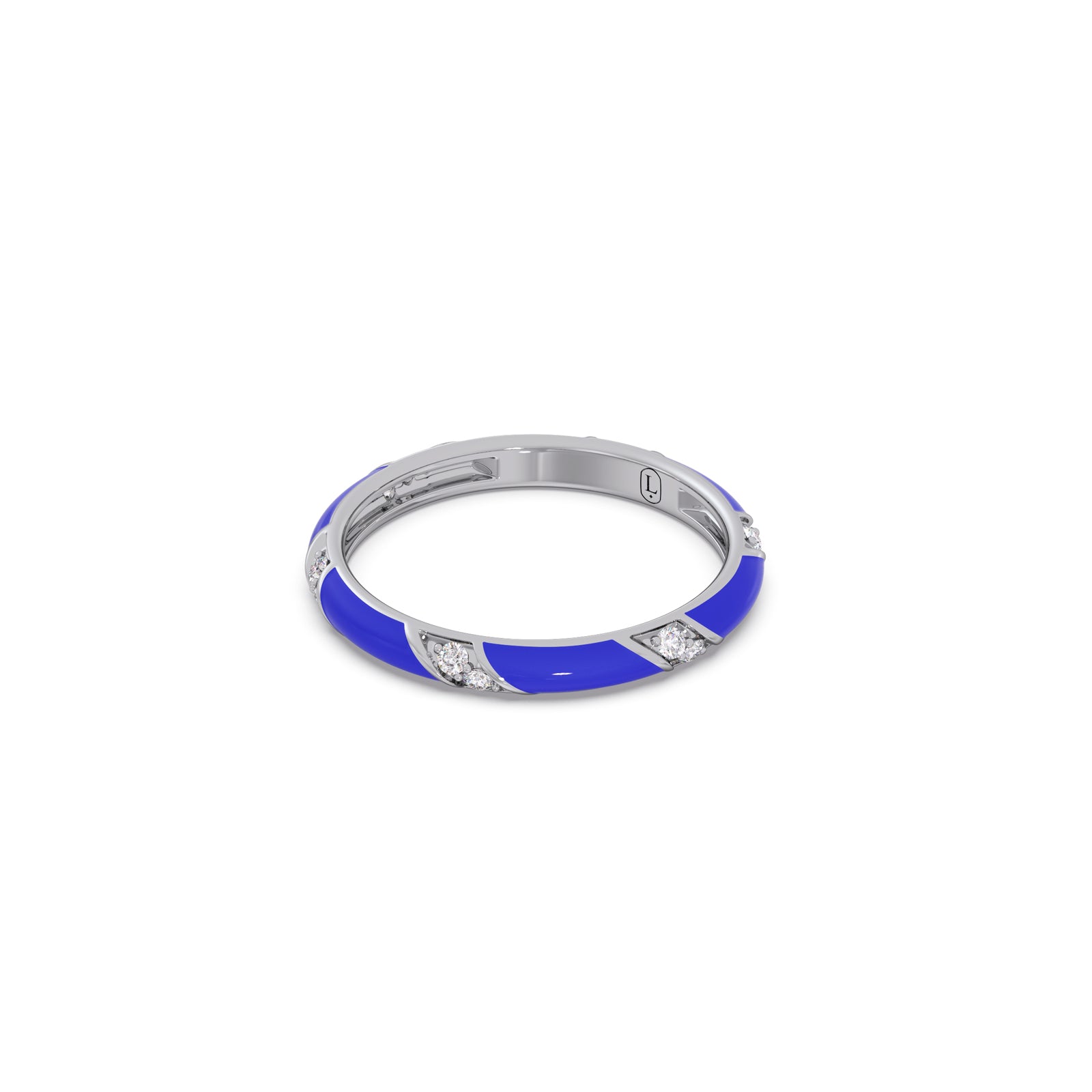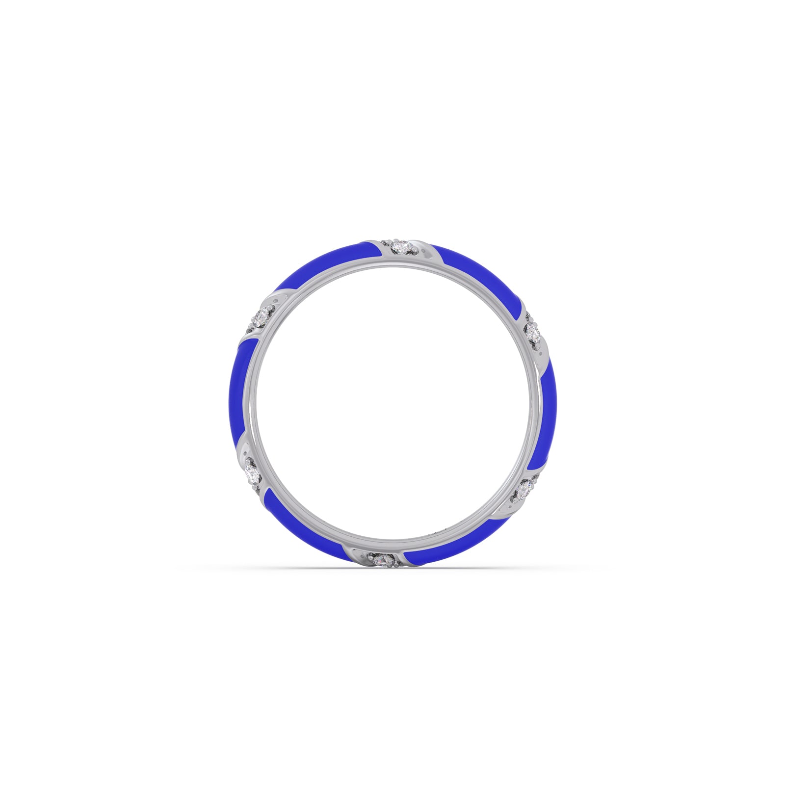 This band is a masterclass in modern luxury, featuring a seamless inlay of deep royal blue enamel. Slender diagonal bars of gold break the blue horizon, each row pair of brilliant round-cut diamonds that catch the light like stars in a midnight sky. Features a smooth, comfort fit for effortless daily wear.