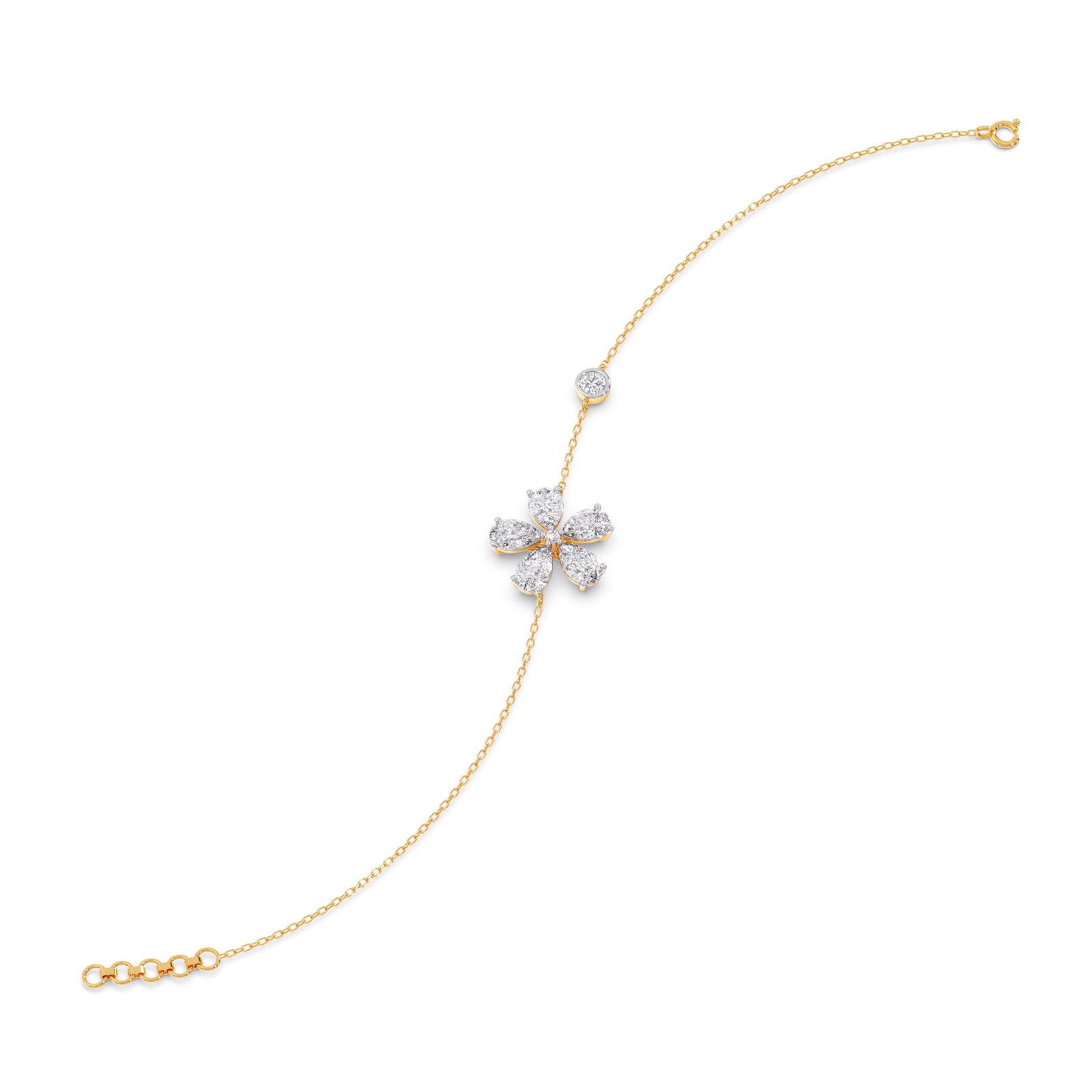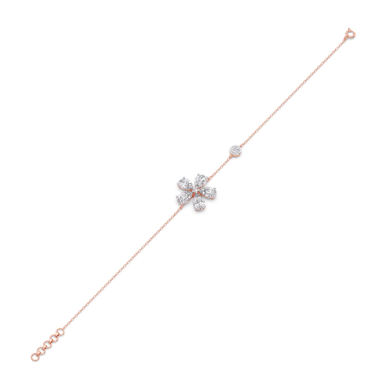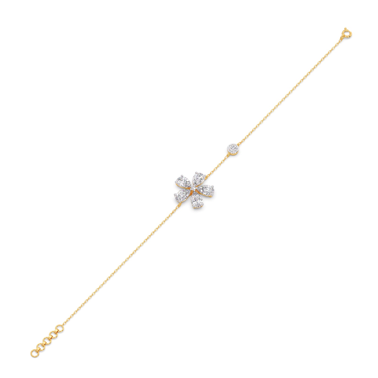 A delicate, slender chain bracelet features a central floral-shaped diamond cluster. The intricate design, possibly with pave-set diamonds, creates a subtle sparkle. Small accent diamonds flank the floral motif, adding to its refined elegance. The bracelet's minimalist style offers a touch of feminine charm.