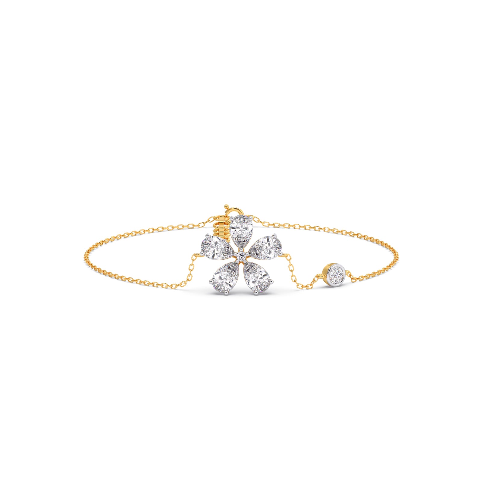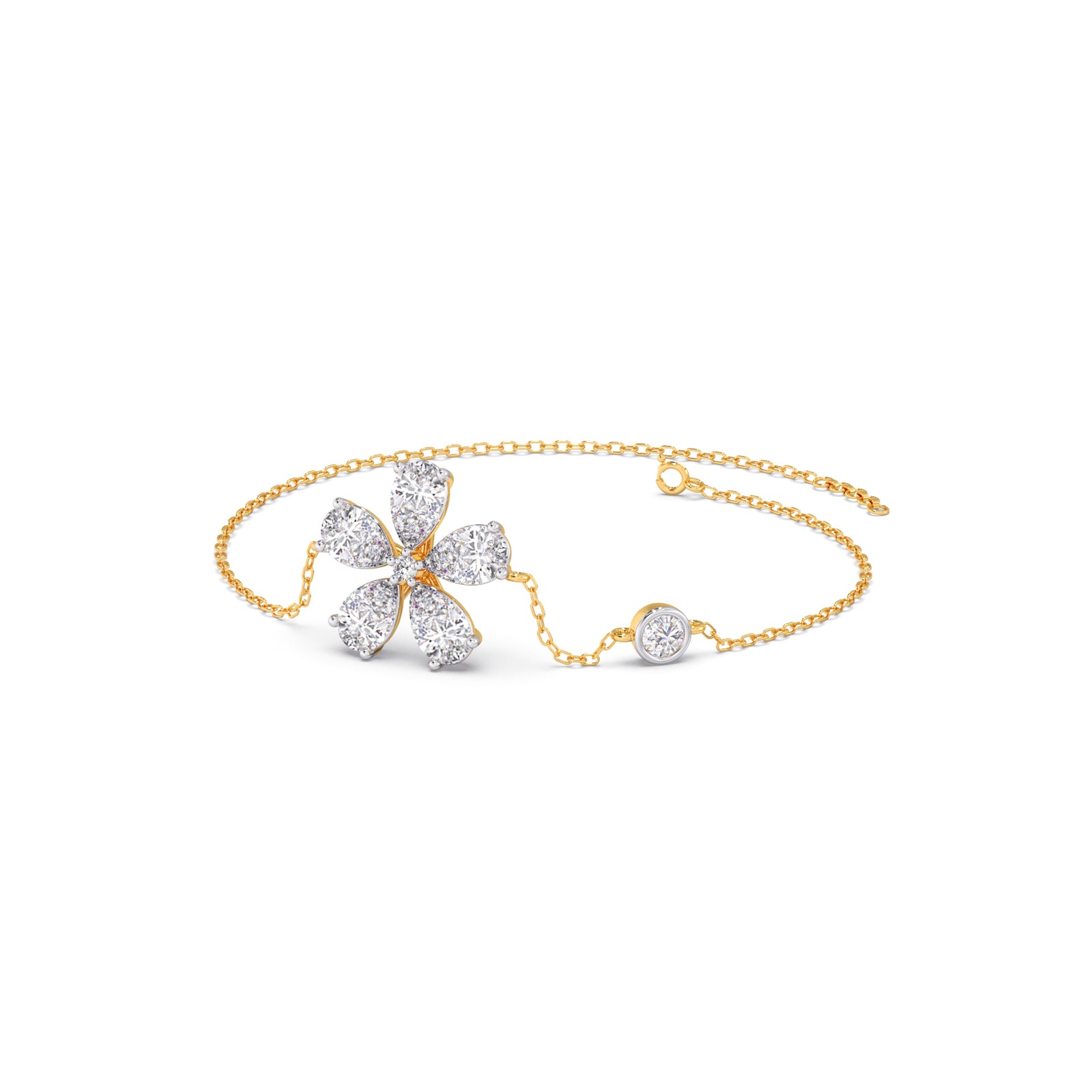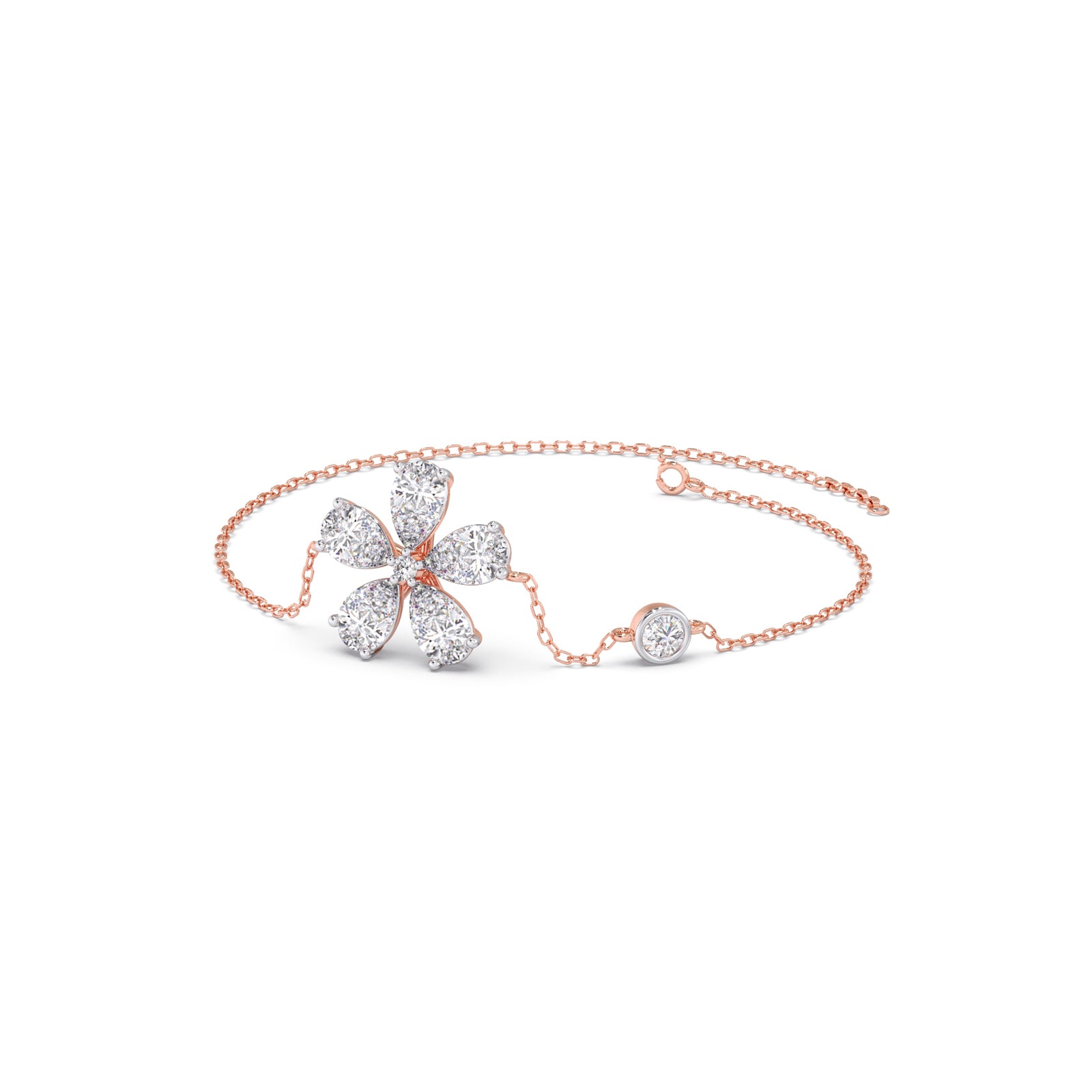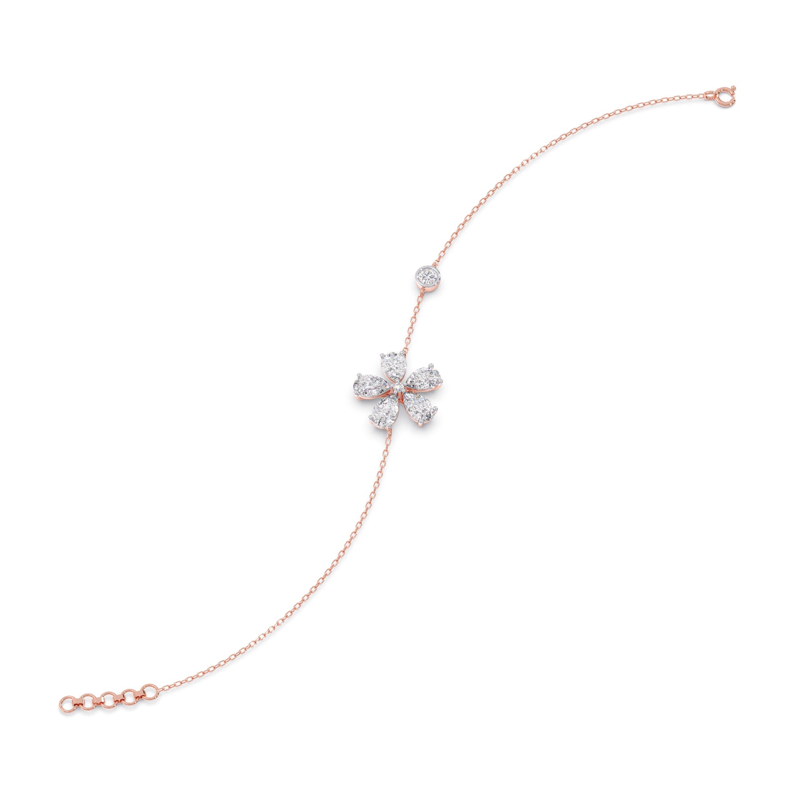 A delicate, slender chain bracelet features a central floral-shaped diamond cluster. The intricate design, possibly with pave-set diamonds, creates a subtle sparkle. Small accent diamonds flank the floral motif, adding to its refined elegance. The bracelet's minimalist style offers a touch of feminine charm.