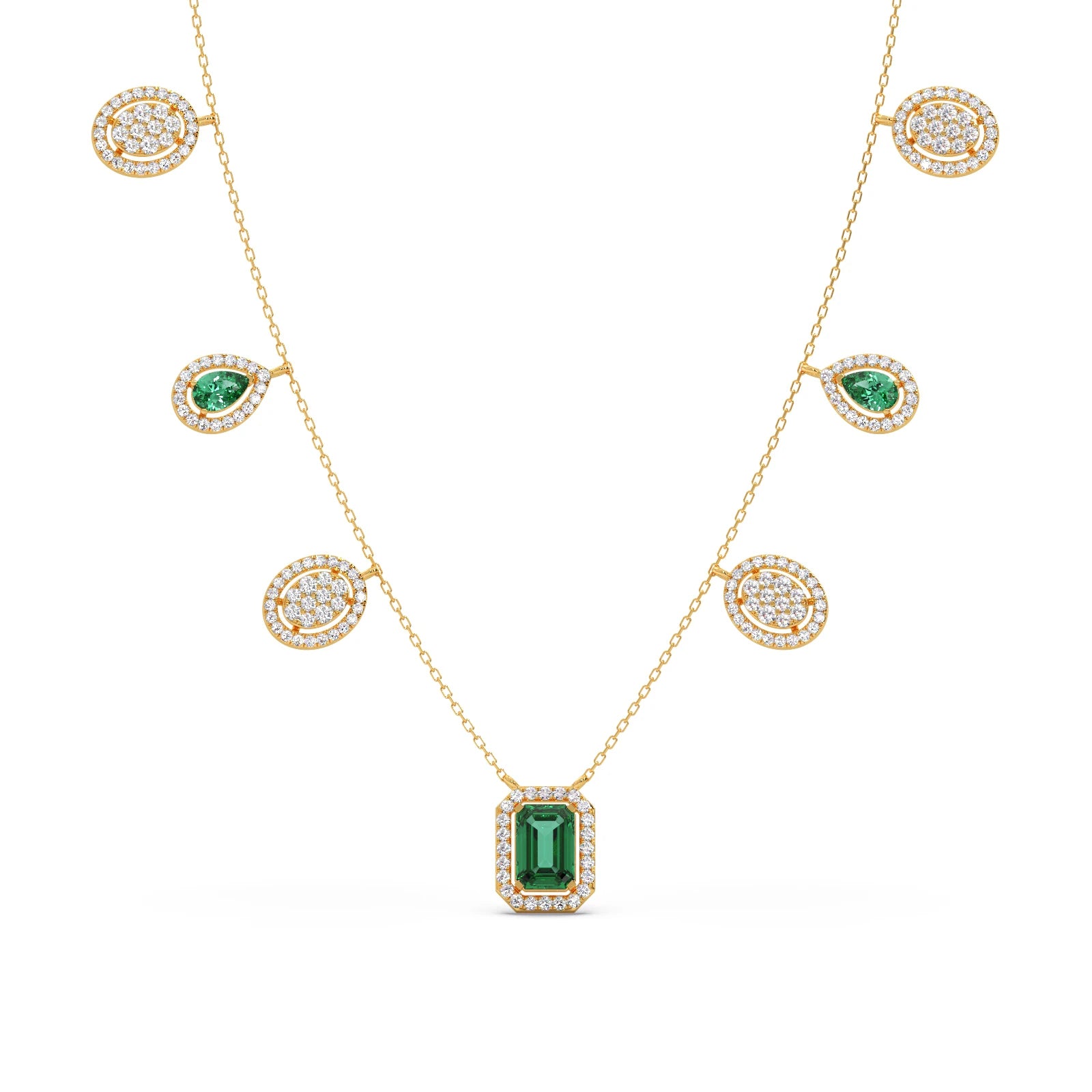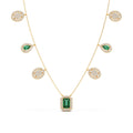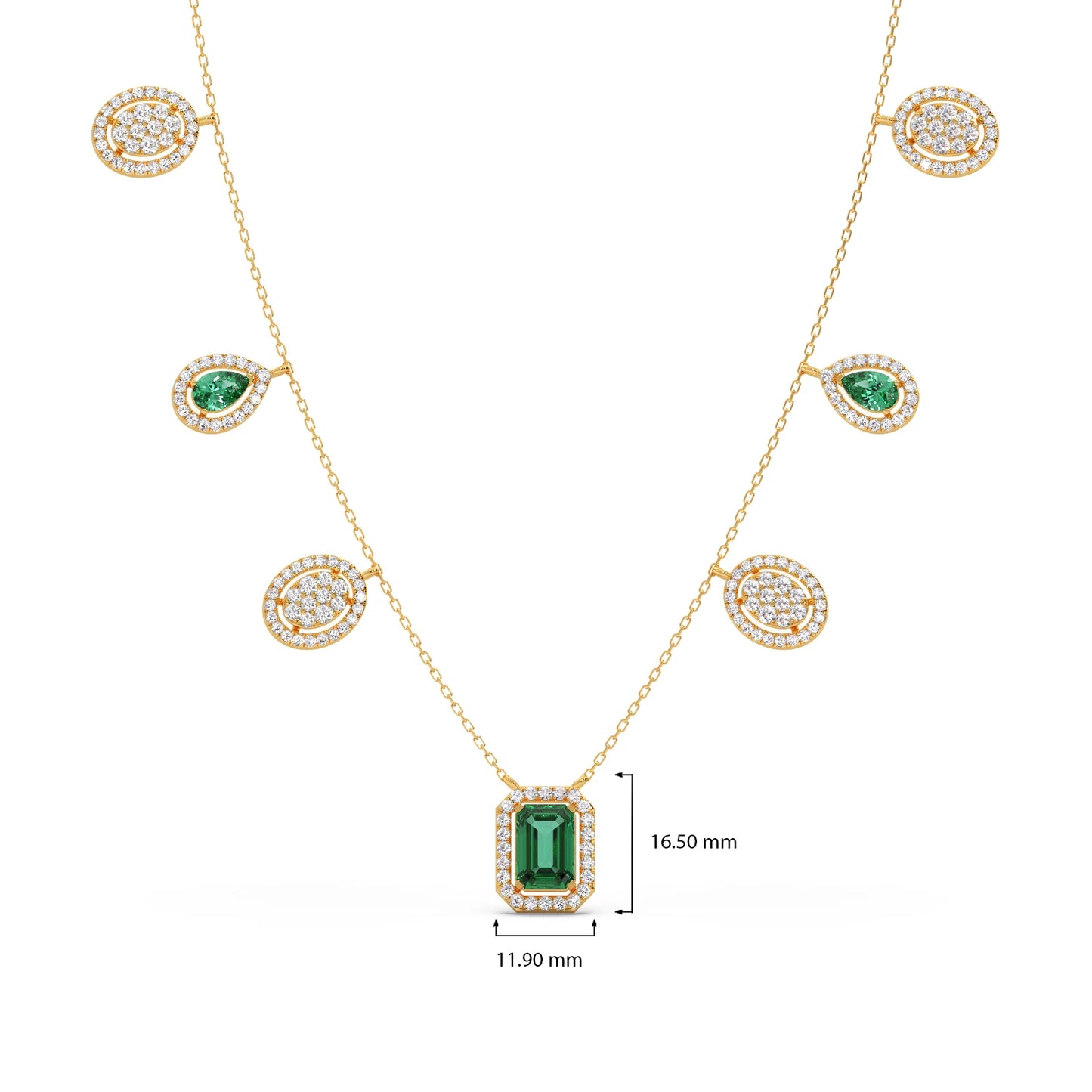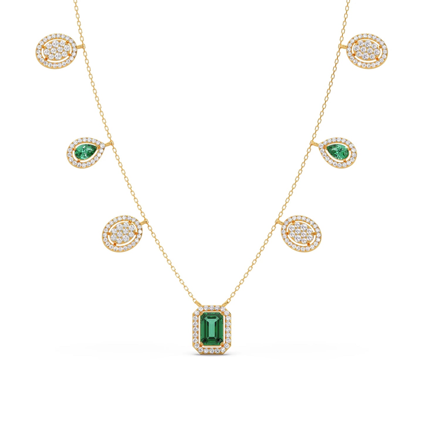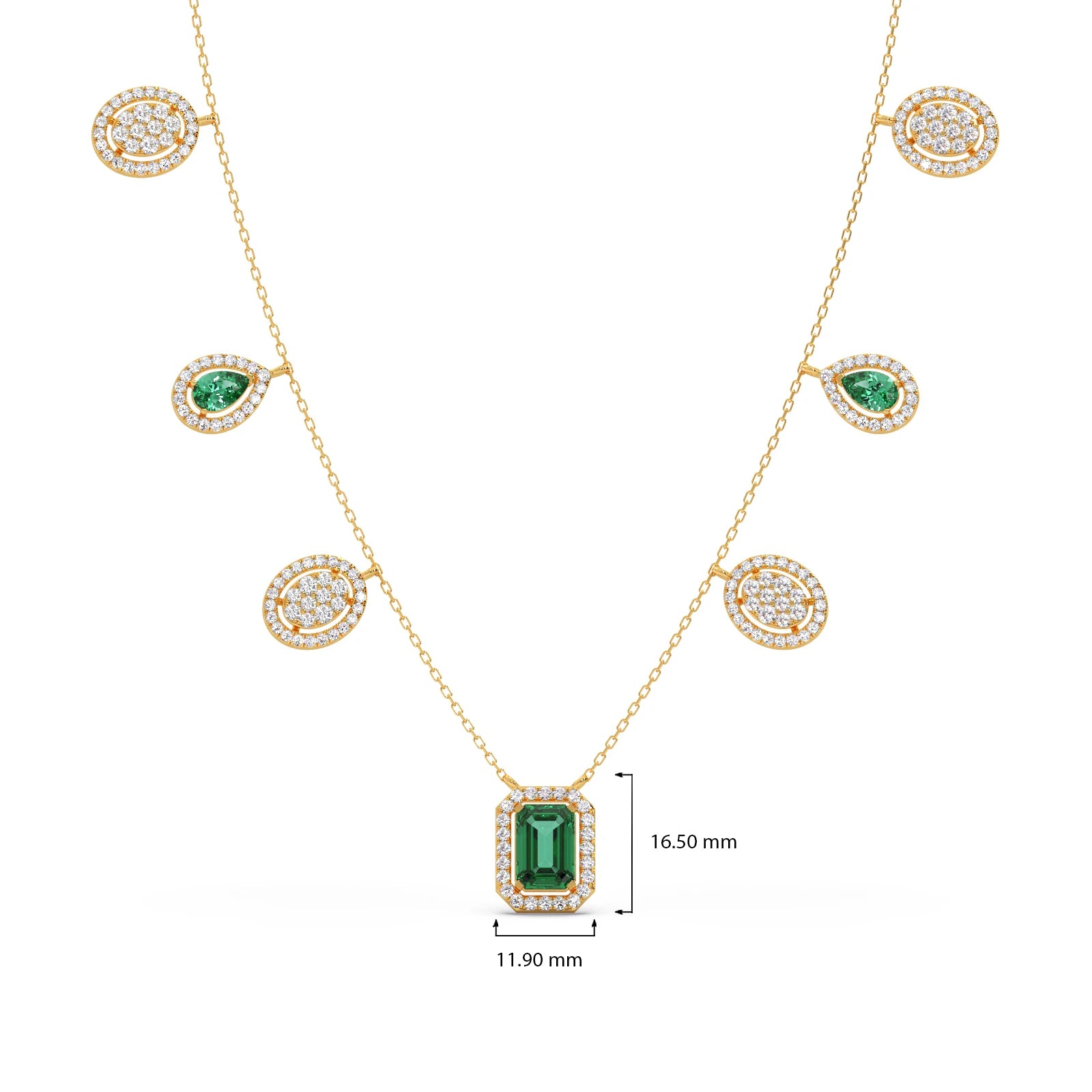 Indulge in elegance with this captivating necklace, featuring a brilliant diamond accenting a vibrant emerald-cut green gemstone dangle. Set in gleaming gold, this piece exudes sophistication and timeless charm. A perfect statement for any occasion, adding a touch of color and sparkle to your look.