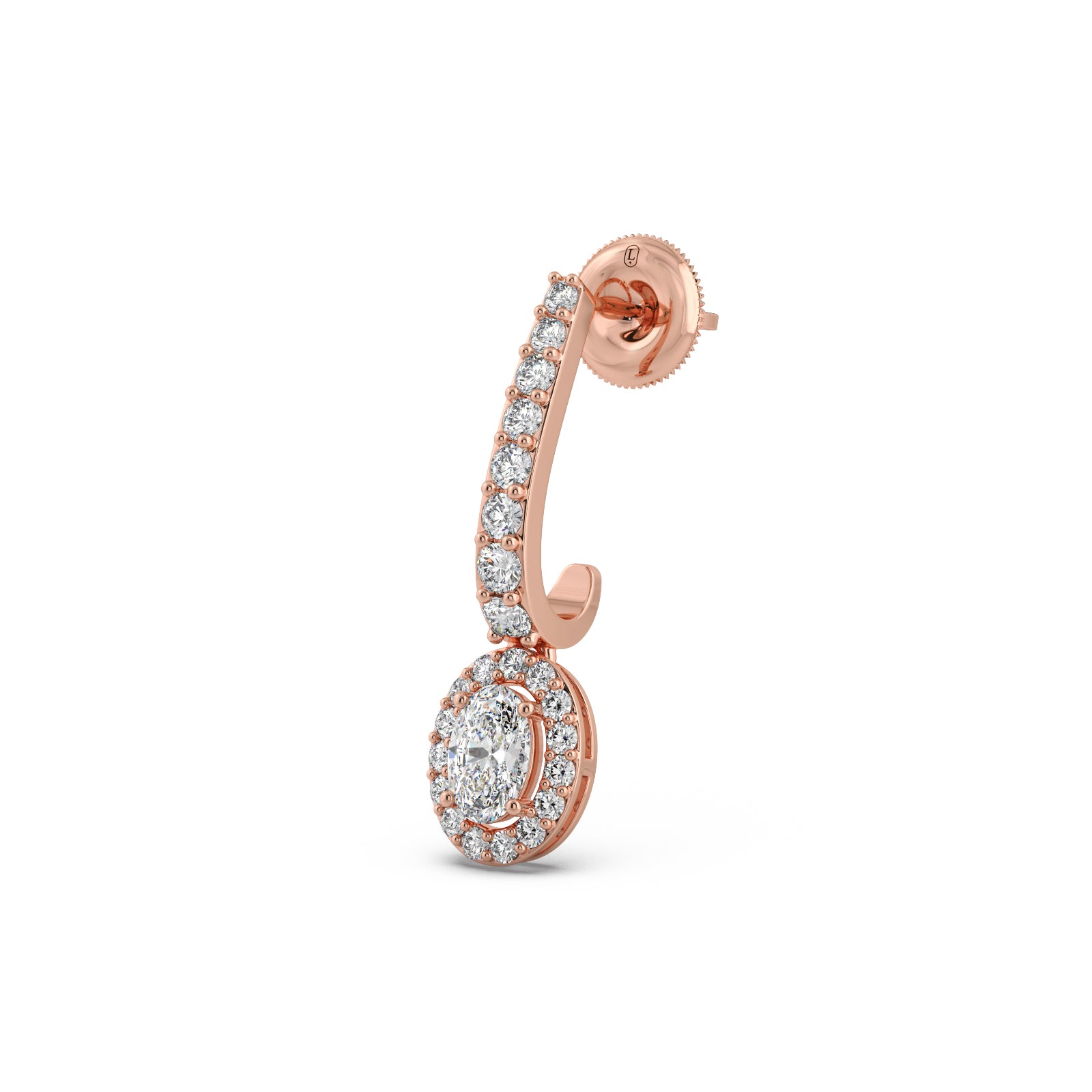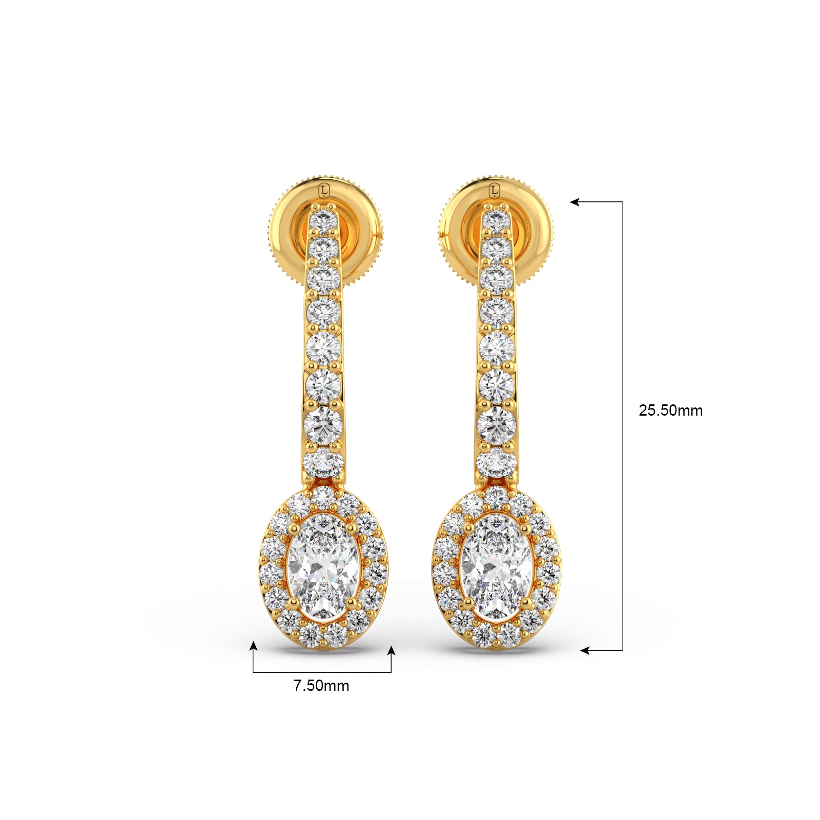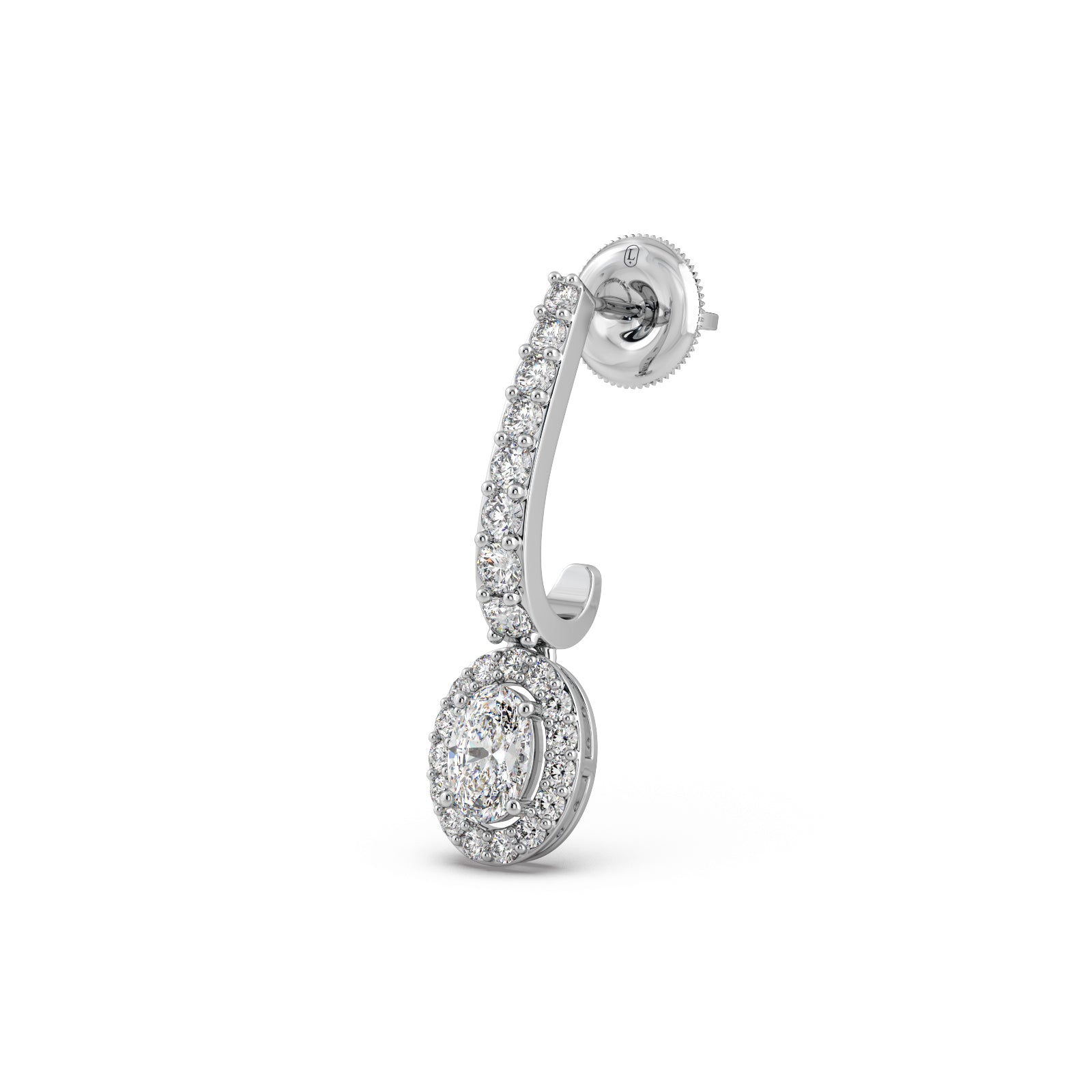 Radiate sophistication with our Diamond Dangle Earrings. These exquisite earrings are crafted in lustrous gold, featuring a gracefully curved line of pave-set diamonds that beautifully suspends a stunning oval-cut diamond, encircled by a brilliant halo. This design maximizes sparkle and elegance, making them a perfect statement piece for any special occasion.