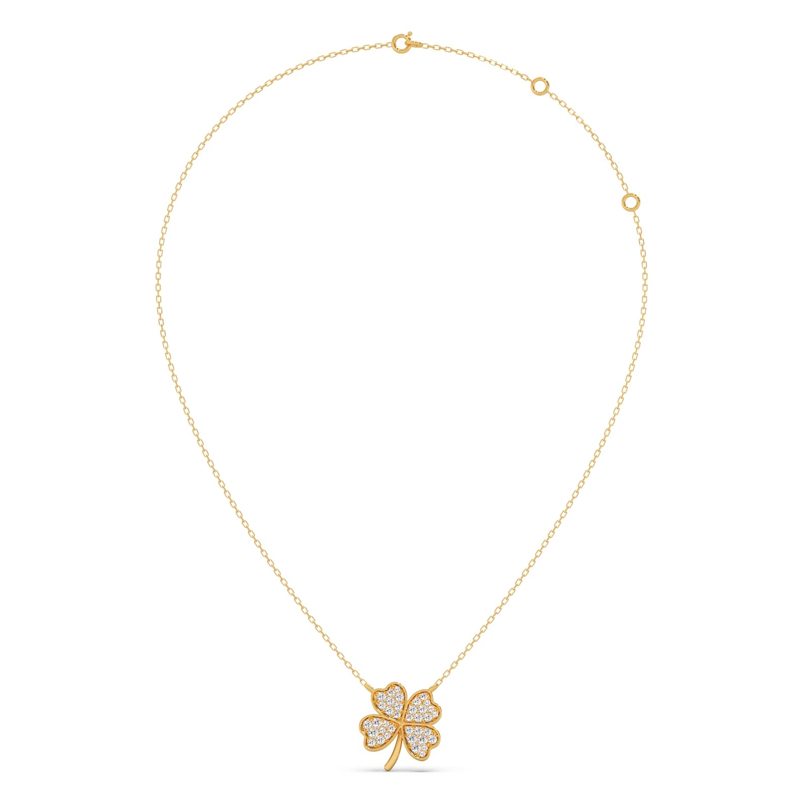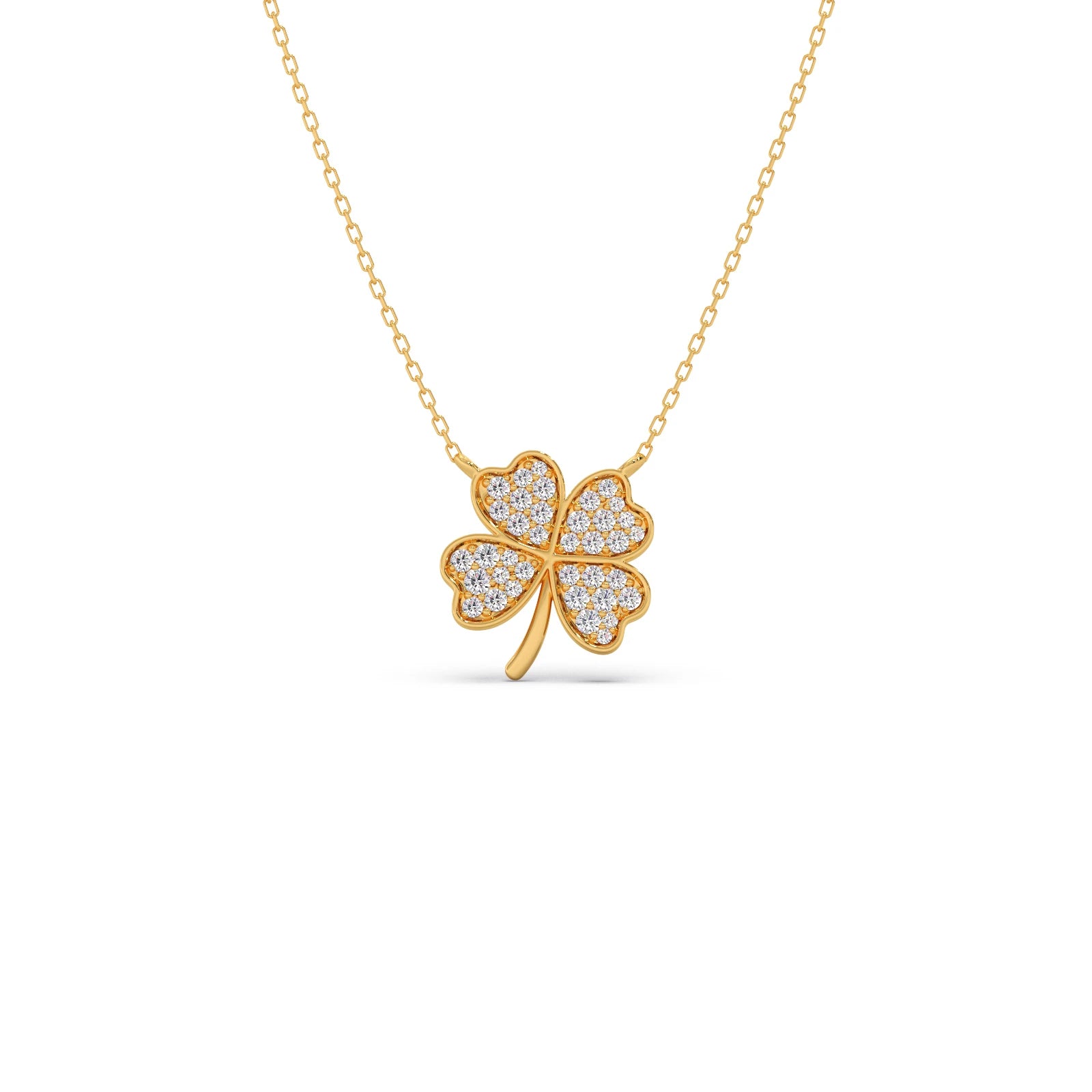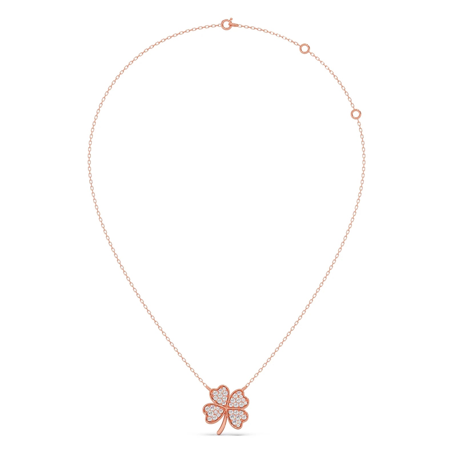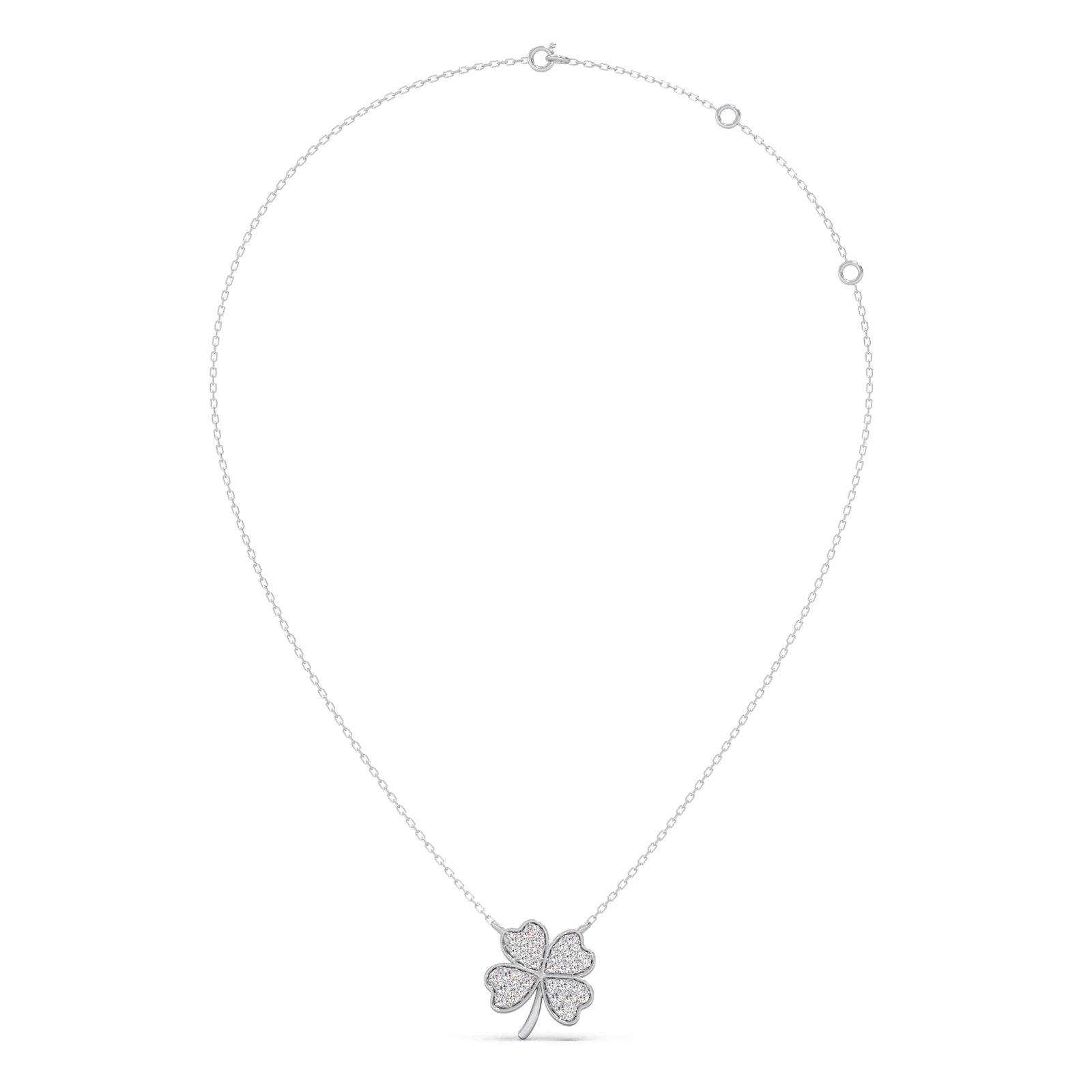 This enchanting pendant blends floral grace with the charm of good fortune. A delicate diamond flower forms the core of the clover, surrounded by sparkling petals. Its intricate design radiates elegance and symbolism, making it a cherished piece. Perfect for everyday wear or special occasions, this pendant adds a touch of whimsy and brilliance.