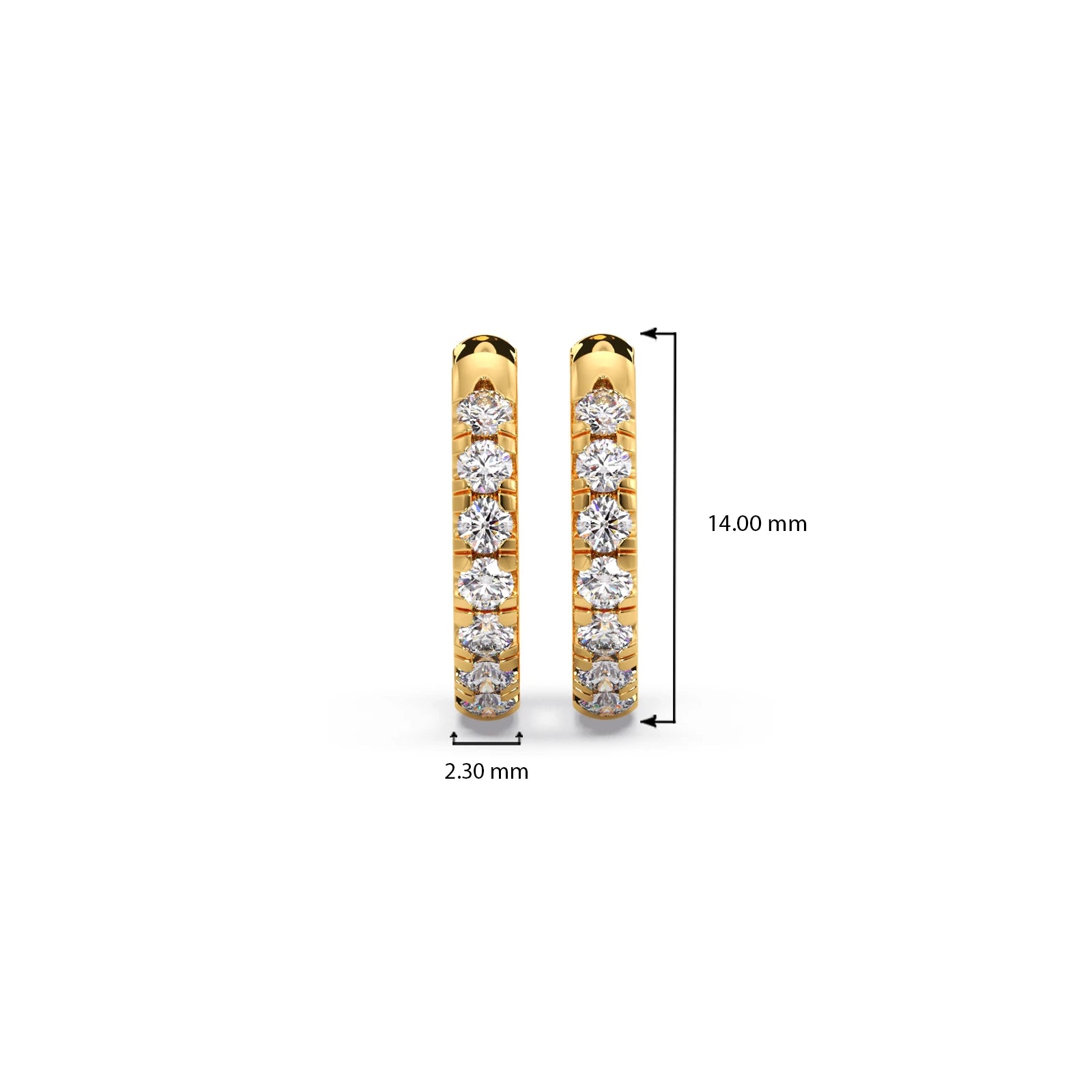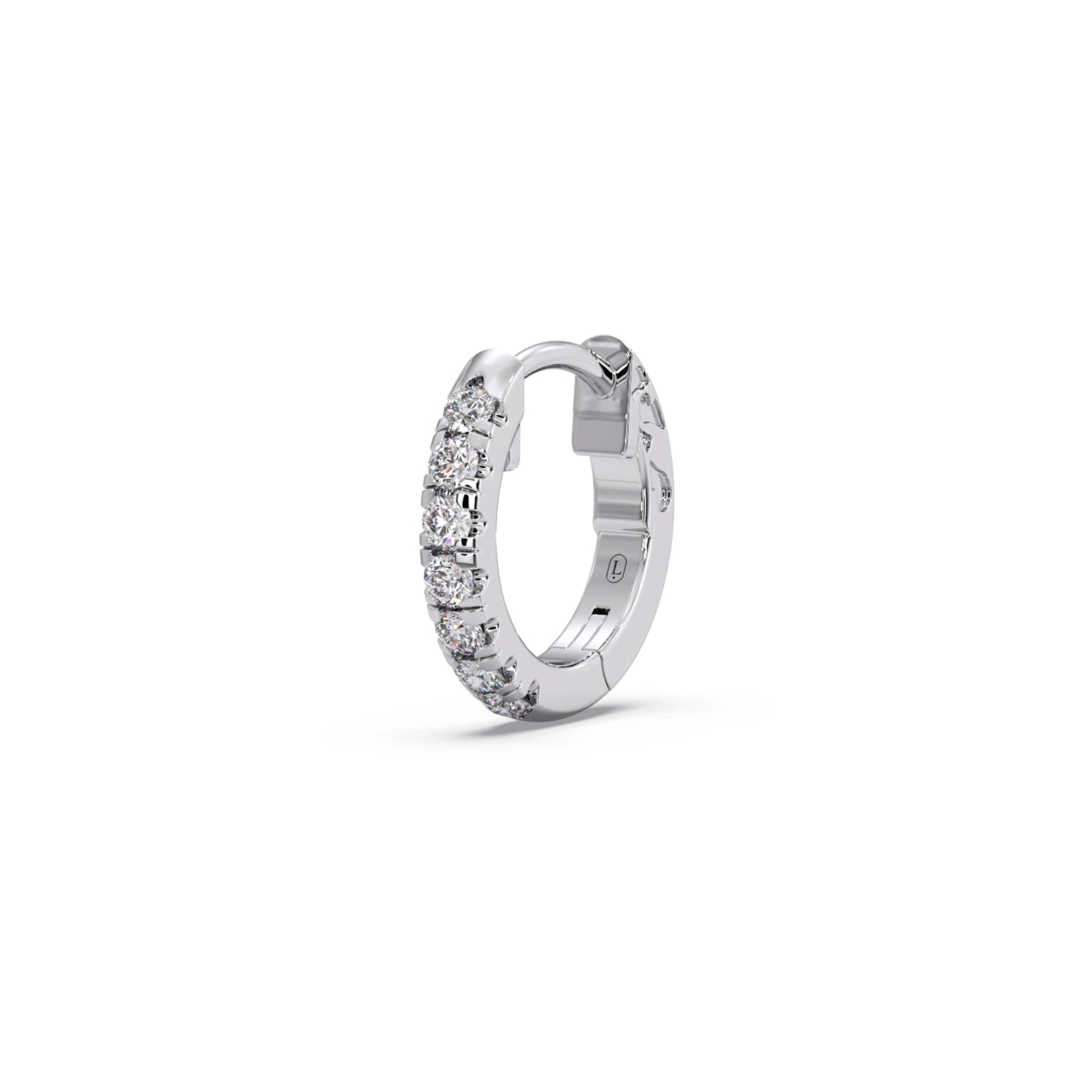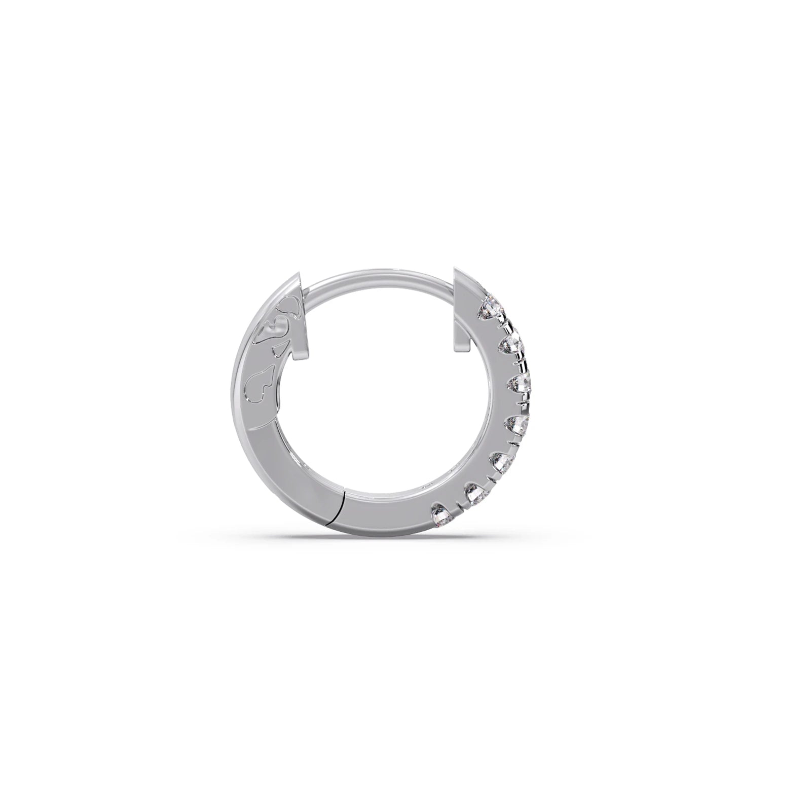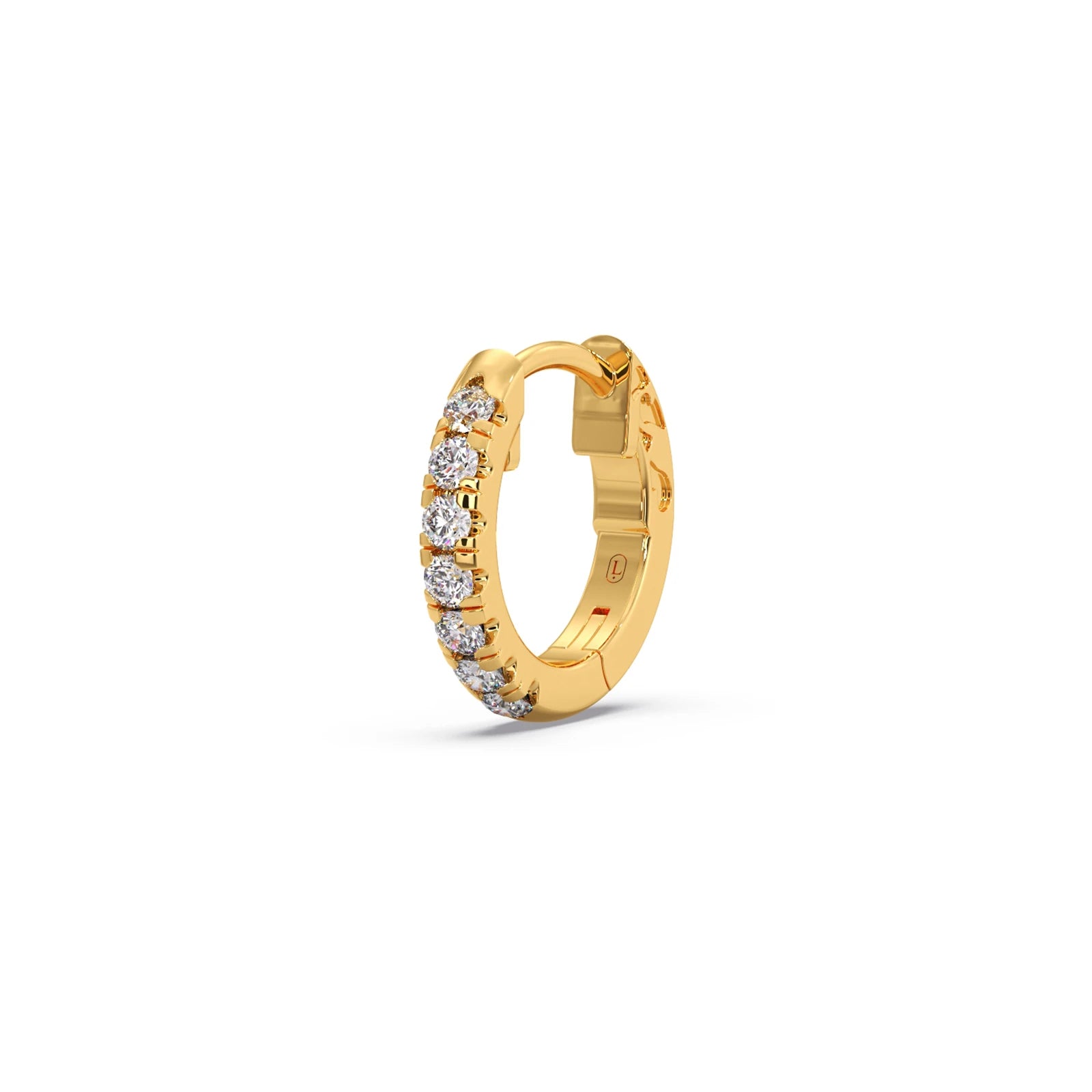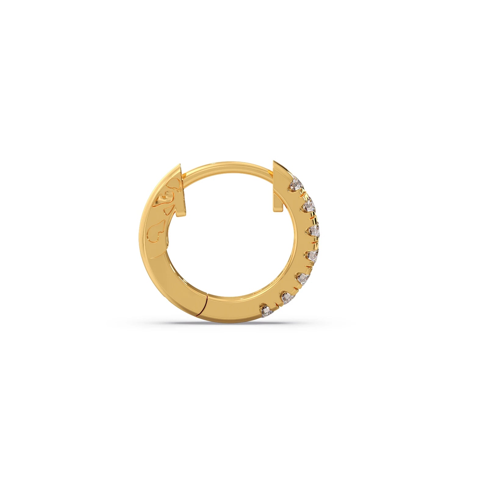 A pair of elegant huggie hoop earrings with a sparkling row of diamonds. The earrings are set in a classic rose gold setting.