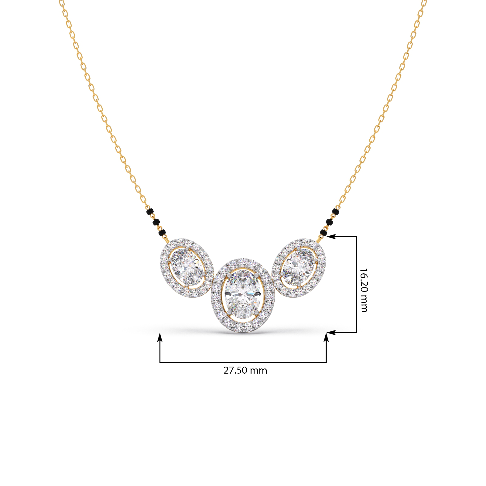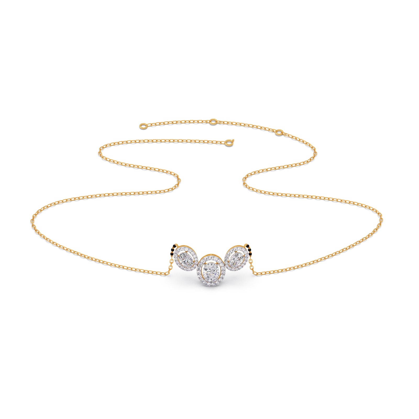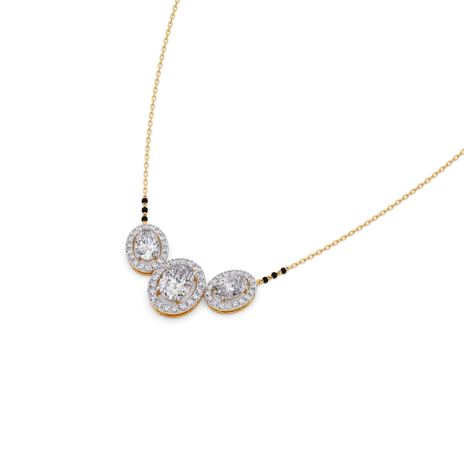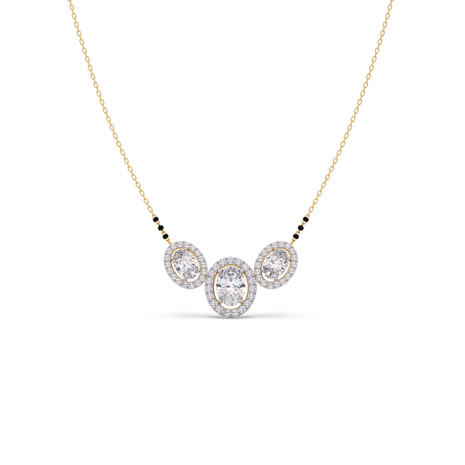 The Divine Trio Oval Halo Diamond Mangalsutra beautifully blends tradition and elegance. Three oval diamonds, framed by halos, shine on a gold chain with classic black beads symbolizing protection and eternal love. Perfect for the modern bride.