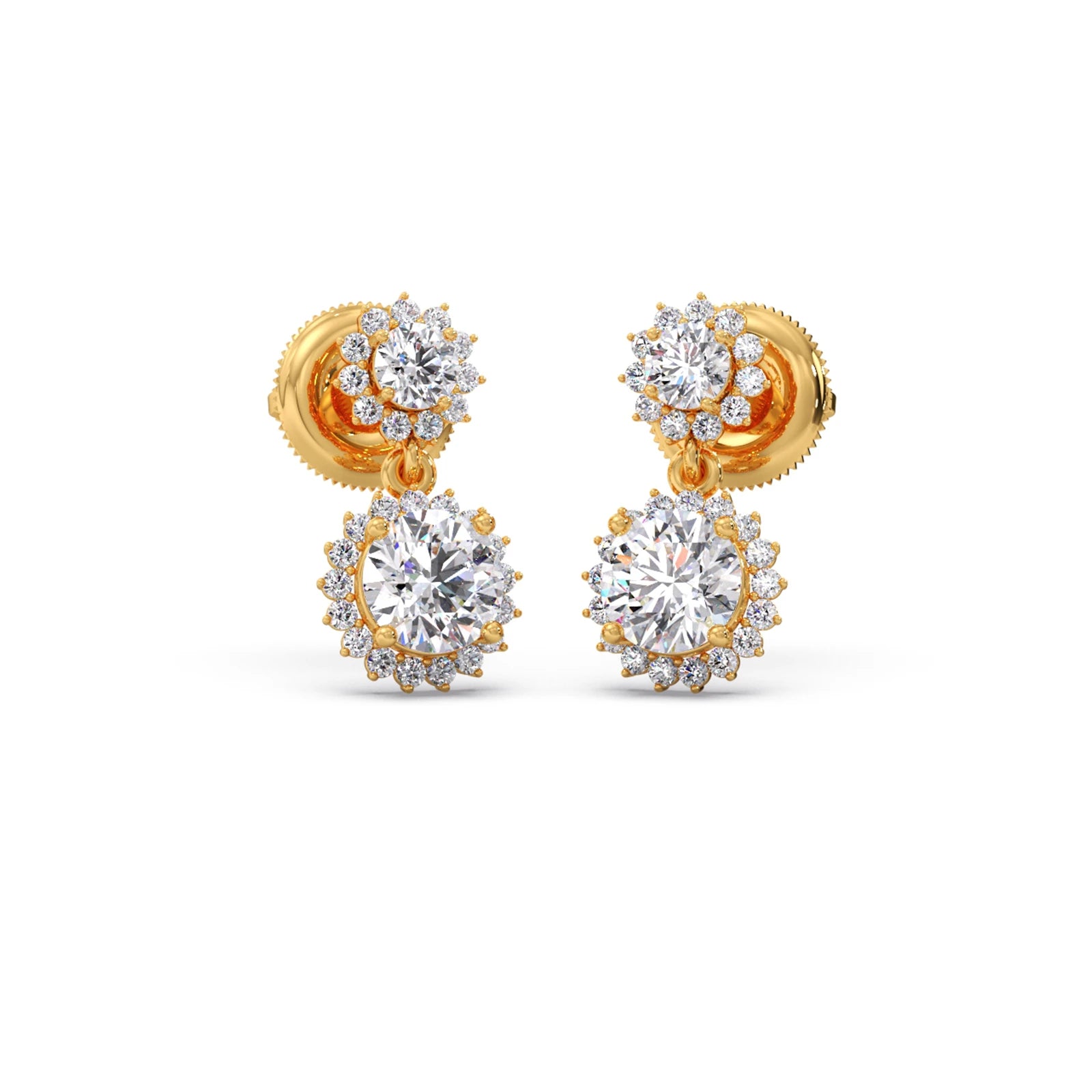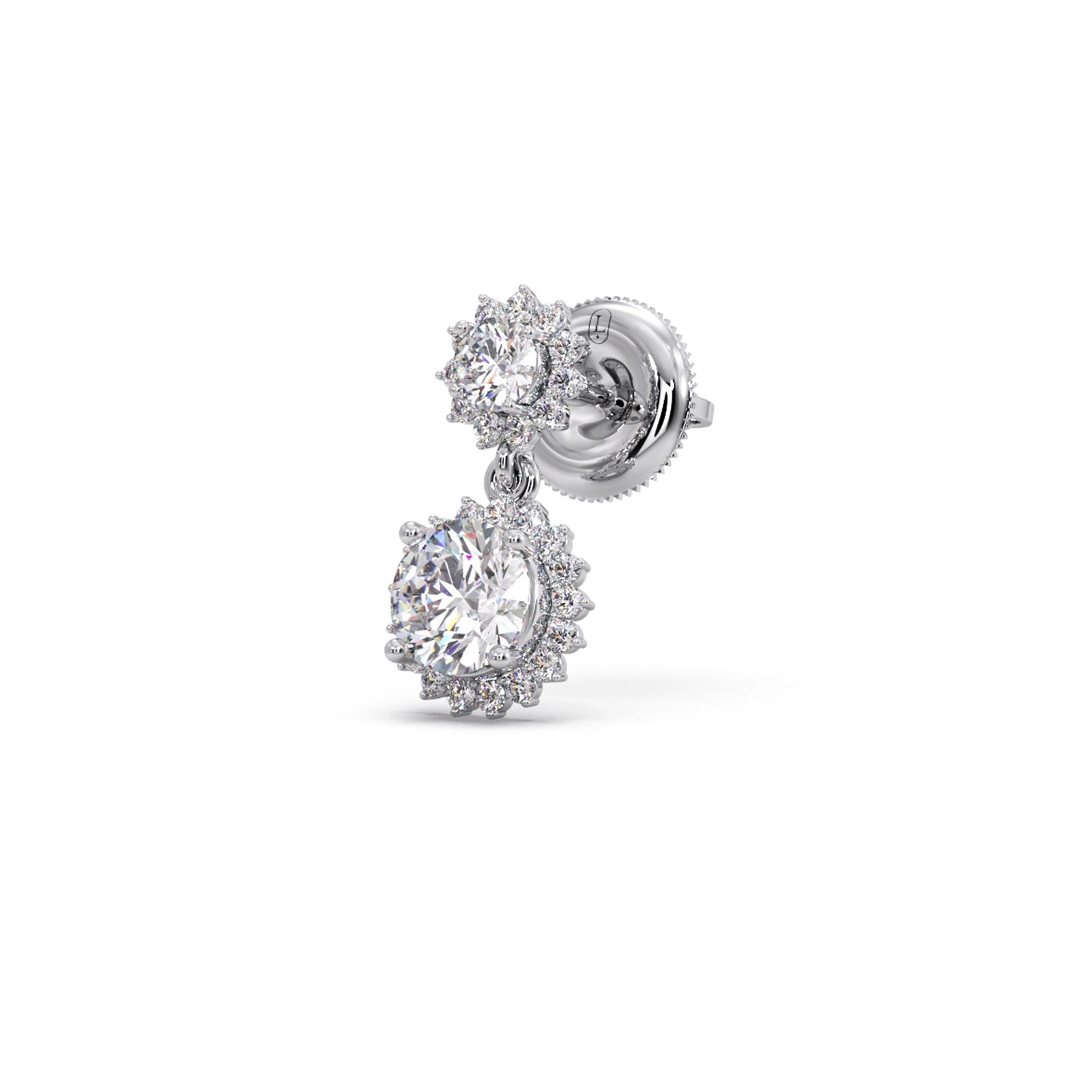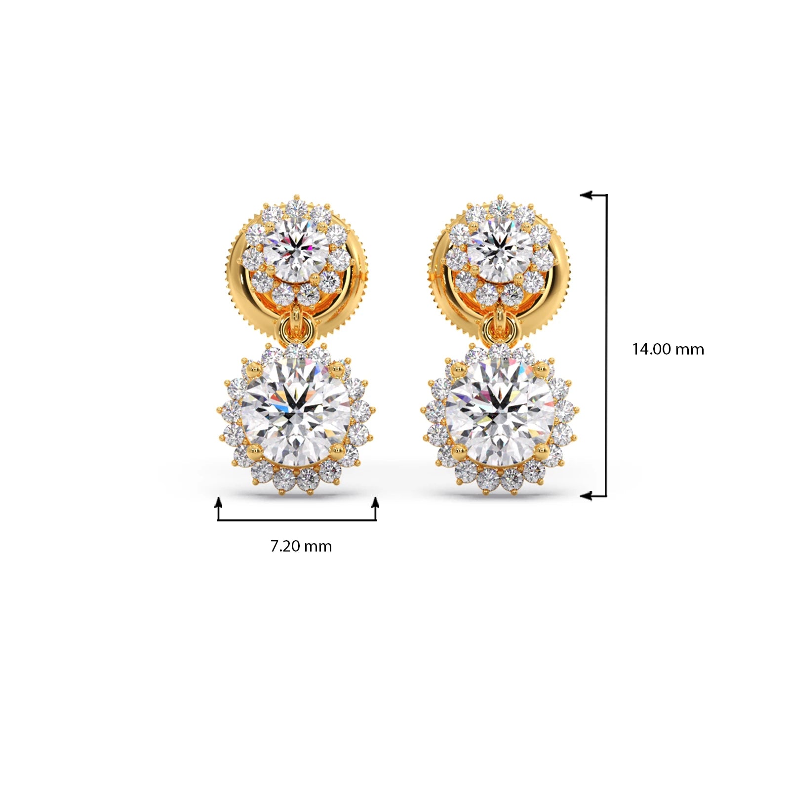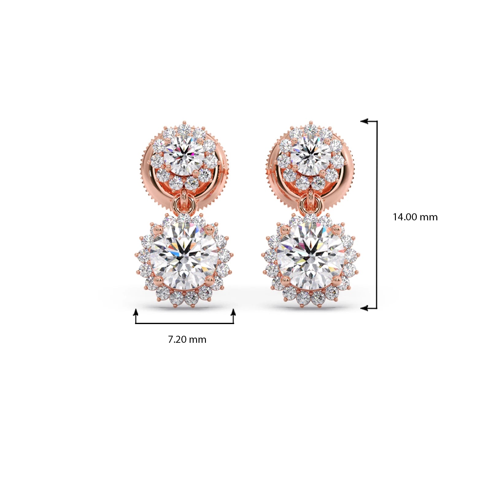 A pair of elegant drop earrings featuring two round center stones, each surrounded by a sparkling halo of smaller diamonds. The earrings are set in a classic rose gold setting.