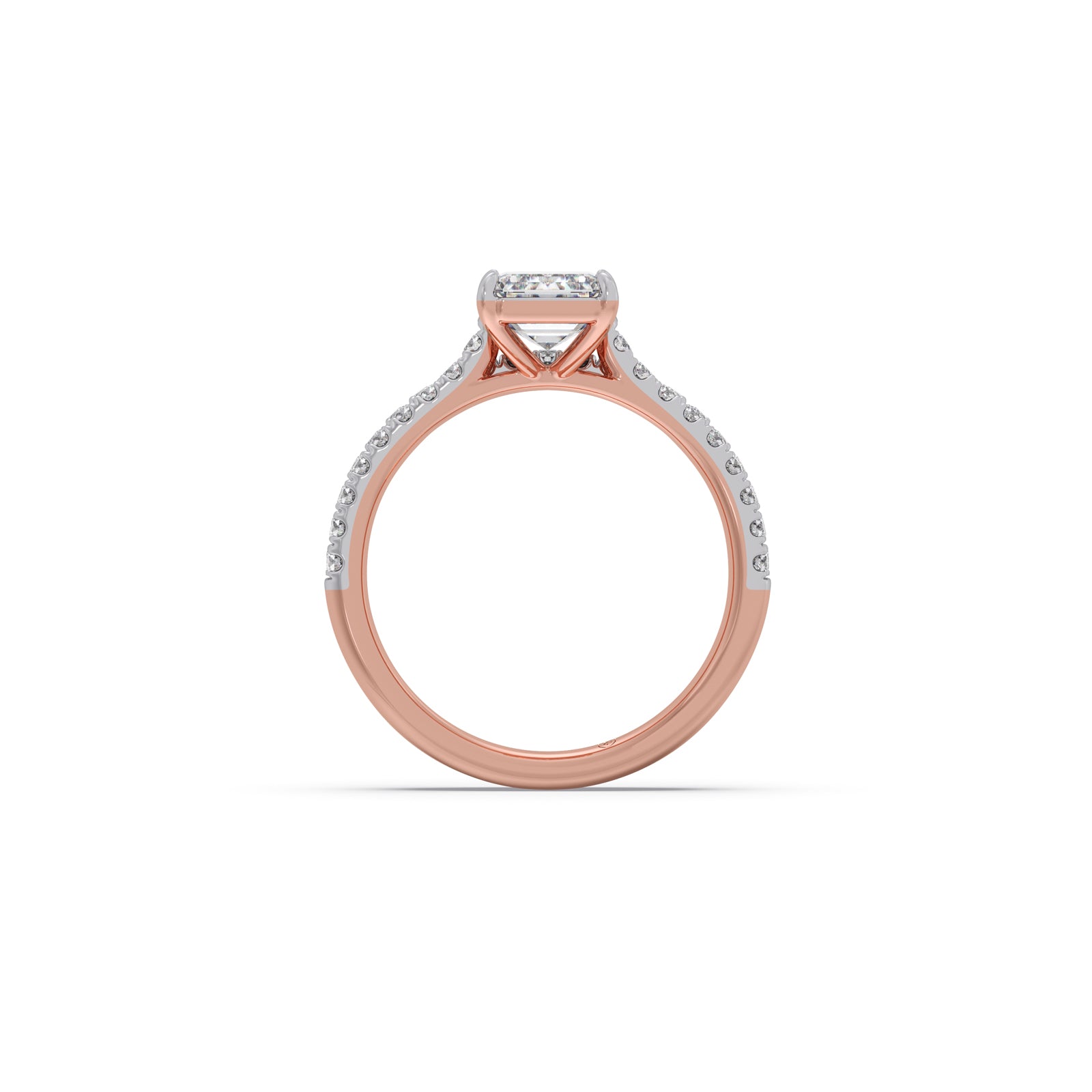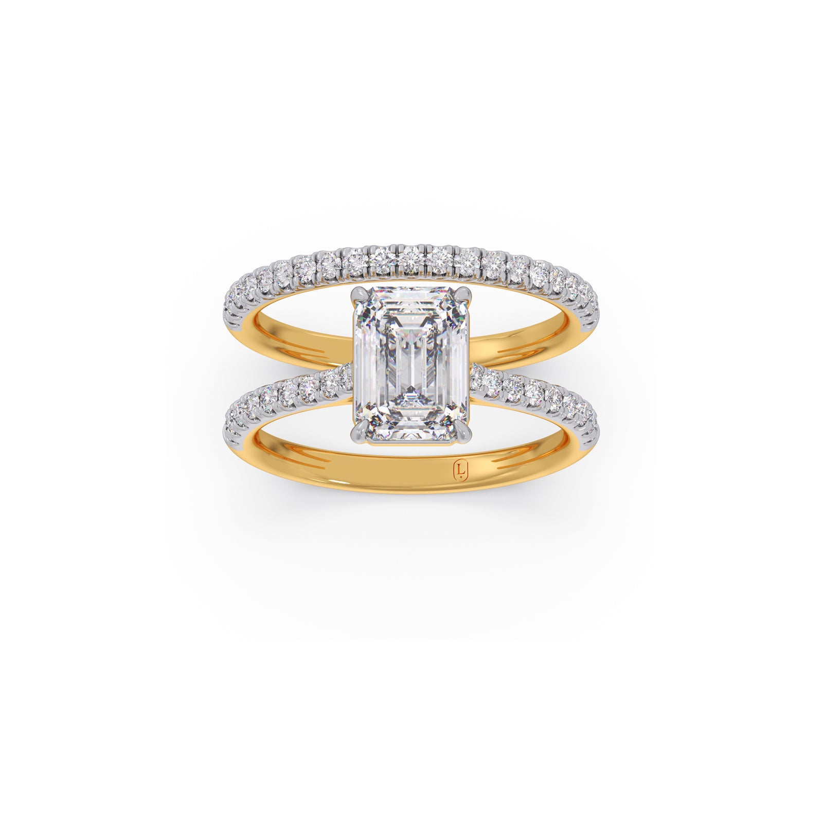Dual Harmony Solitaire Diamond Ring,featuring a stunning emerald-cut center diamond set above twin pavé bands. Crafted in rich Yellow gold with shimmering white-gold diamond accents, this design blends timeless elegance with modern sophistication.