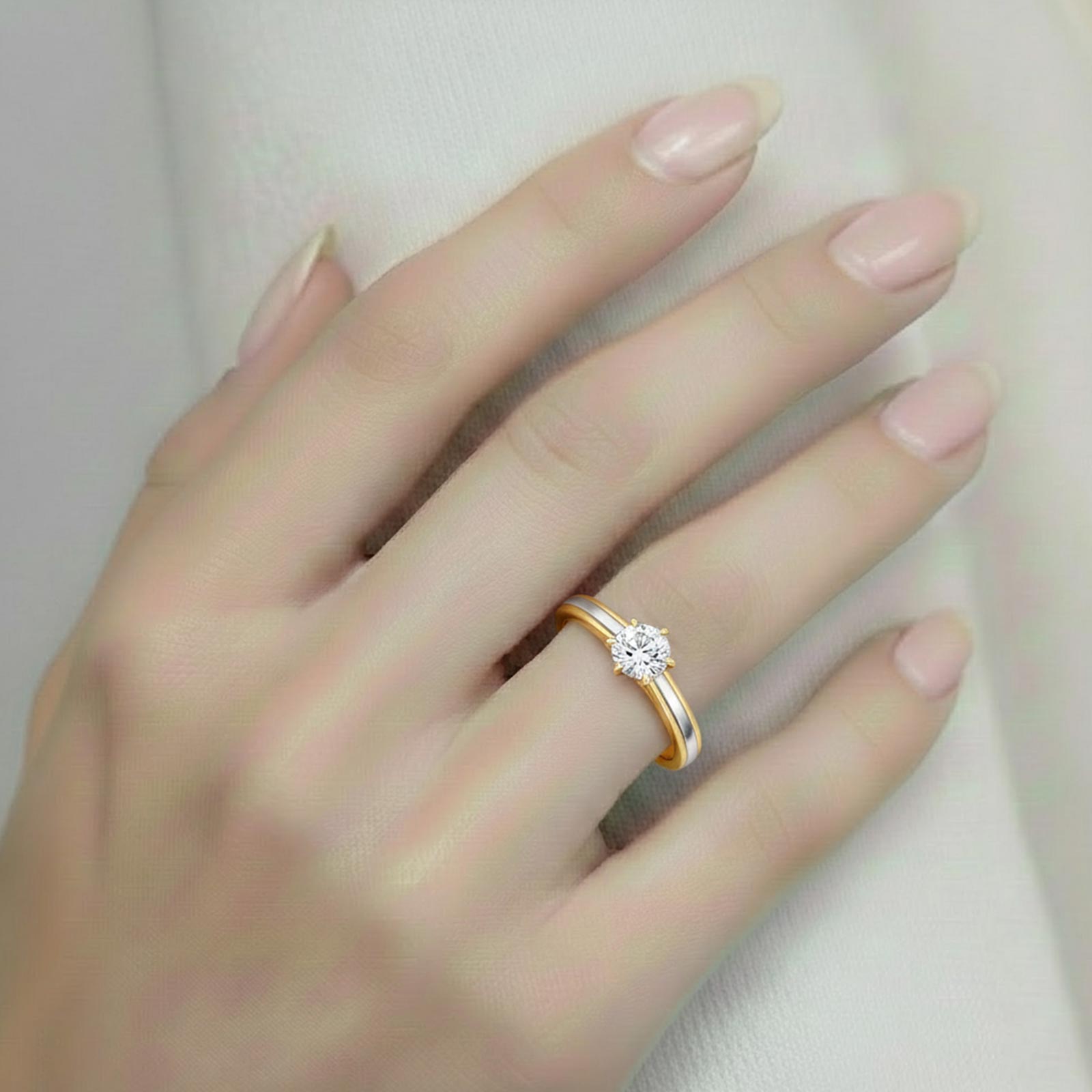 This Dual-Tone Round Solitaire Engagement Ring features a dazzling round-cut diamond set in a sophisticated dual-tone gold band. The fusion of yellow and white gold adds a touch of elegance, while the classic solitaire setting enhances its brilliance. A perfect blend of luxury and style, ideal for any special occasion