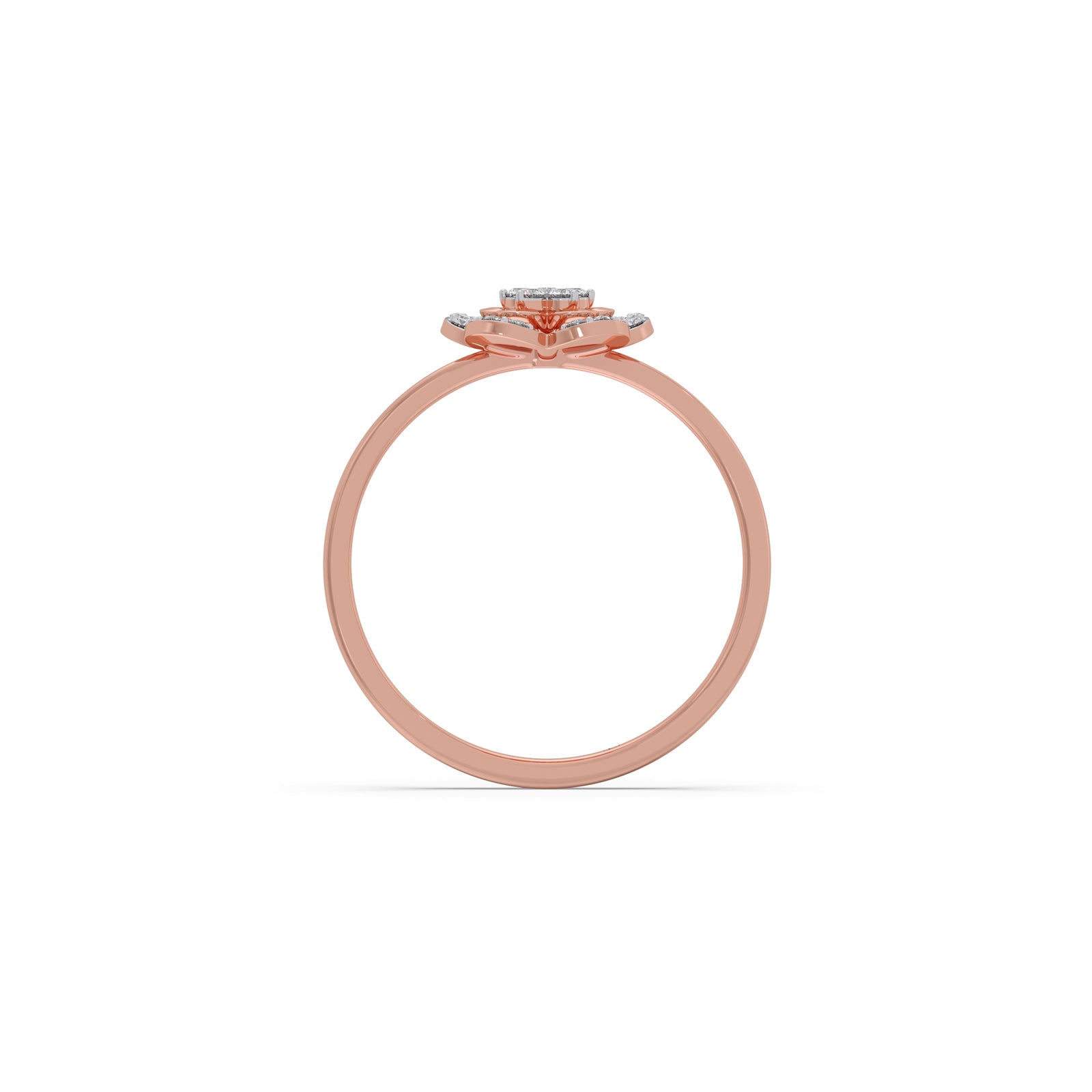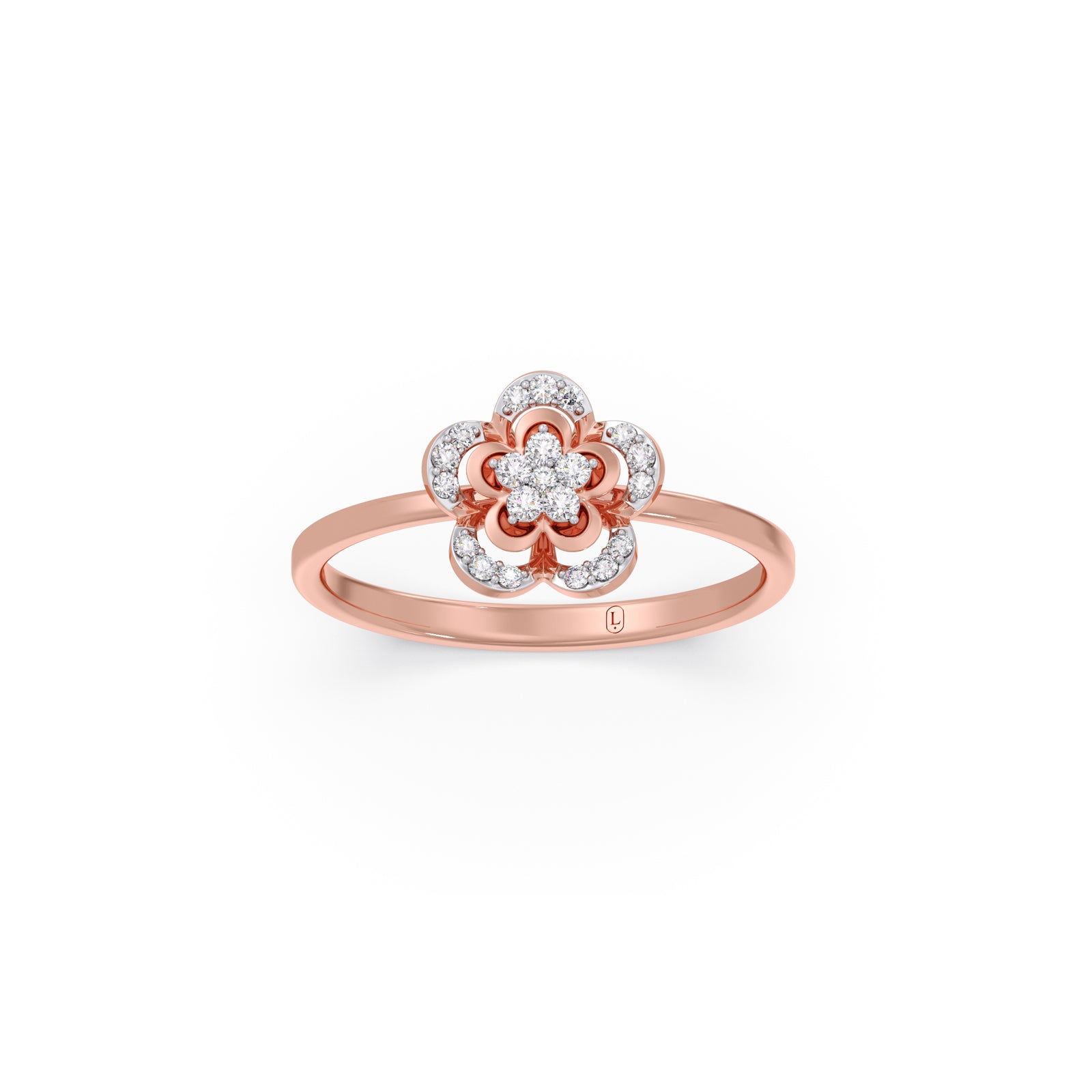 This elegant ring features a stylized flower shaped head densely set with cluster round diamonds, surrounded by outer halo frame of classic round diamonds. This ring is ideal for any occasions wear or everyday wear.