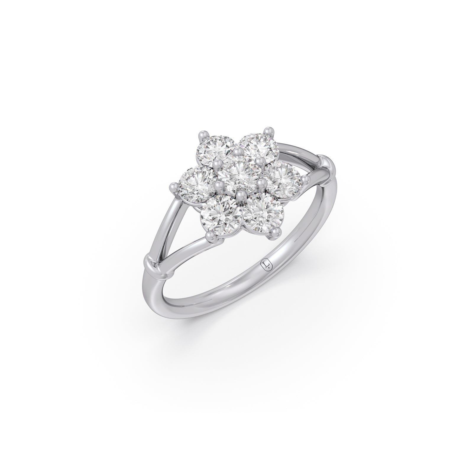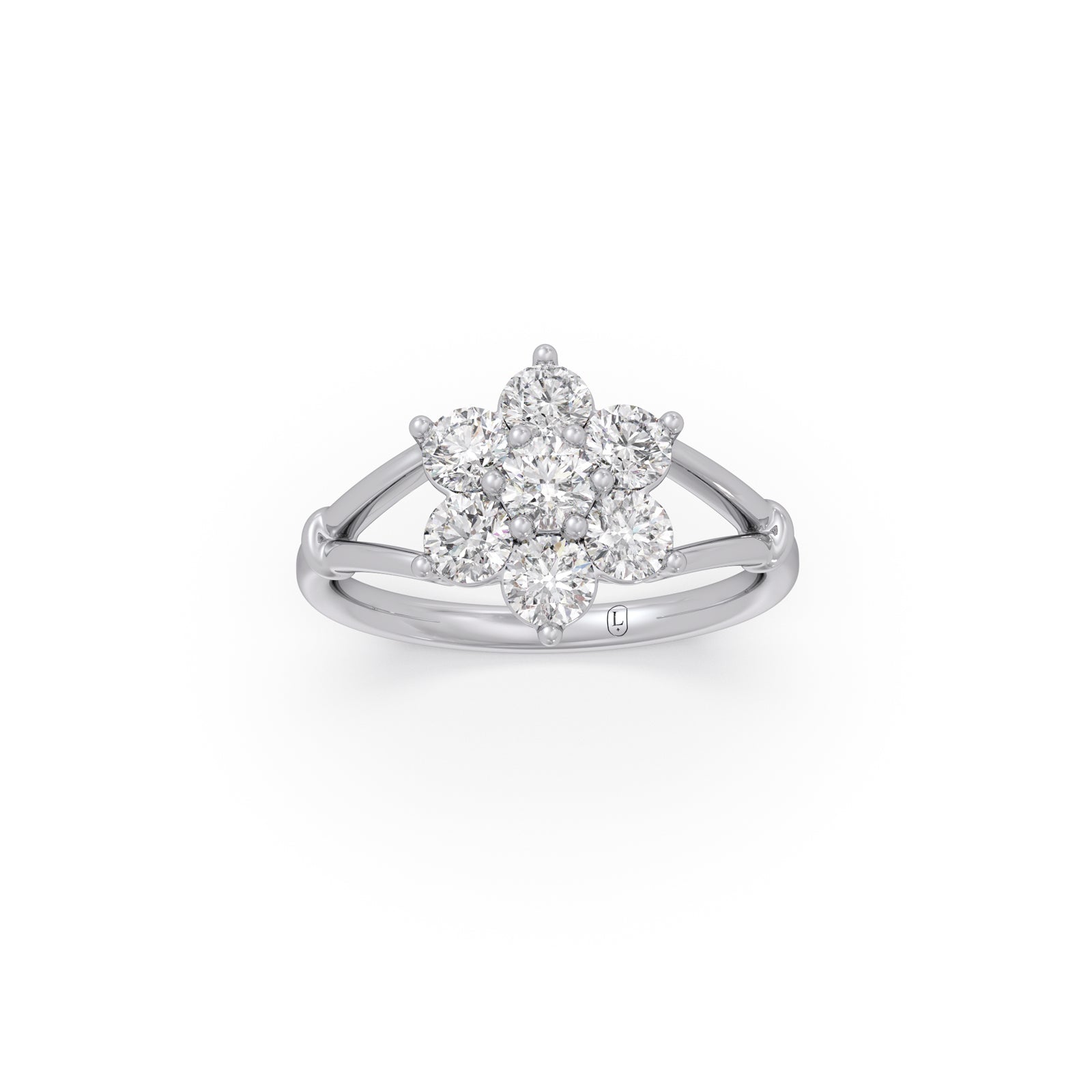 This exquisite design features a central cluster of diamonds that blossoms outward, mimicking the delicate petals of a flower. The surrounding brilliant-cut diamonds enhance its radiant, expansive sparkle, creating a look of luxurious volume and timeless, feminine grace. A true symbol of growth and lasting beauty.