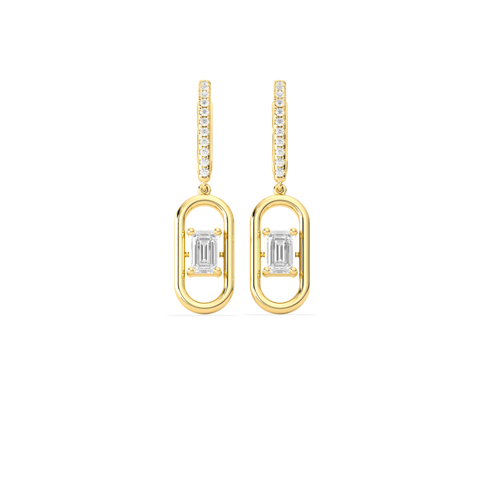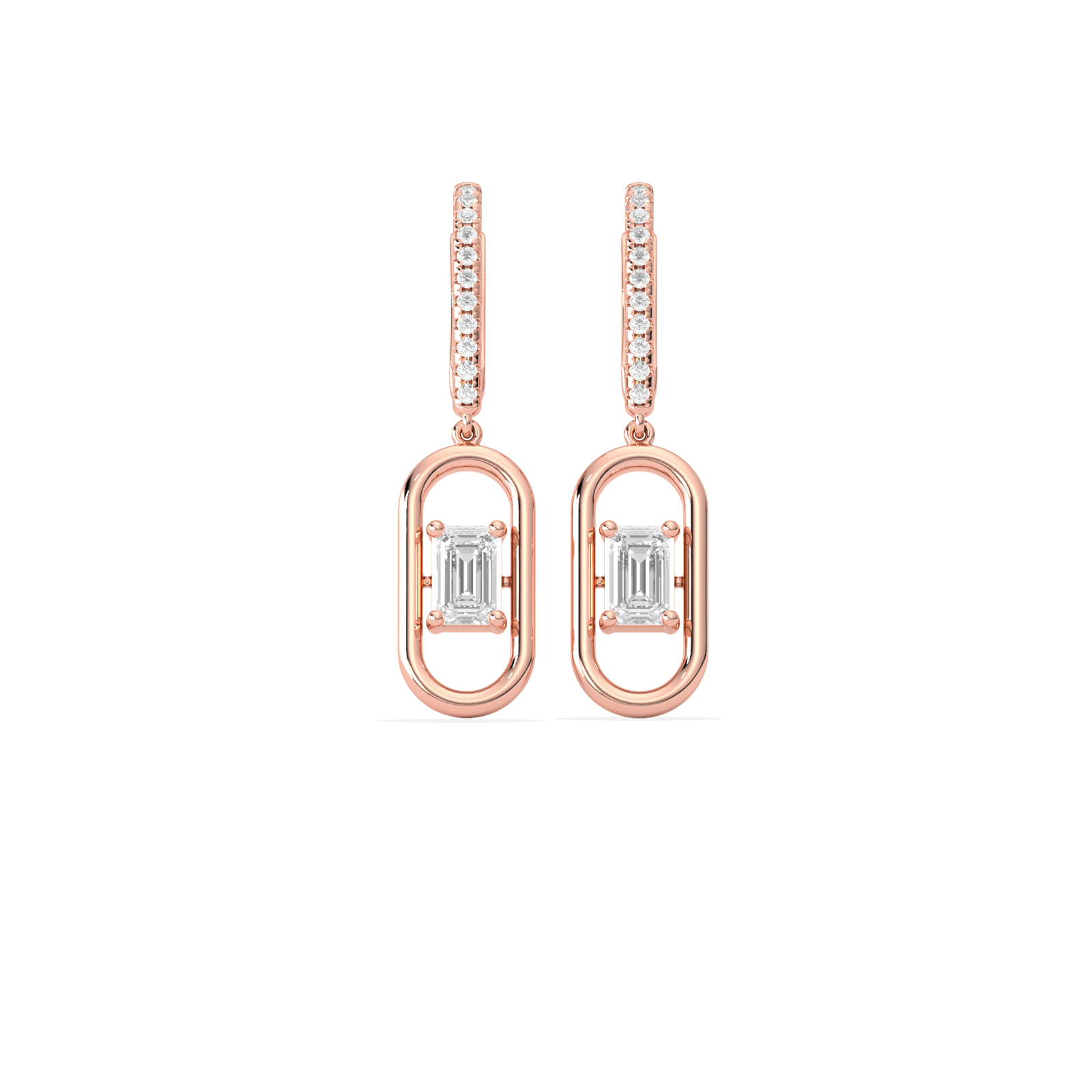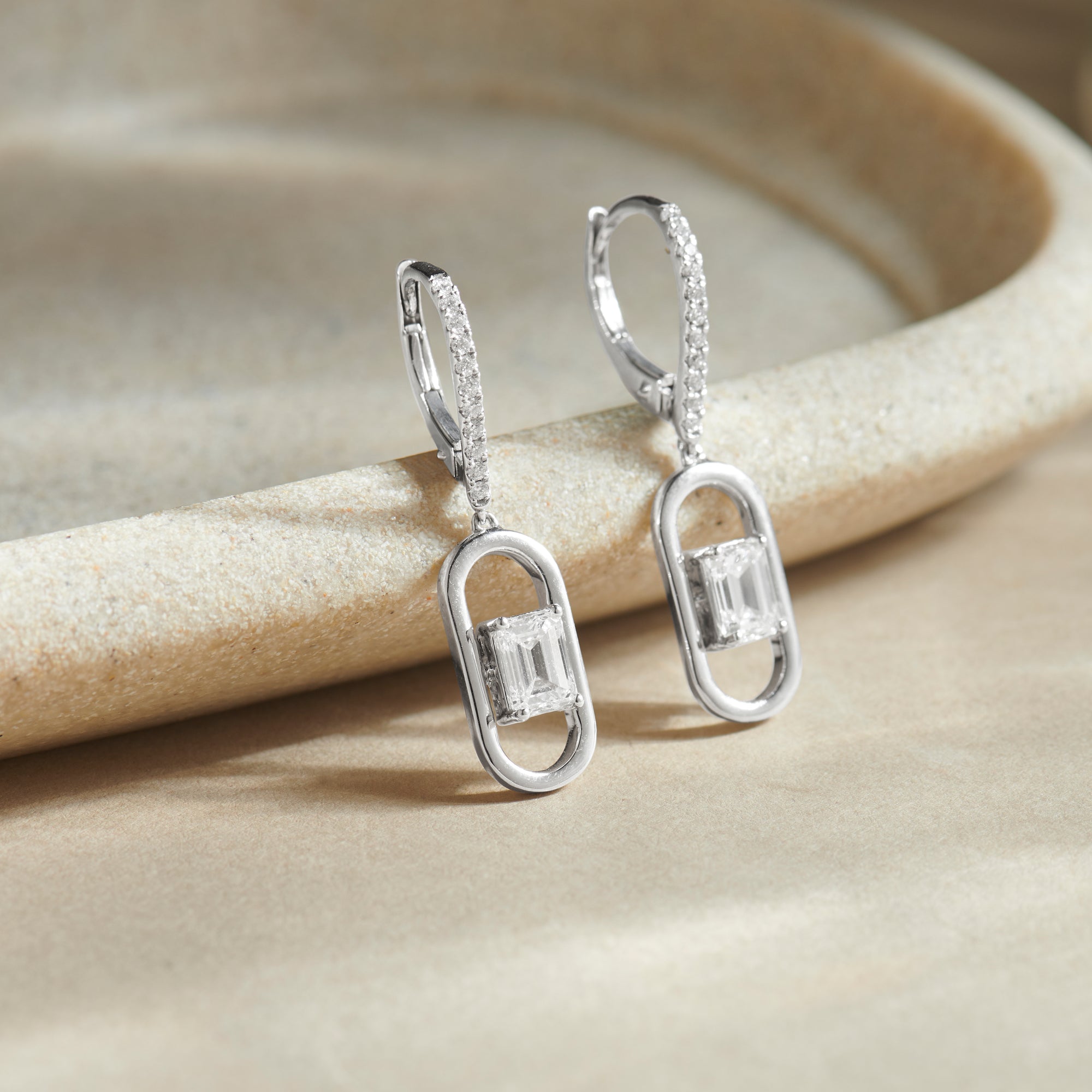 These sophisticated earrings feature stunning emerald-cut diamonds suspended in a graceful drop design. The clean lines and step-cut facets of the diamonds exude timeless elegance and subtle sparkle, perfect for adding a touch of refined glamour to any occasion.