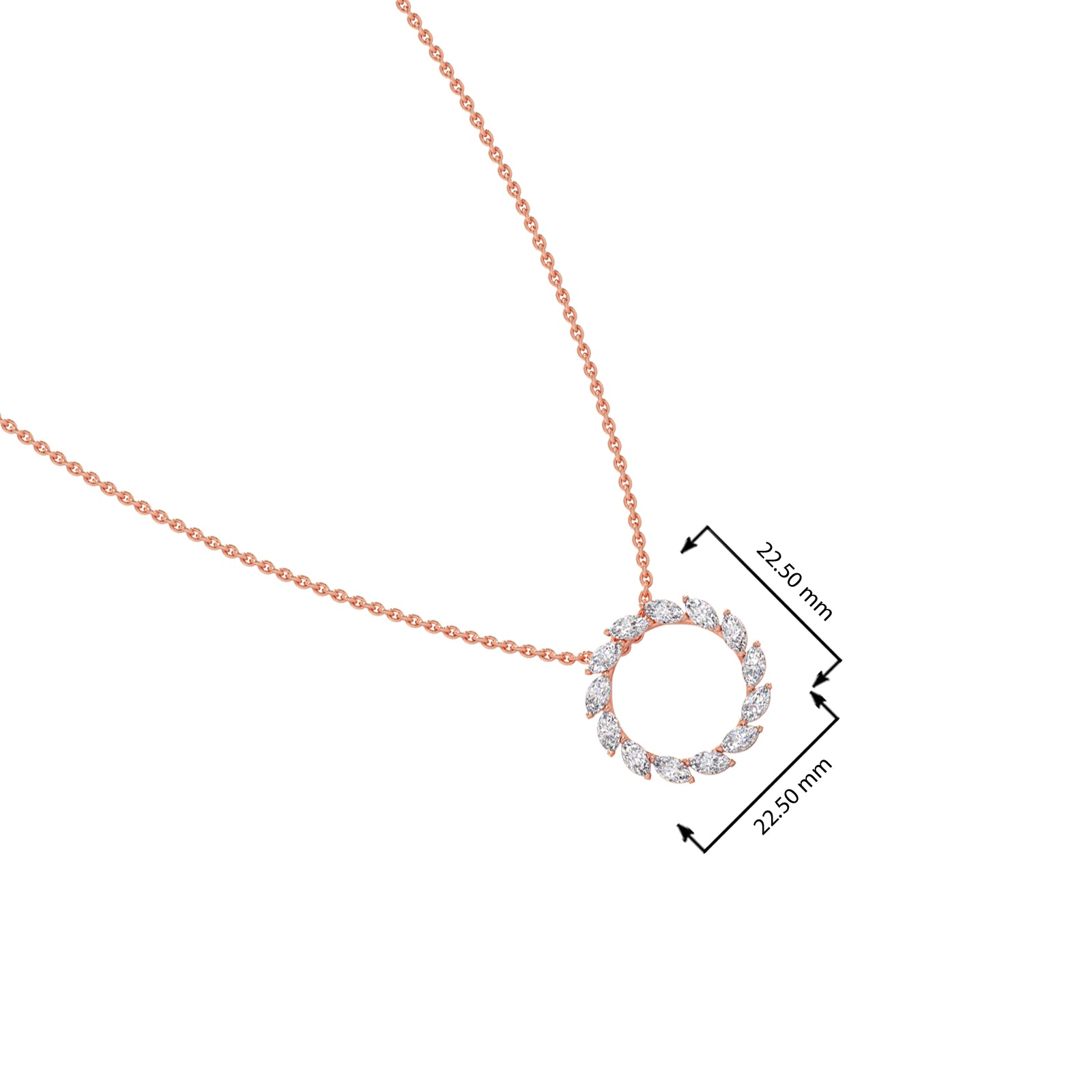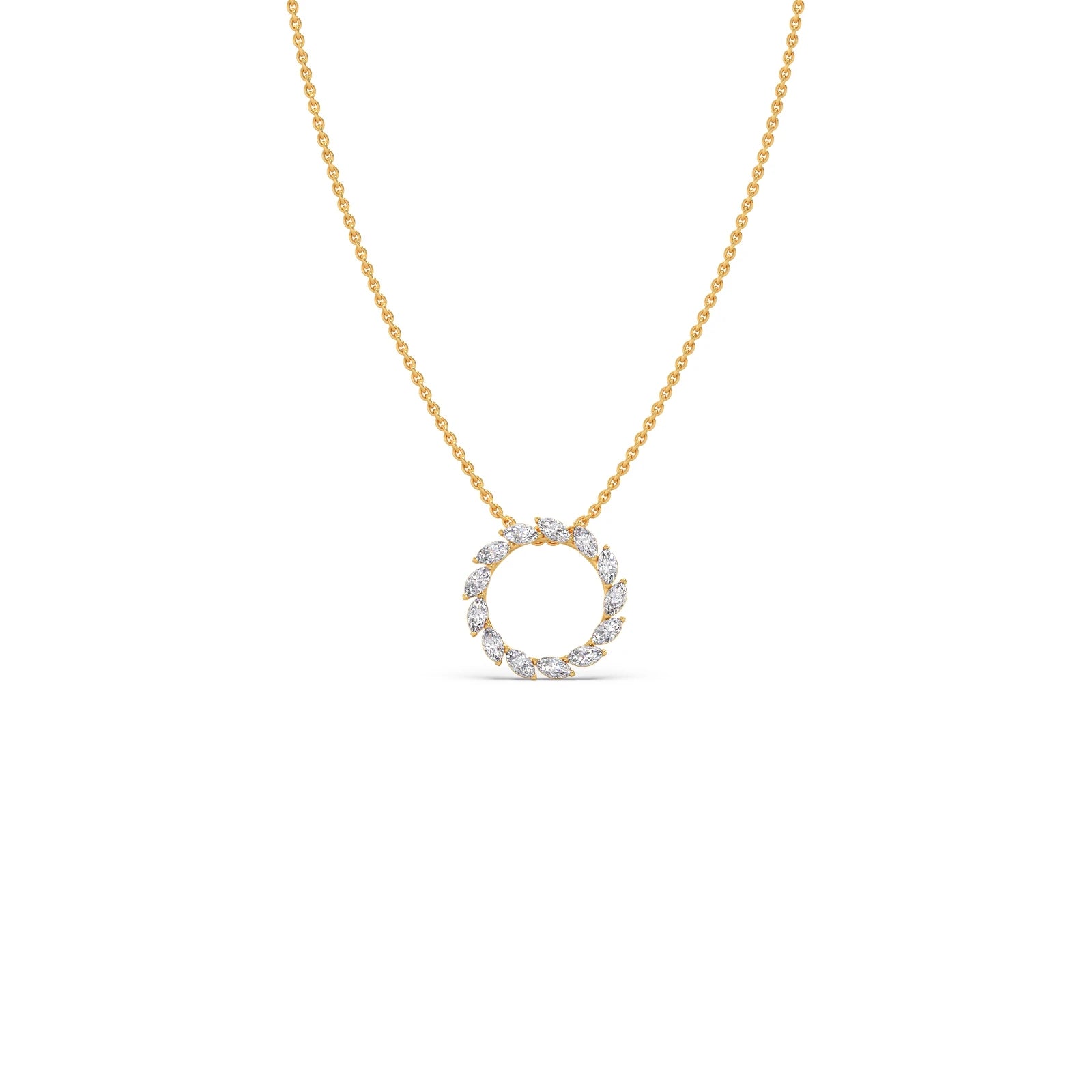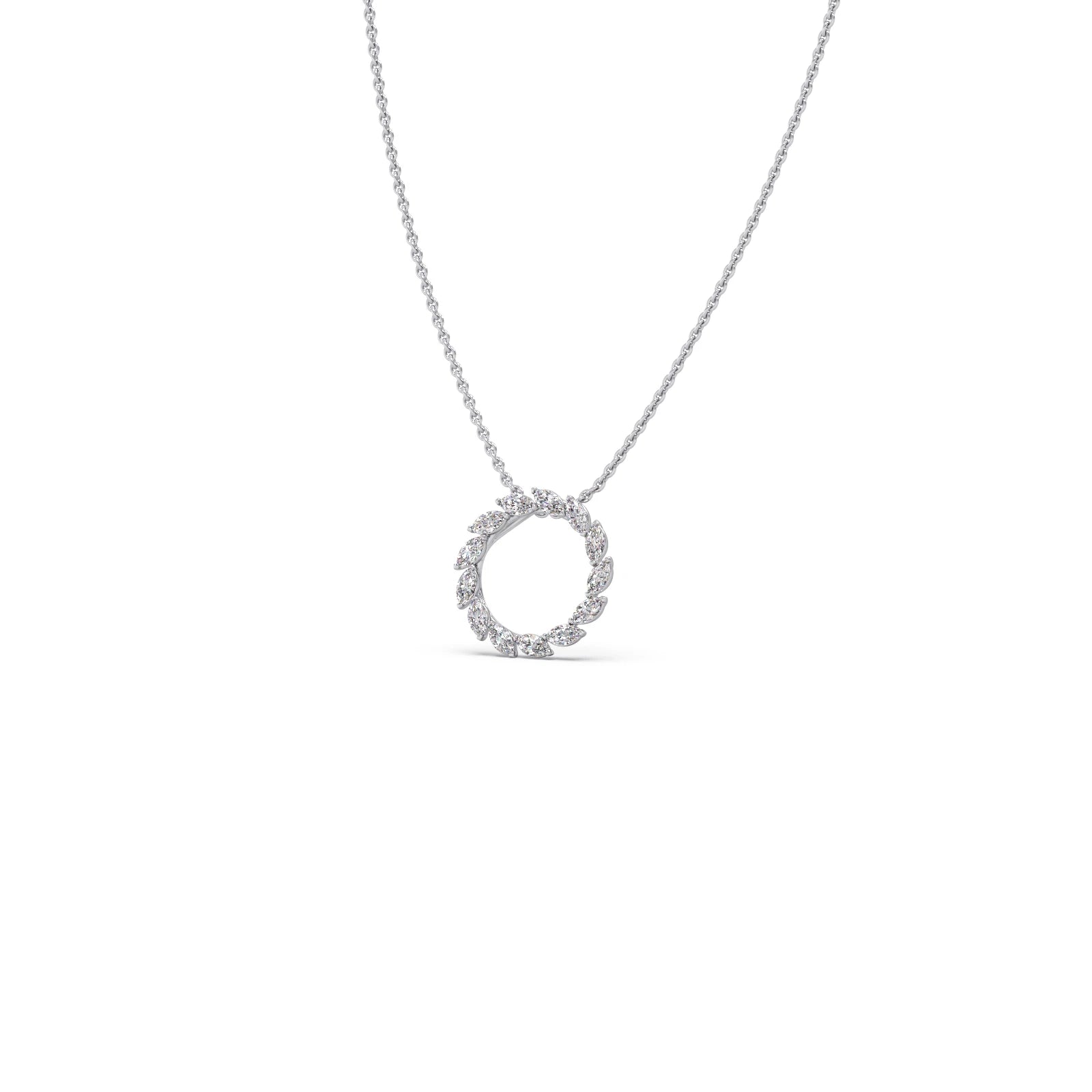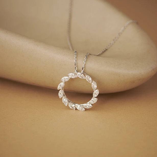 This pendant features a captivating circular design, crafted from a continuous arrangement of marquise-shaped diamonds. The unique cut and setting create a dazzling halo effect. The pendant exudes elegance and sophistication, making it a statement piece for any occasion.