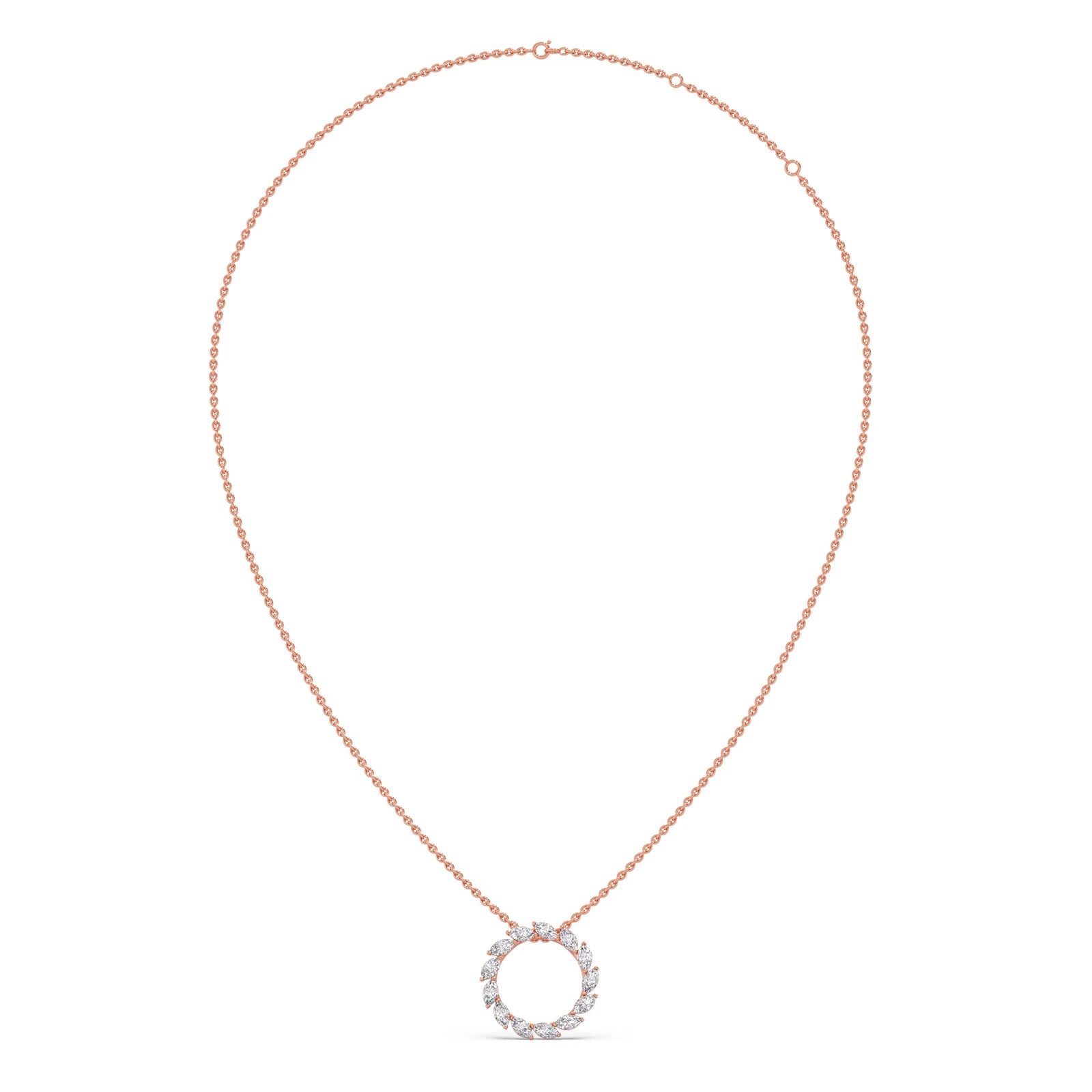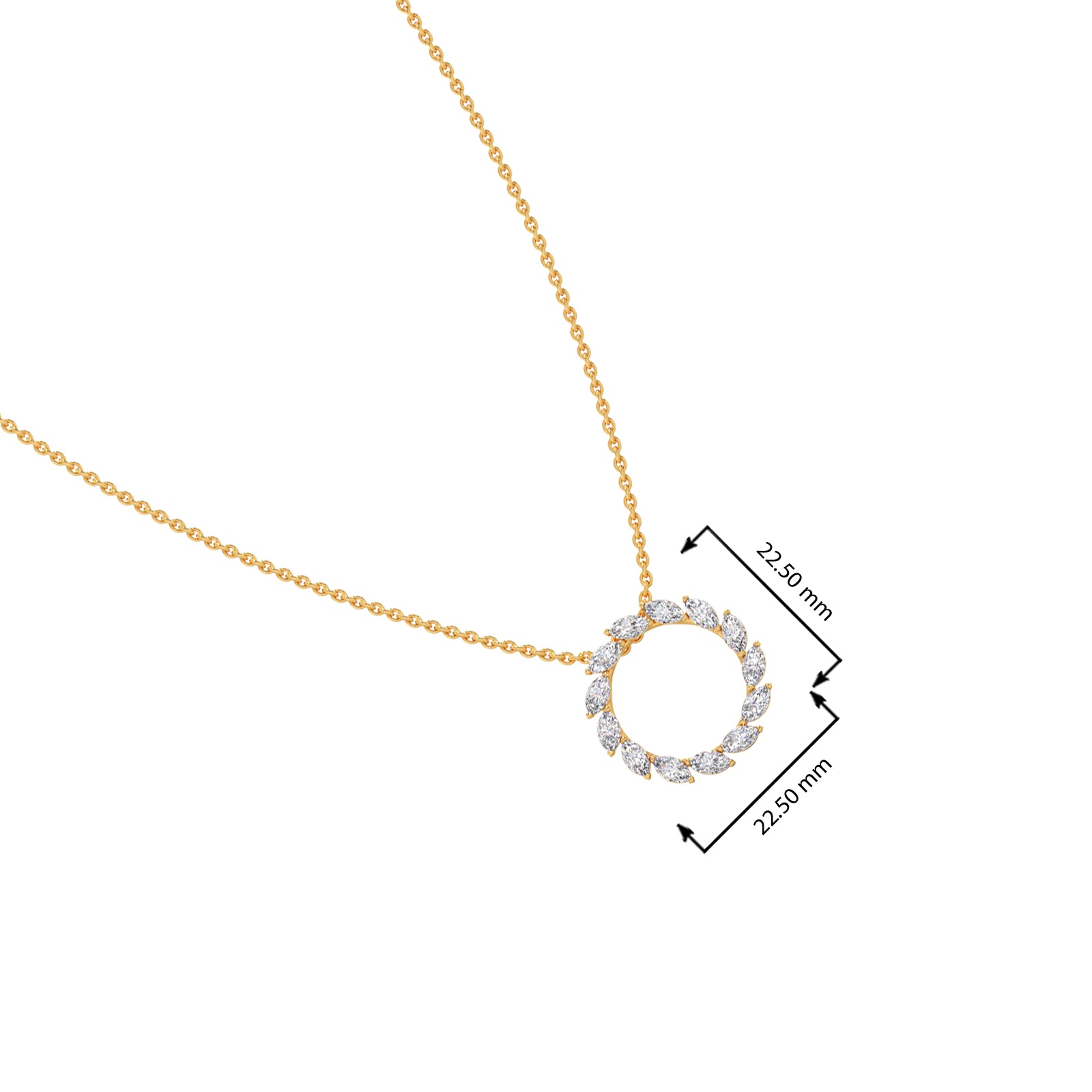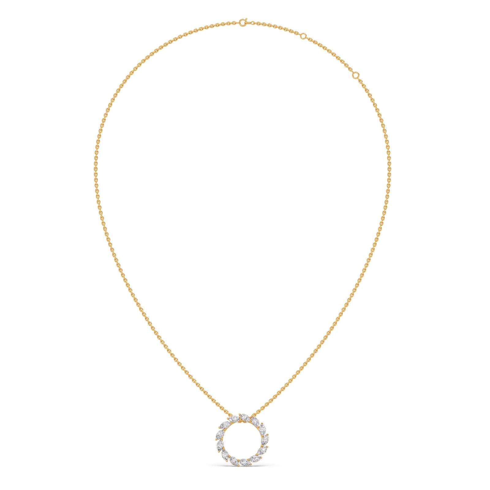 This pendant features a captivating circular design, crafted from a continuous arrangement of marquise-shaped diamonds. The unique cut and setting create a dazzling halo effect. The pendant exudes elegance and sophistication, making it a statement piece for any occasion.